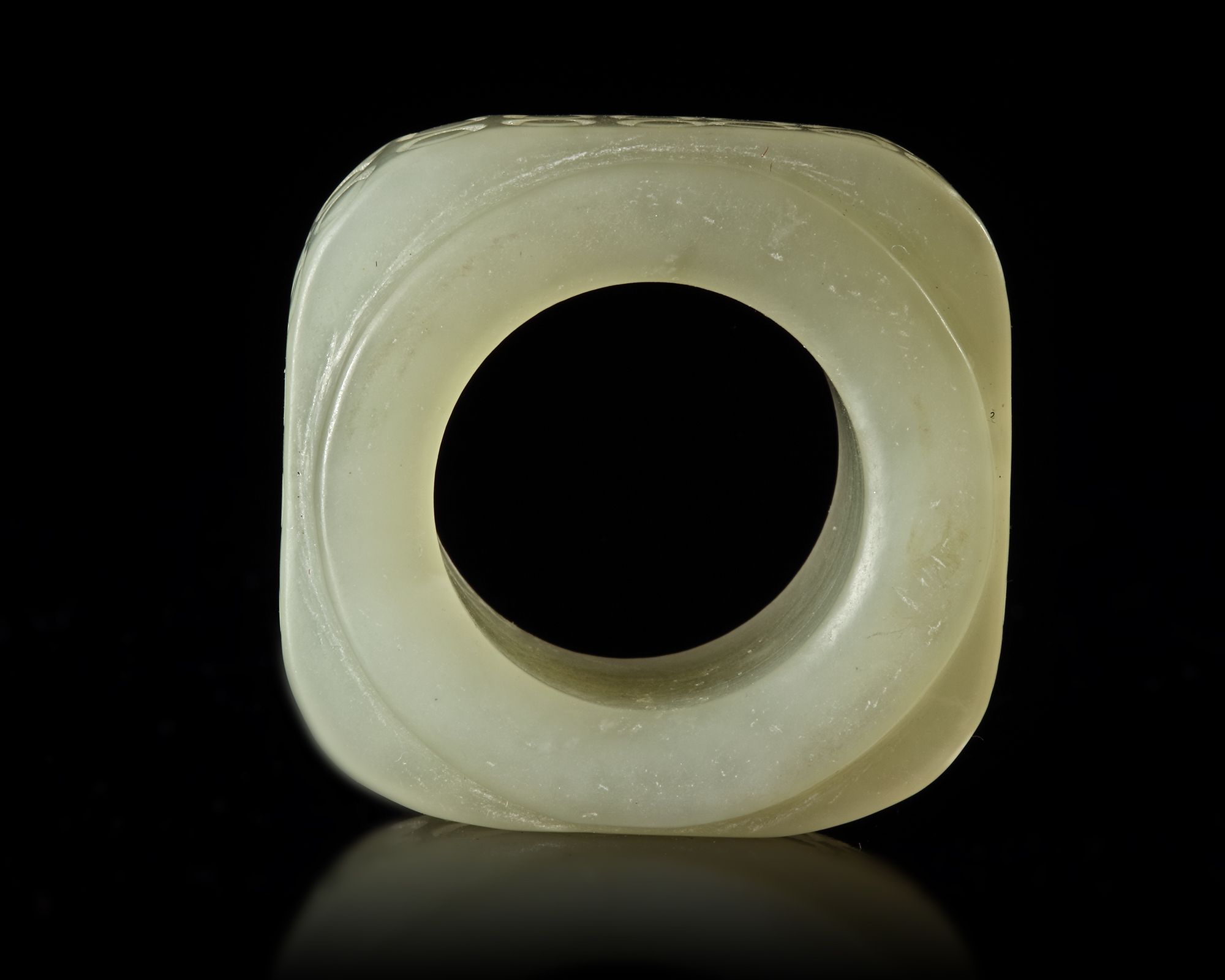 Flattened square section, carved with a cylindrical tube extending to either end, carved with two bands of dots. 3.9 by 3.9 cm.