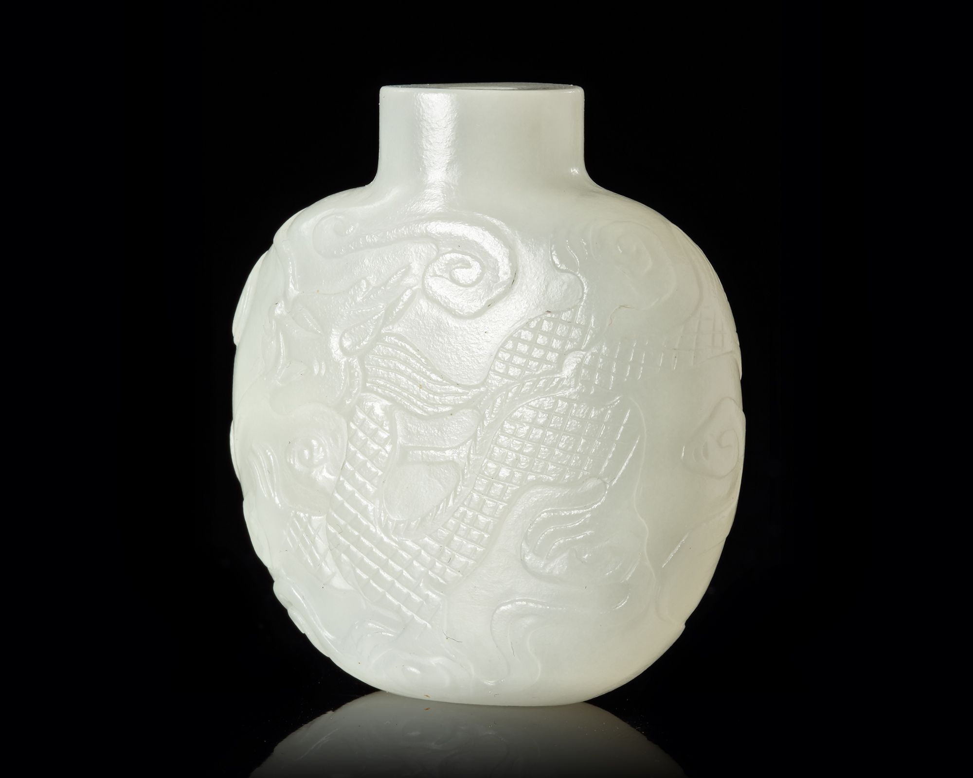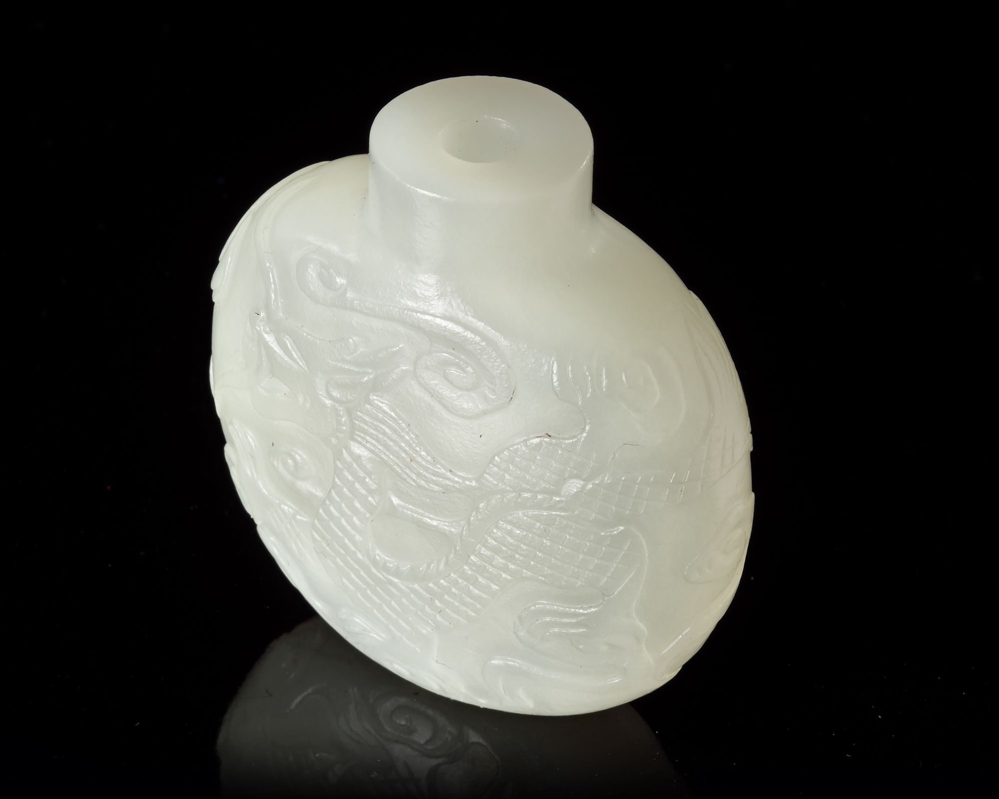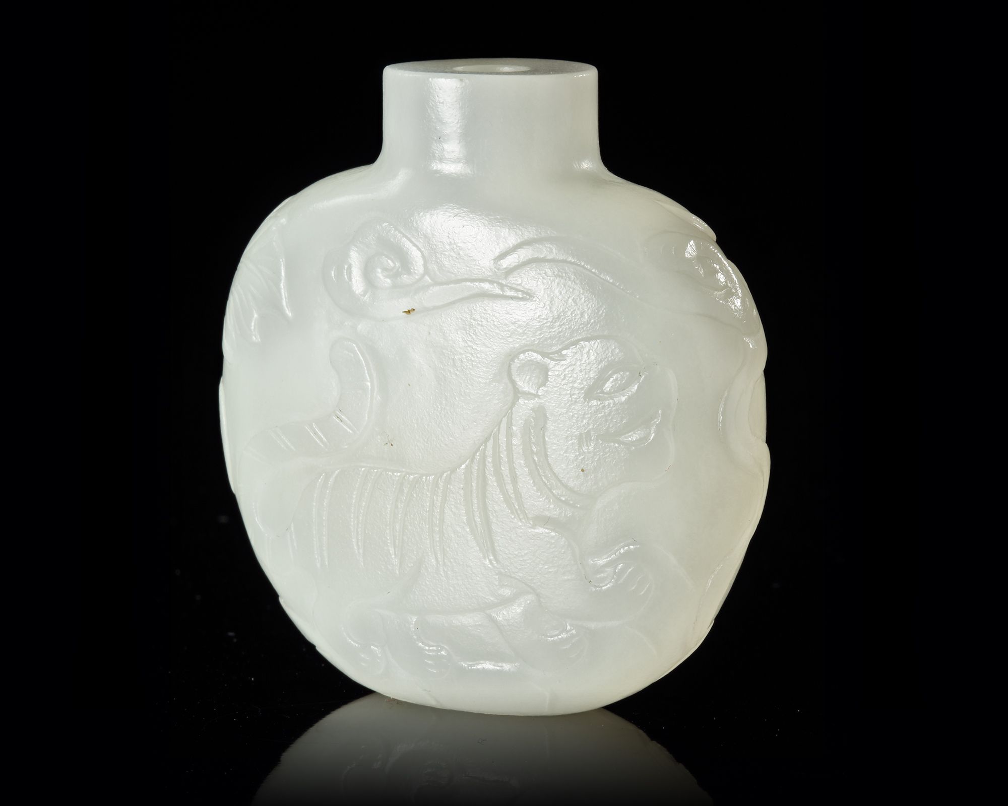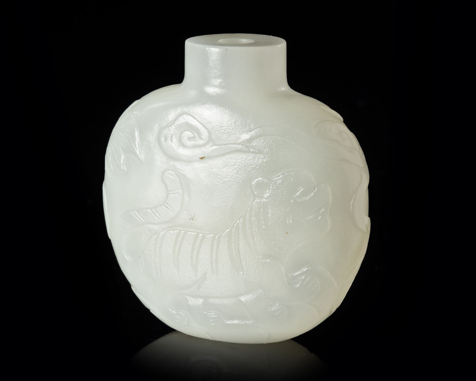 A Chinese jade snuff bottle carved on both sides with a three clawed dragon and a tiger amongst clouds. Height: 5.3 cm
