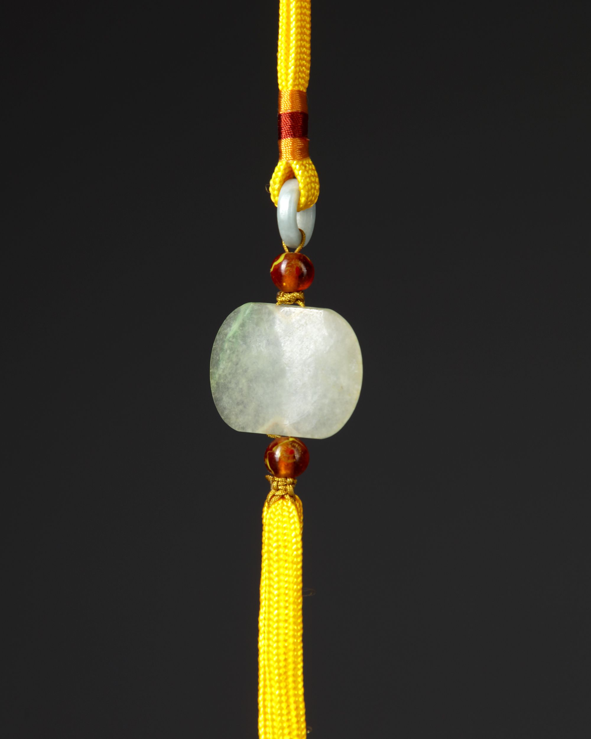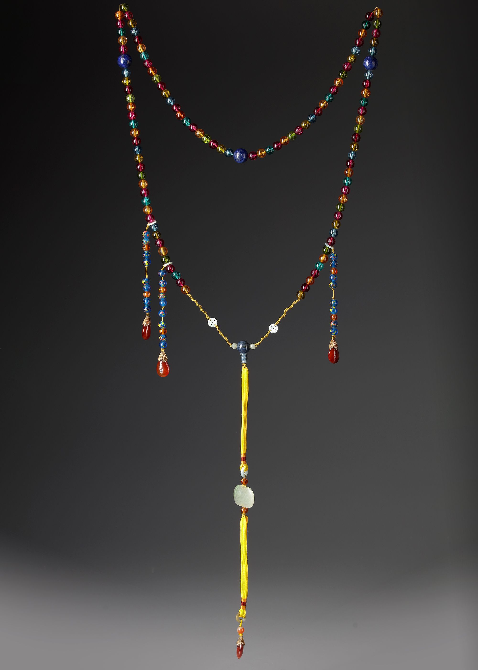 During the Qing dynasty, high-ranking civil and military officials wore necklaces of beads, which were standard uniform regalia. The beads were made of semiprecious stones and strung with silk ribbons. The rarity of the material and colors of the ribbons signified the ranks of the officials.