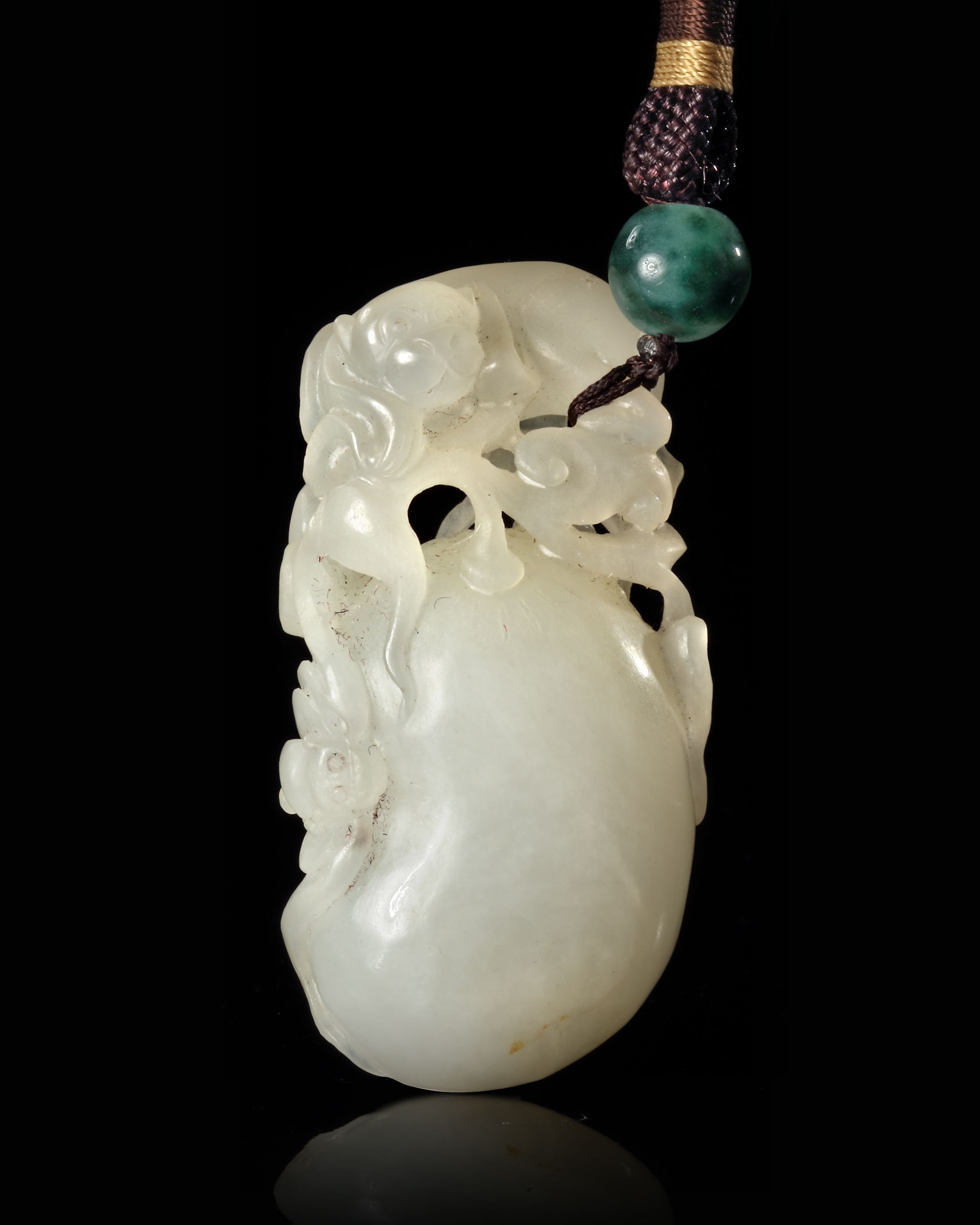 A Chinese jade fruiting branch carved with a Fu bat and mythical beast seated at top. Length: 7 cm.