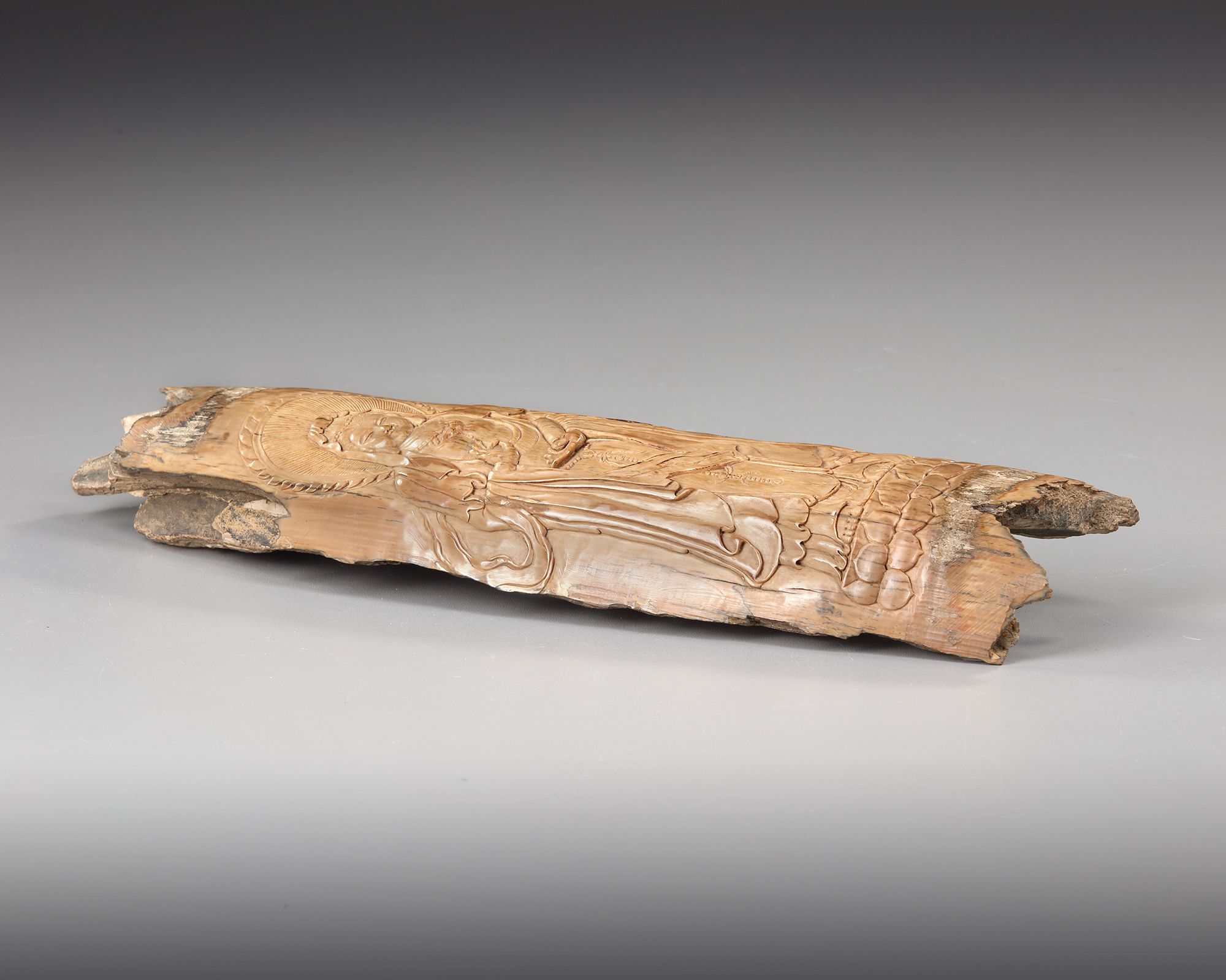 Carved with the figure of Avalokitesvara shown standing on a lotus base, with right hand raised in vitarka mudra, the left hand holding a scroll, wearing a jeweled necklace, a dhoti tied around the hips, a celestial scarf draped over the arms.