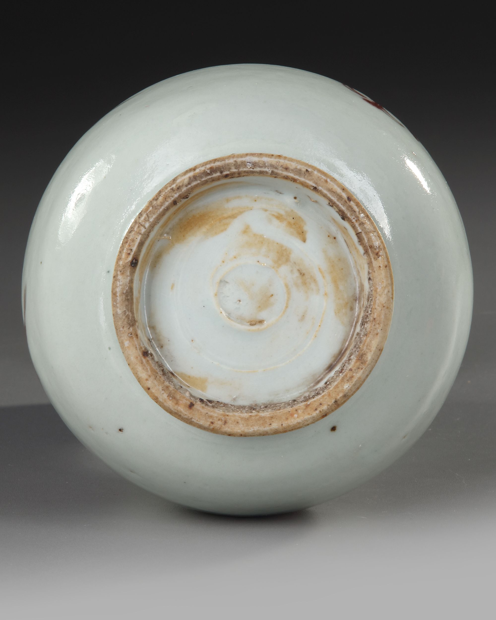 The full, pear-shaped body raised on a short, slightly spreading foot, rising to a slender neck and widely everted trumpet mouth, freely painted in vivid tones of copper-red with a powerful striding three-clawed dragon among flame scrolls in pursuit of a 'flaming pearl'.