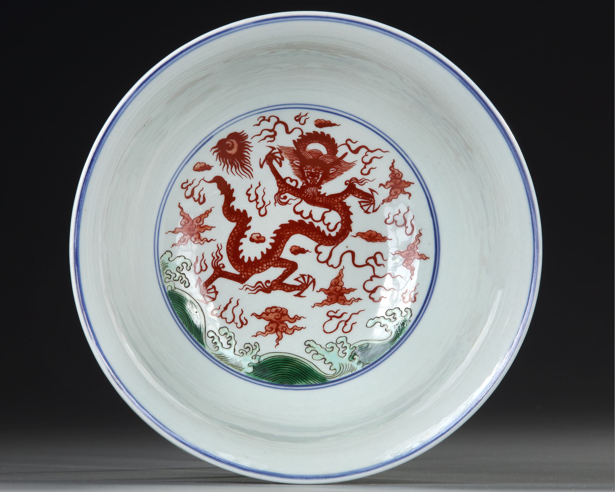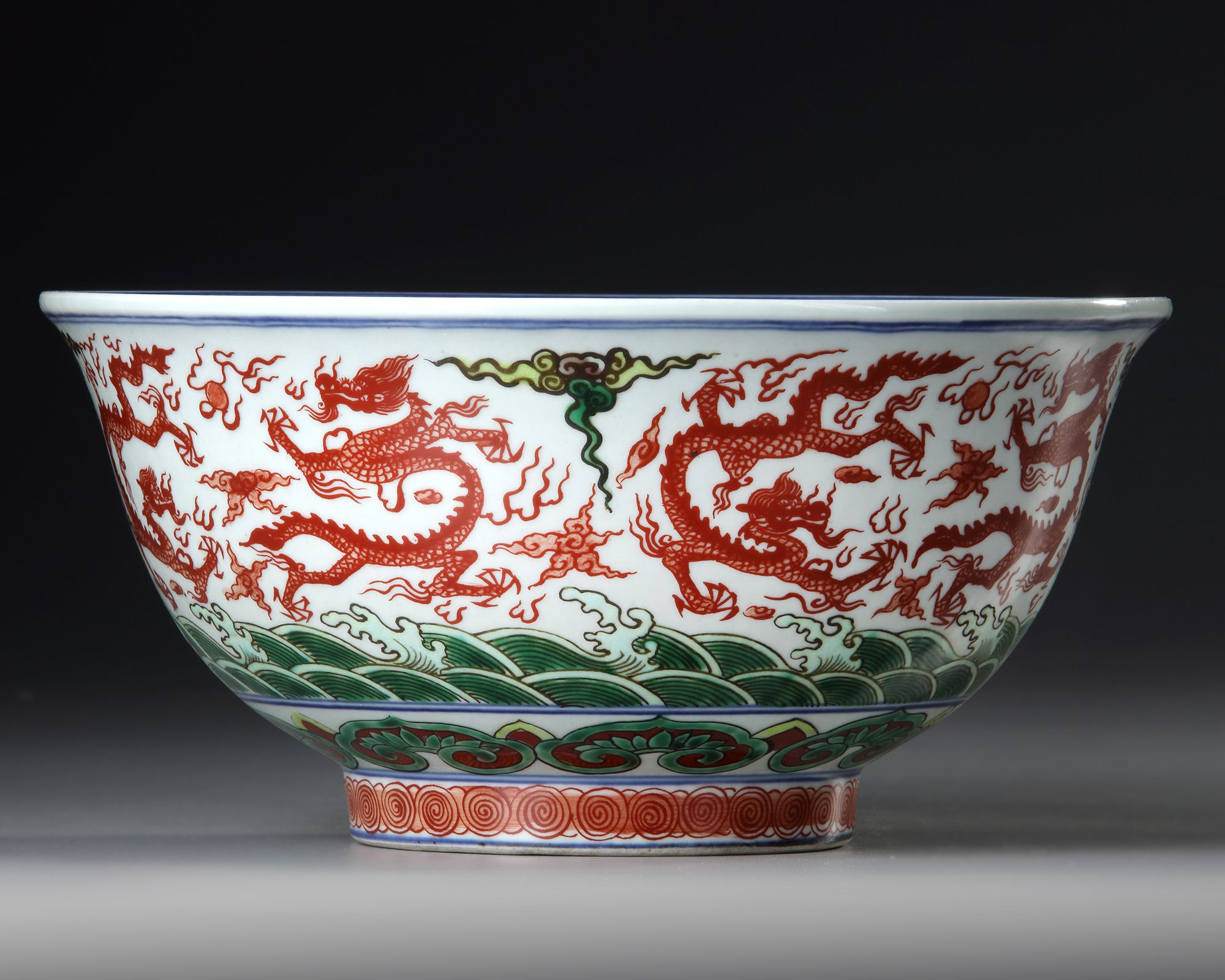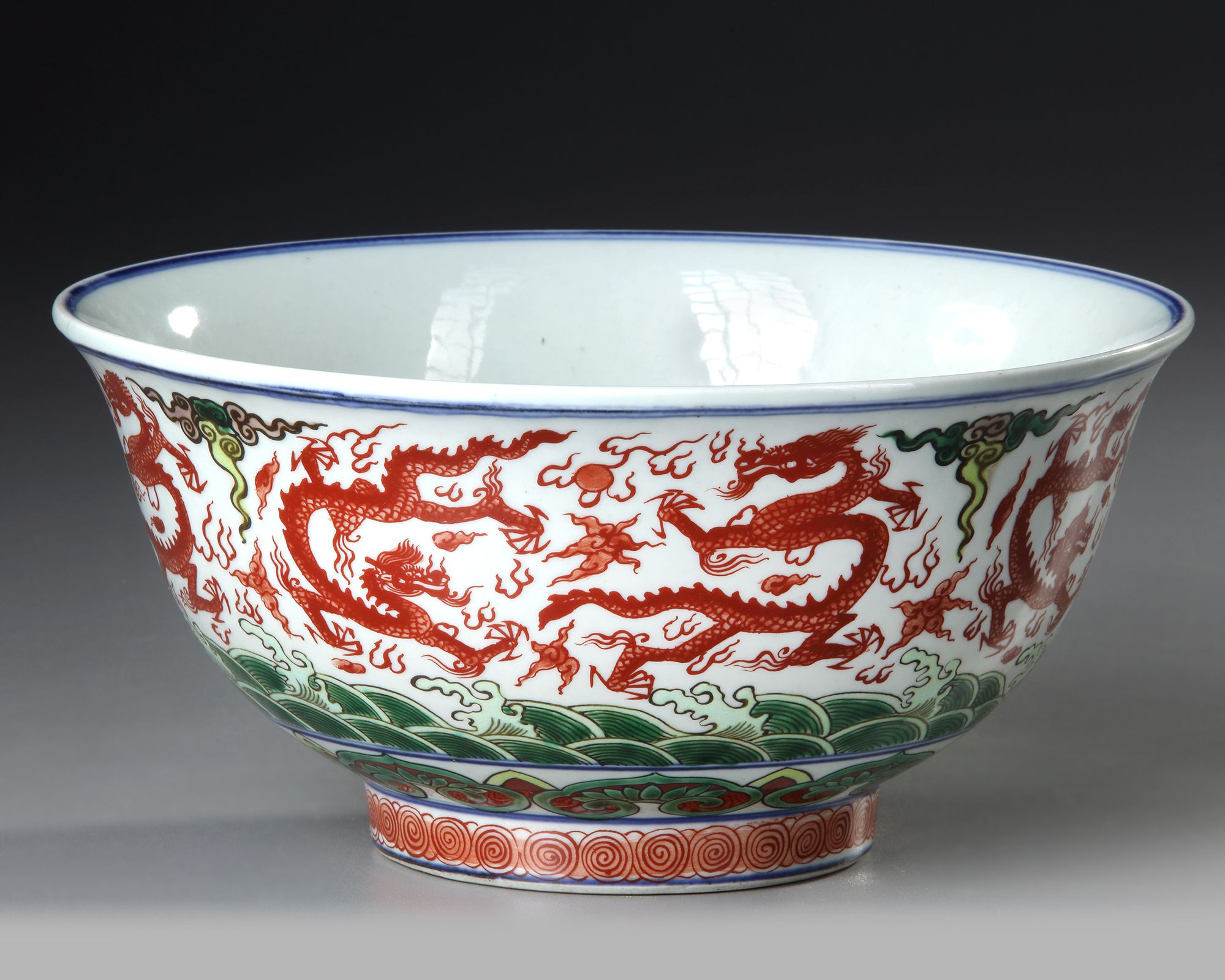 A Chinese porcelain bowl standing on a small foot with slightly flaring sides, decorated to the exterior with pairs of dragons chasing a flaming pearl above sea waves. The interior with a facing dragon amidst clouds and above waves. The bottom with a Chinese Jiajing six character mark.