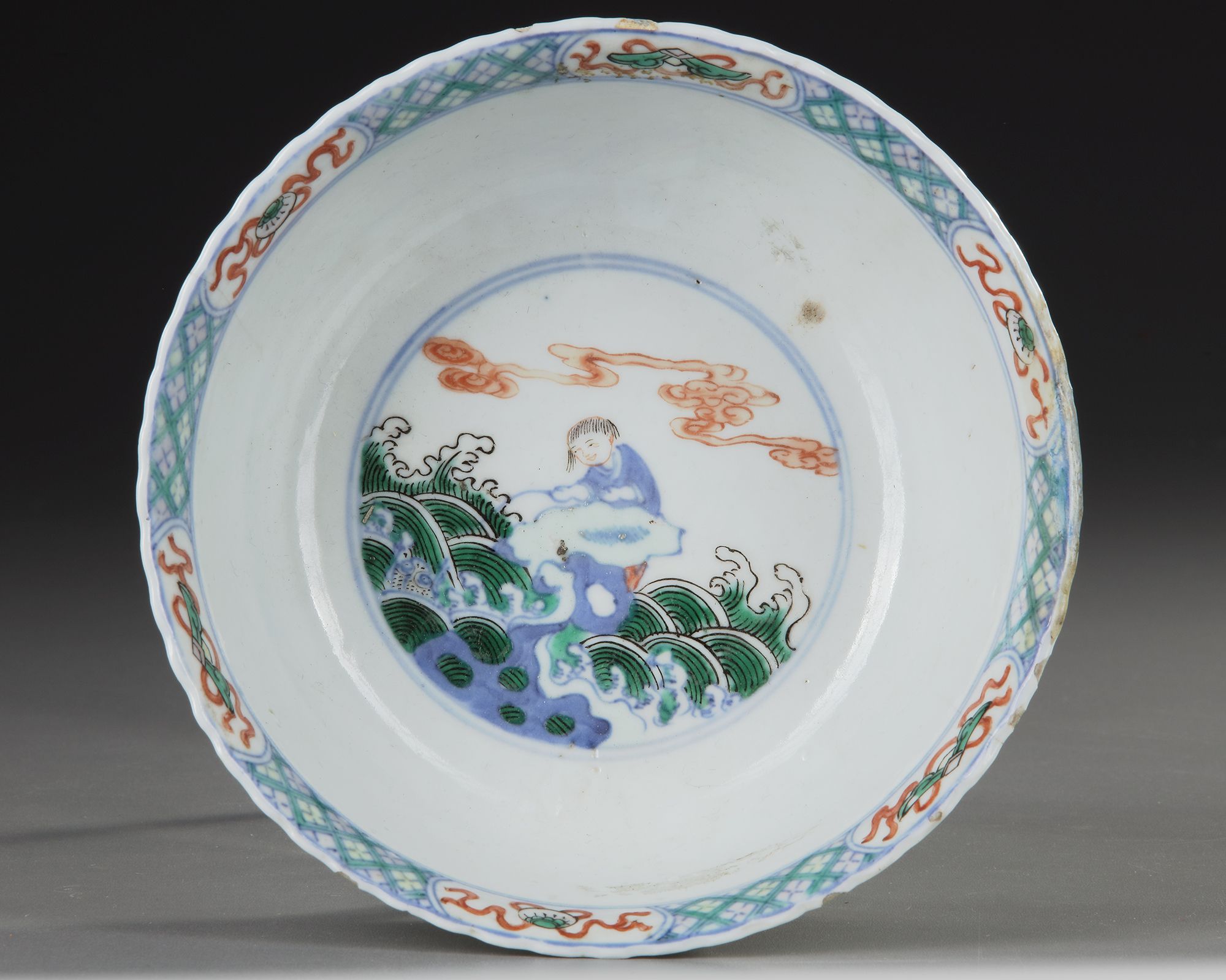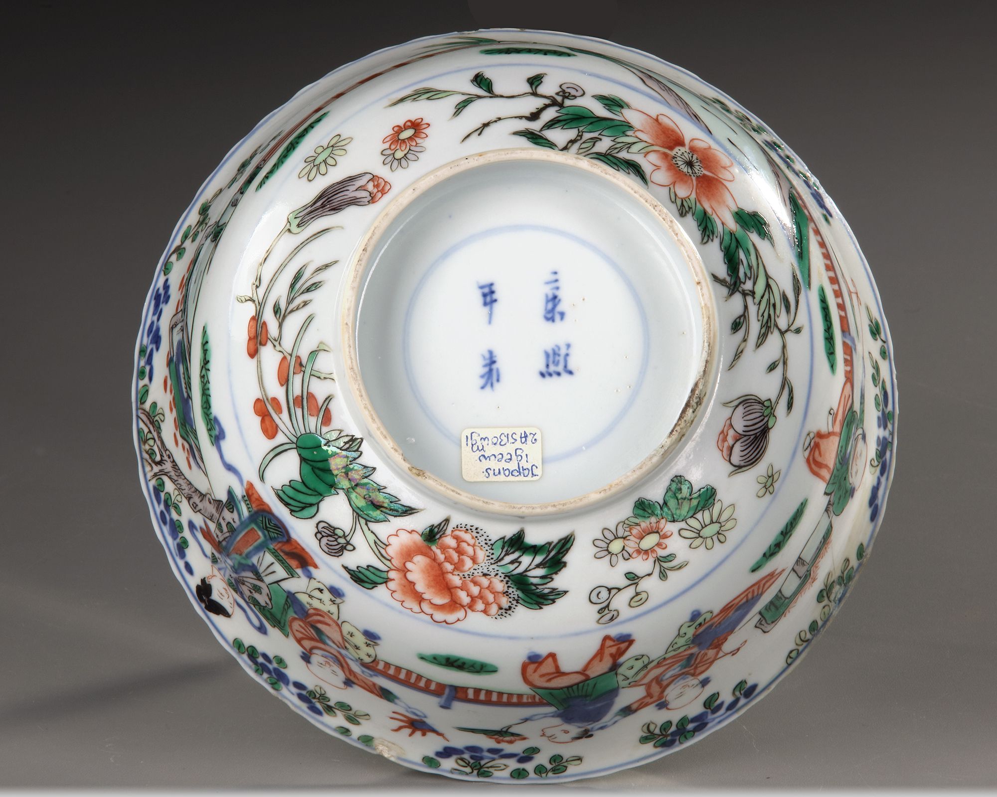 A Chinese famille verte bowl, decorated with a lady and boys at play in a fenced garden. Diameter: 18 cm. Height: 9 cm.