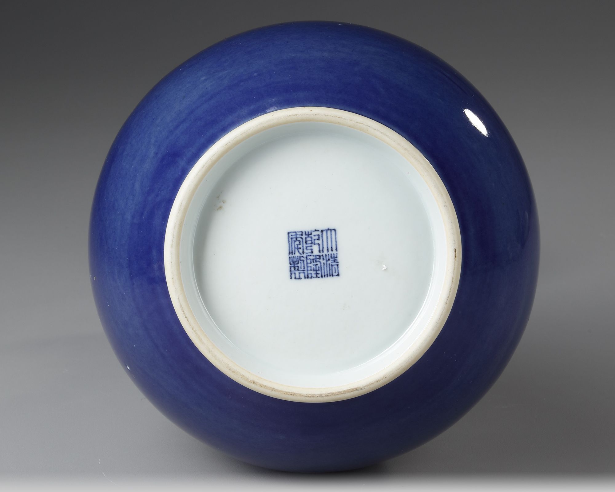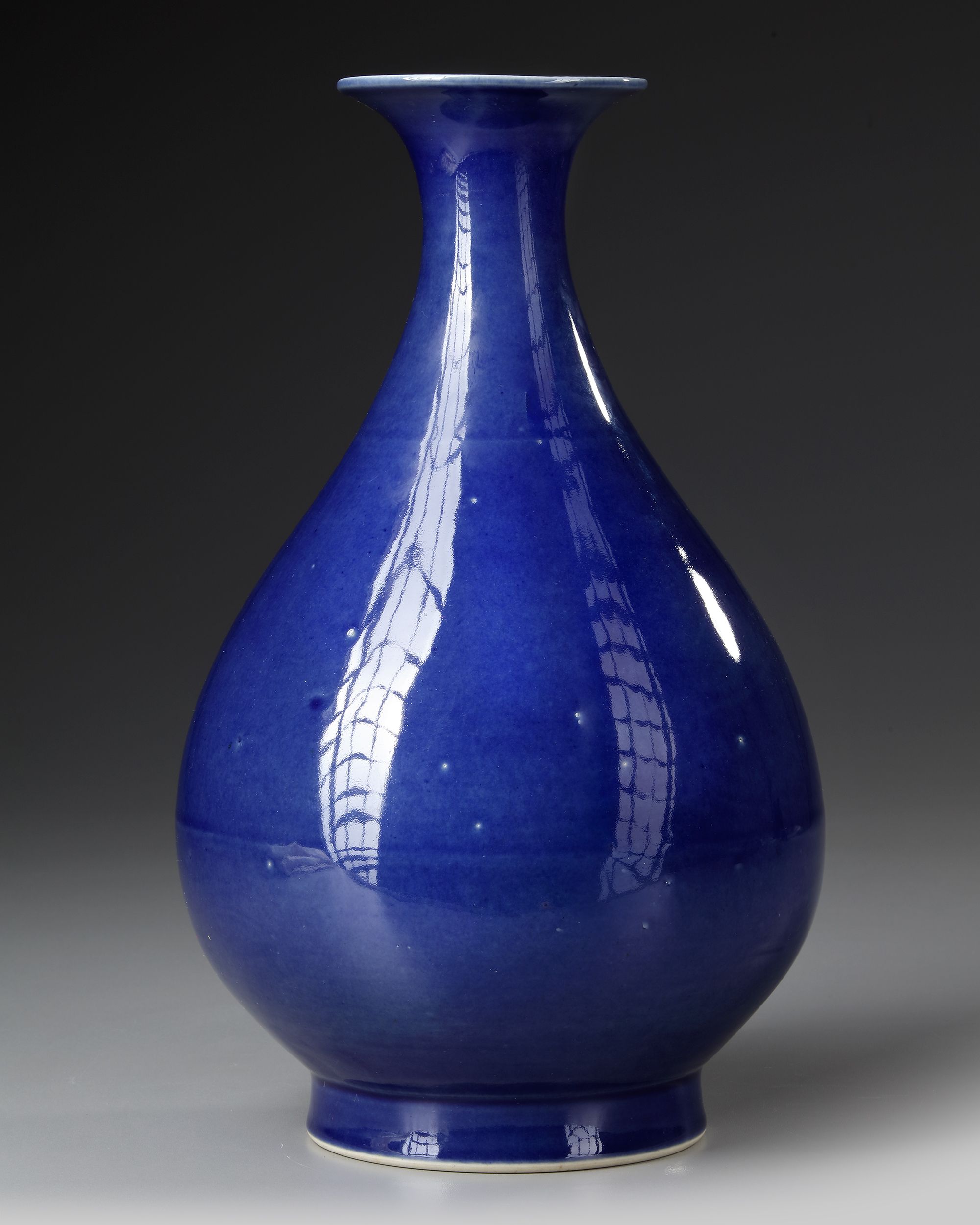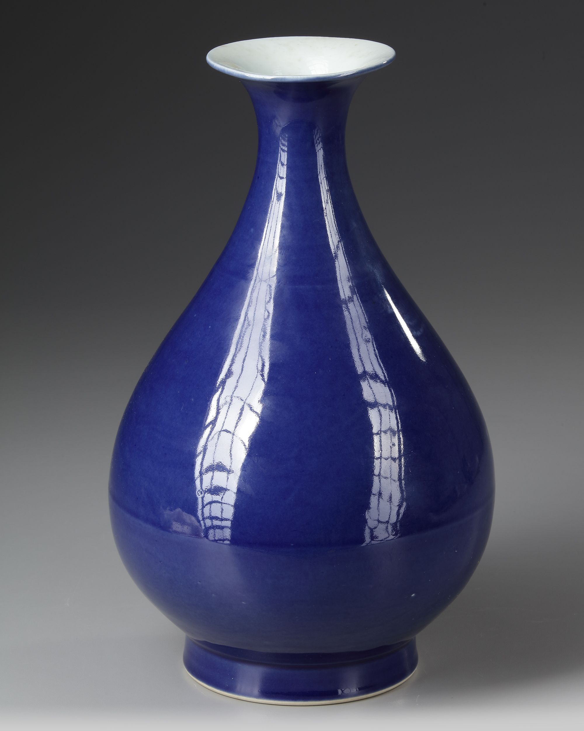 The well-rounded body is potted with a narrow neck rising to a flaring mouth and supported on a short spreading foot ring. The vase is covered in a glaze of dark blue colour. The interior and base are covered with a transparent glaze. The bottom with a Chinese Qianlong seal mark.