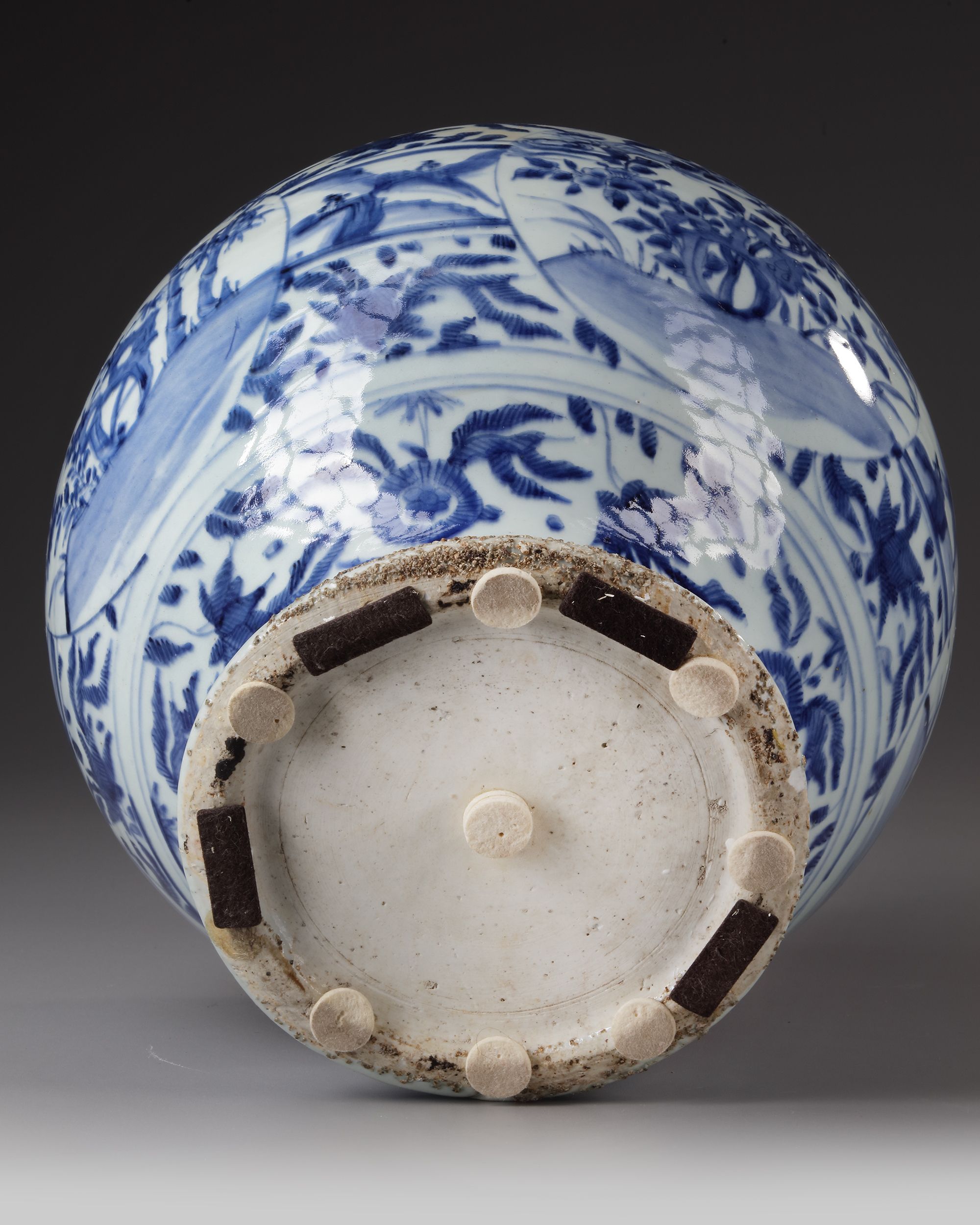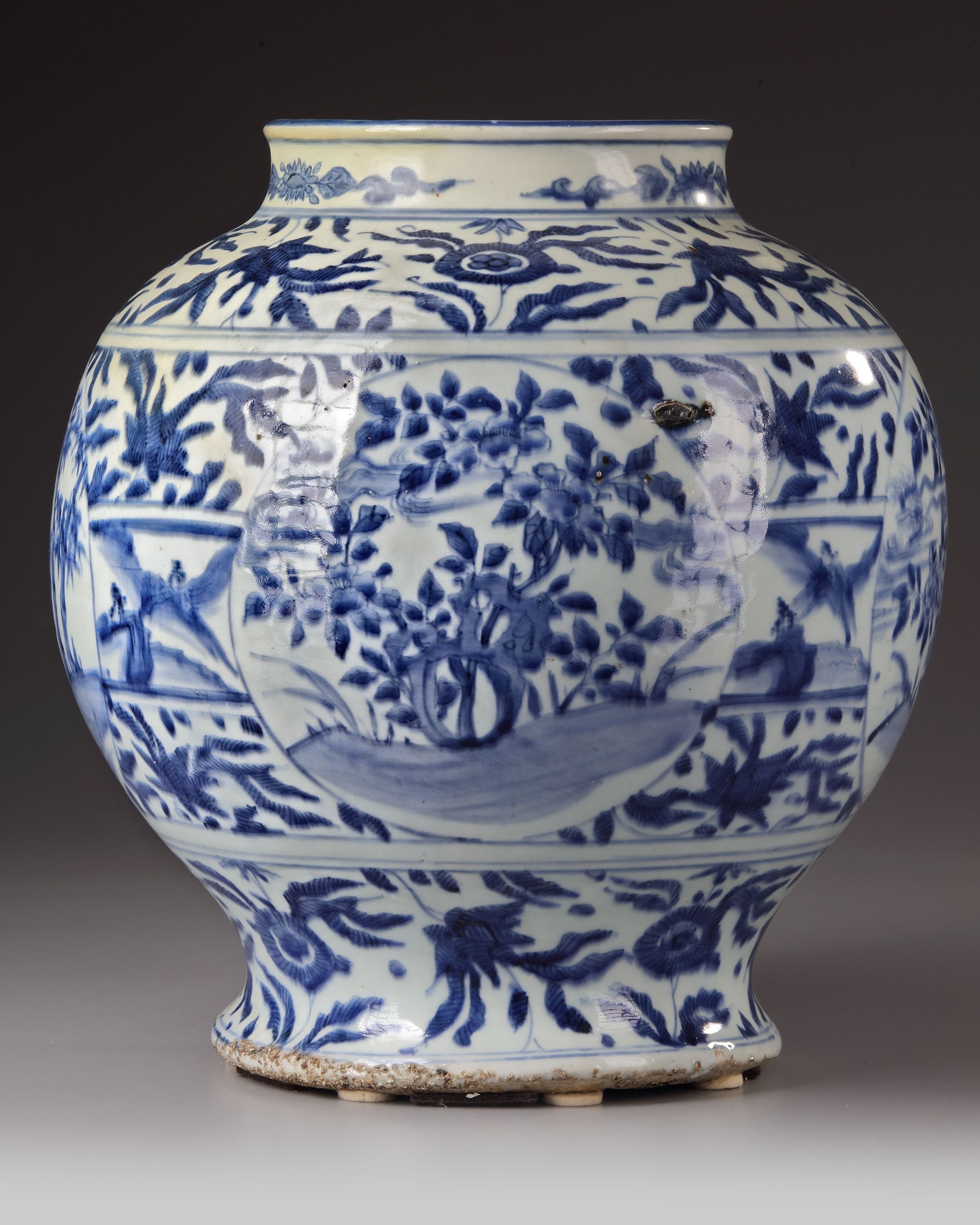 A Chinese porcelain jar with globular body and high shoulder, decorated in cobalt-blue with panels enclosing peonies blossoming branches growing from ornamental rocks, further stylized around the body, the shoulder and the base with flower heads amongst floral motifs and scrolls.