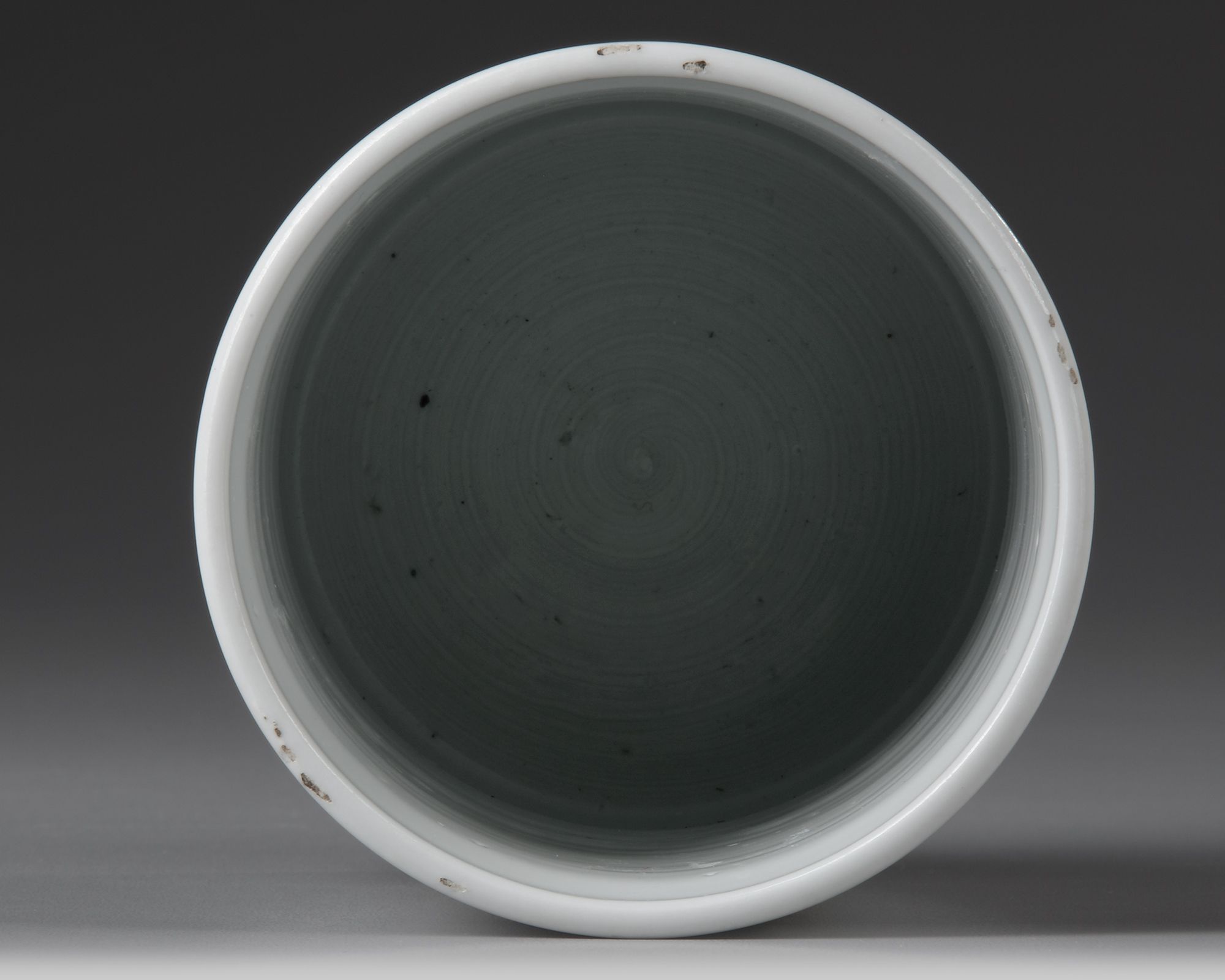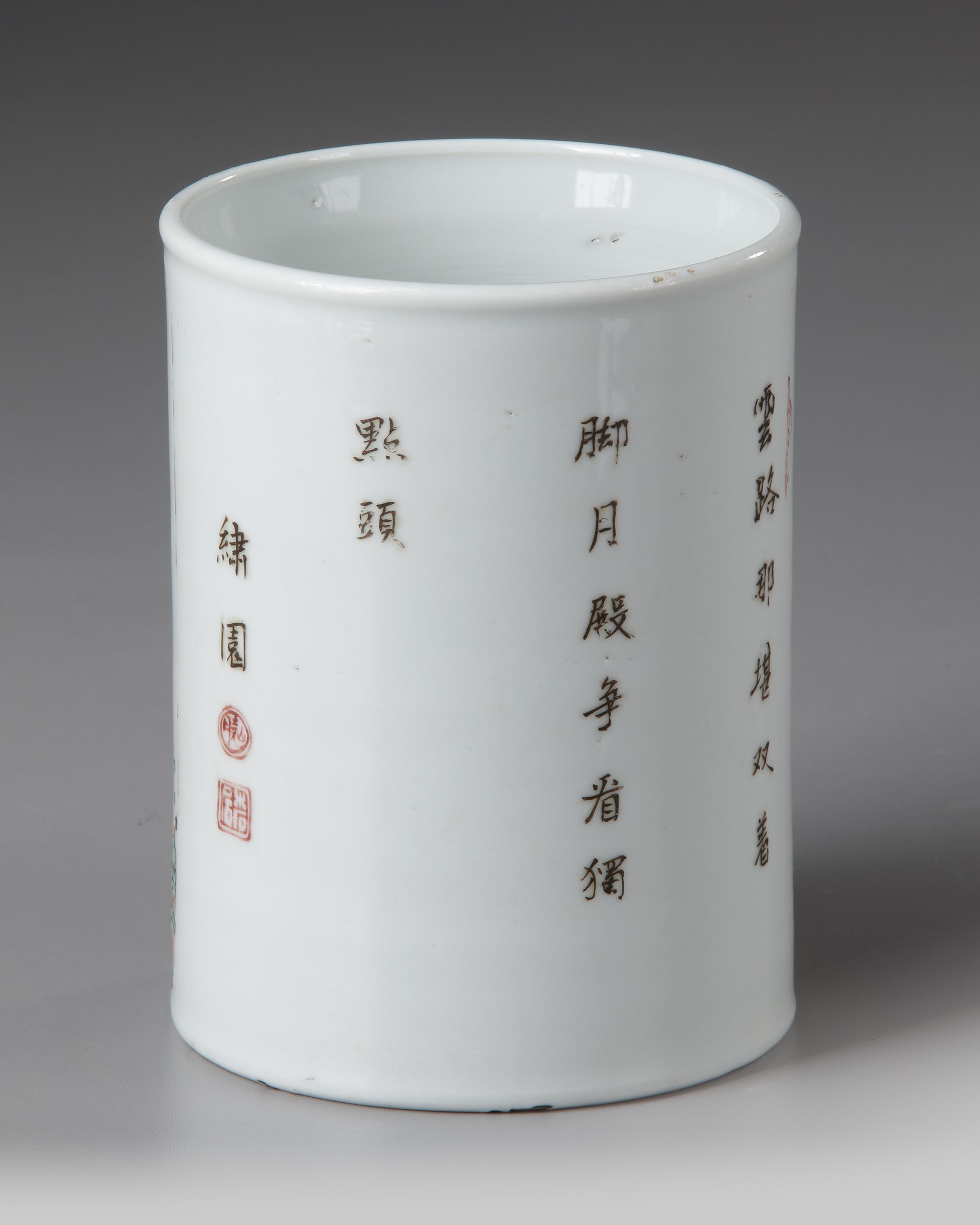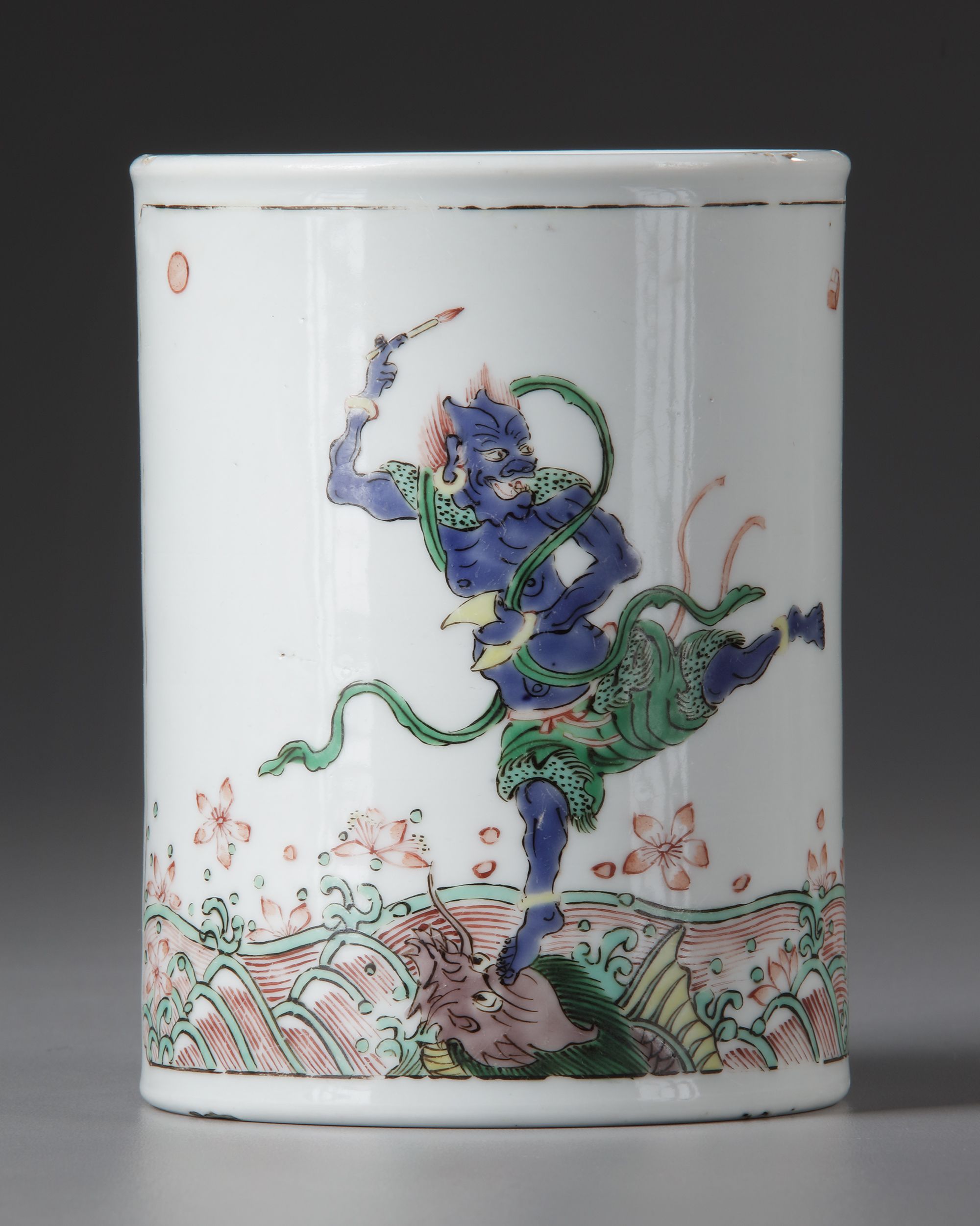 A Chinese porcelain famille verte brush pot, bitong, painted with a panel enclosing Kuixing, the god of examinations, standing on one leg on the head of a dragon fish emerging from crested waves while holding a brush in one hand and a bushel-measure in the other, his scantly clad torso with a large green ribbon and wearing gilt rings on his ankles.