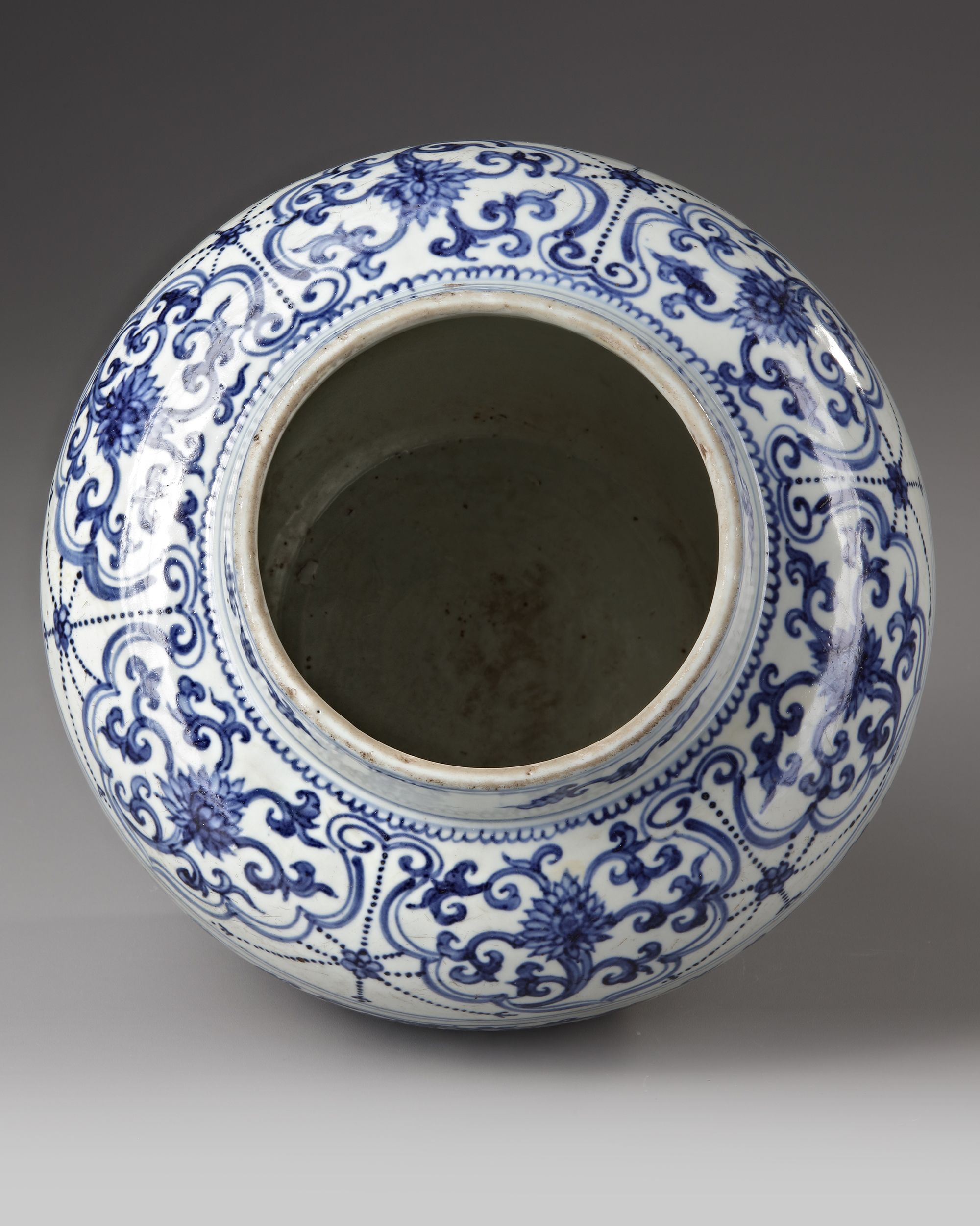 A Chinese porcelain jar with compressed body, decorated in cobalt blue with a large band of scrolling peonies amongst foliage, the base with a petal lappet border, the shoulder with a band of ruyi heads enclosing lotus blossoming branches.