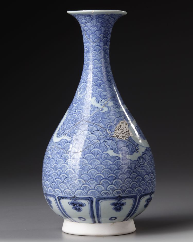 A Chinese porcelain pear shaped vase, decorated in cobalt-blue with a three-clawed dragon in reverse chasing a flaming pearl amongst waves and above a petal lappet border.