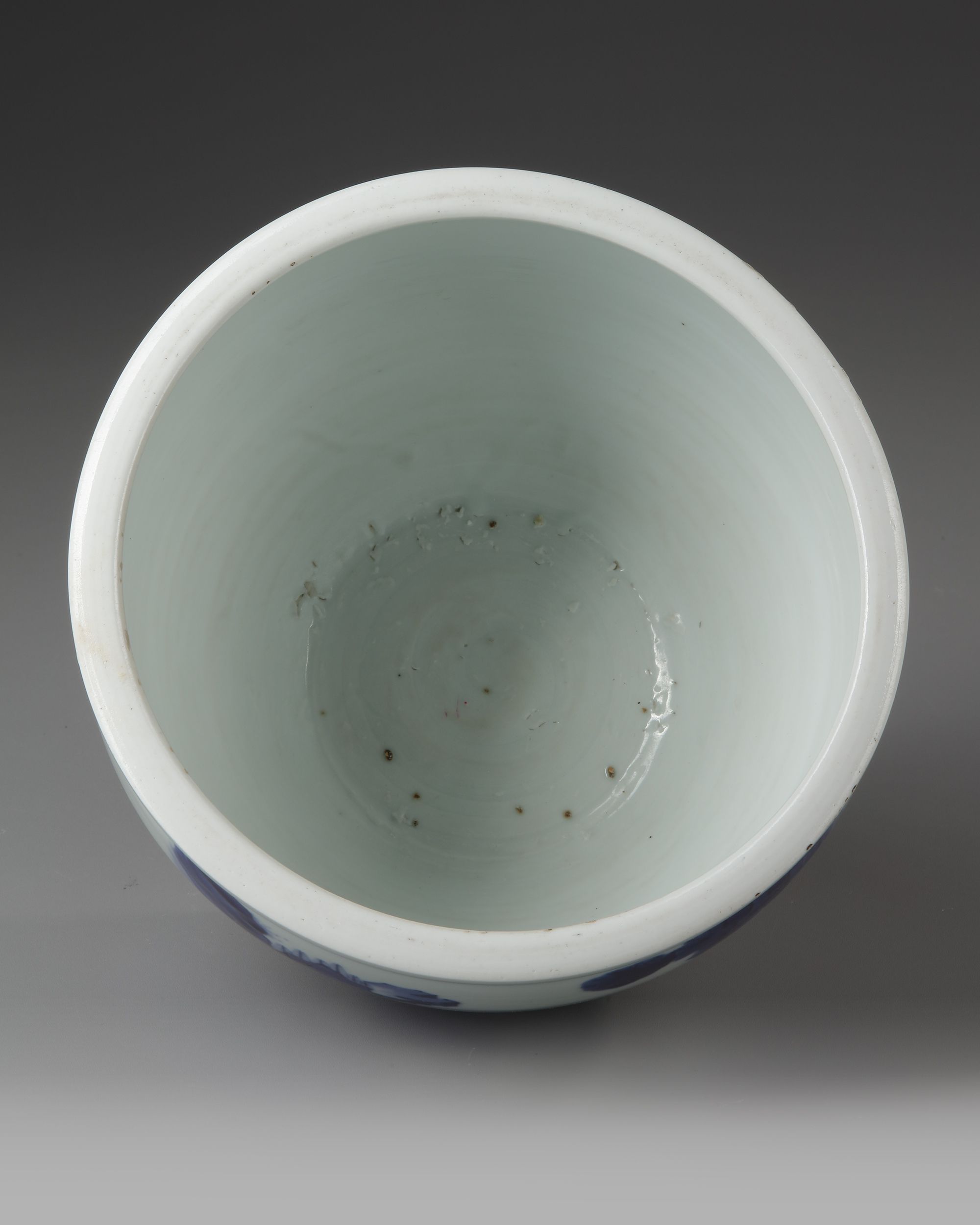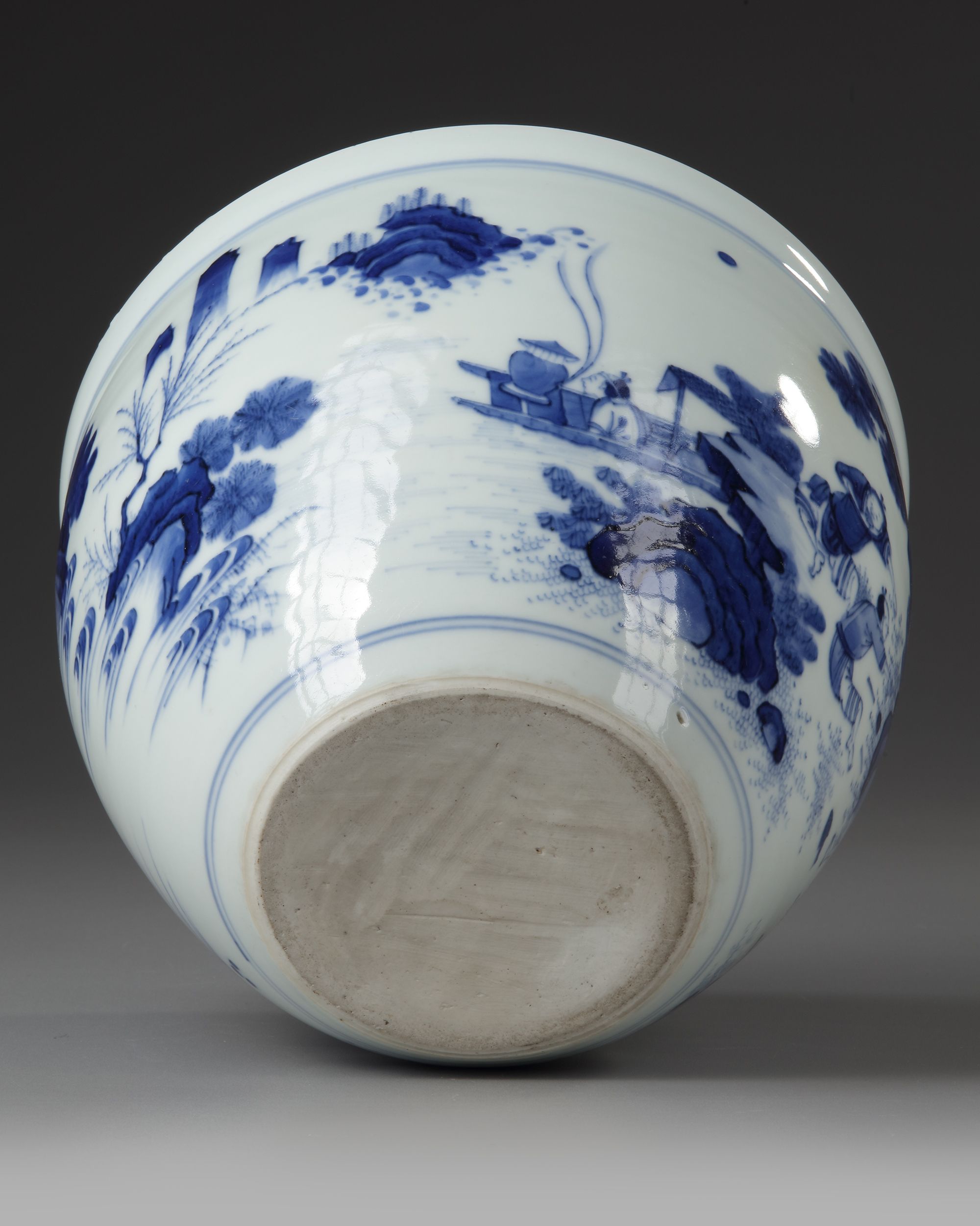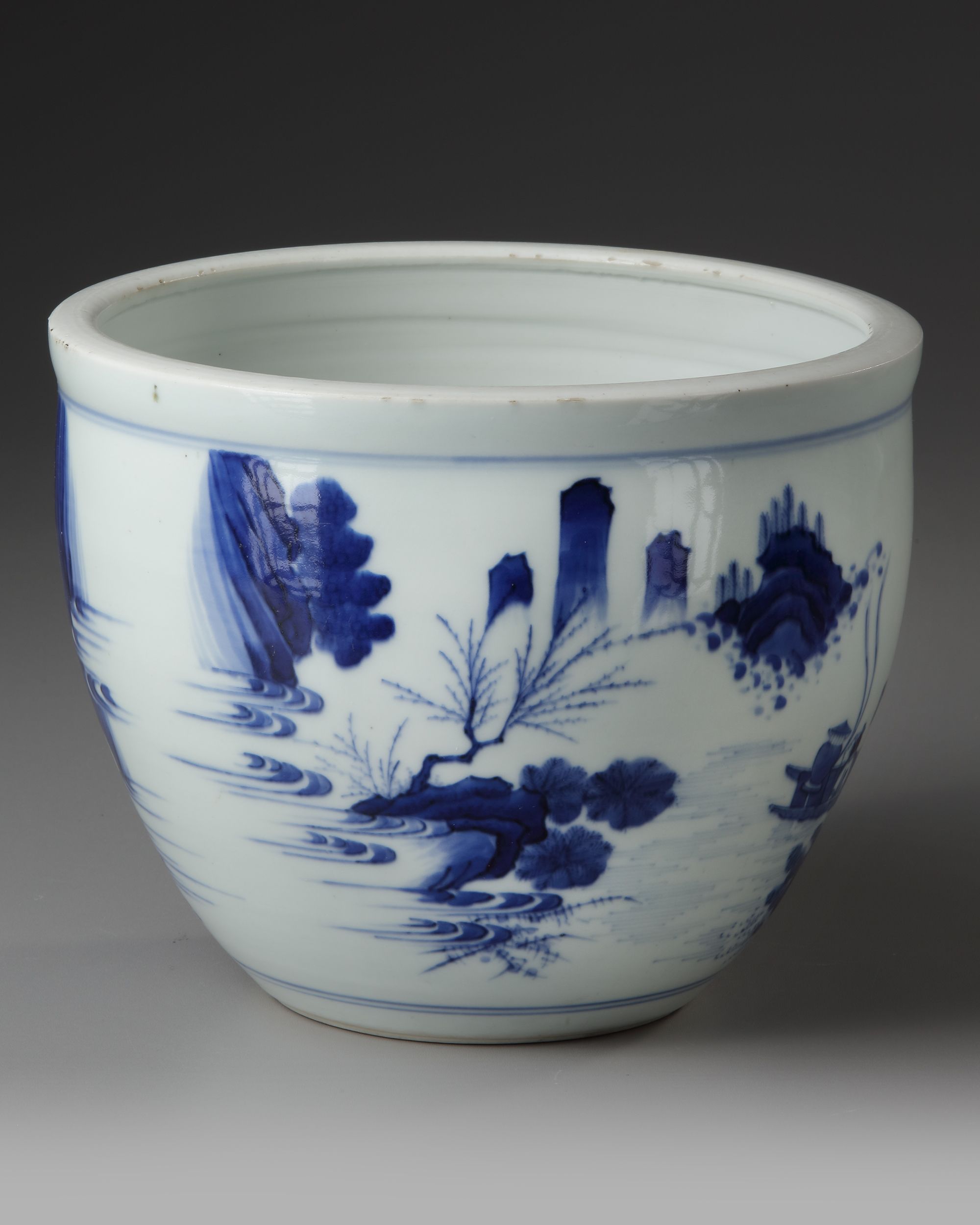 A Chinese porcelain pot decorated in cobalt-blue with figures in a landscape. Height: 22.5 cm. Diameter: 18 cm.
