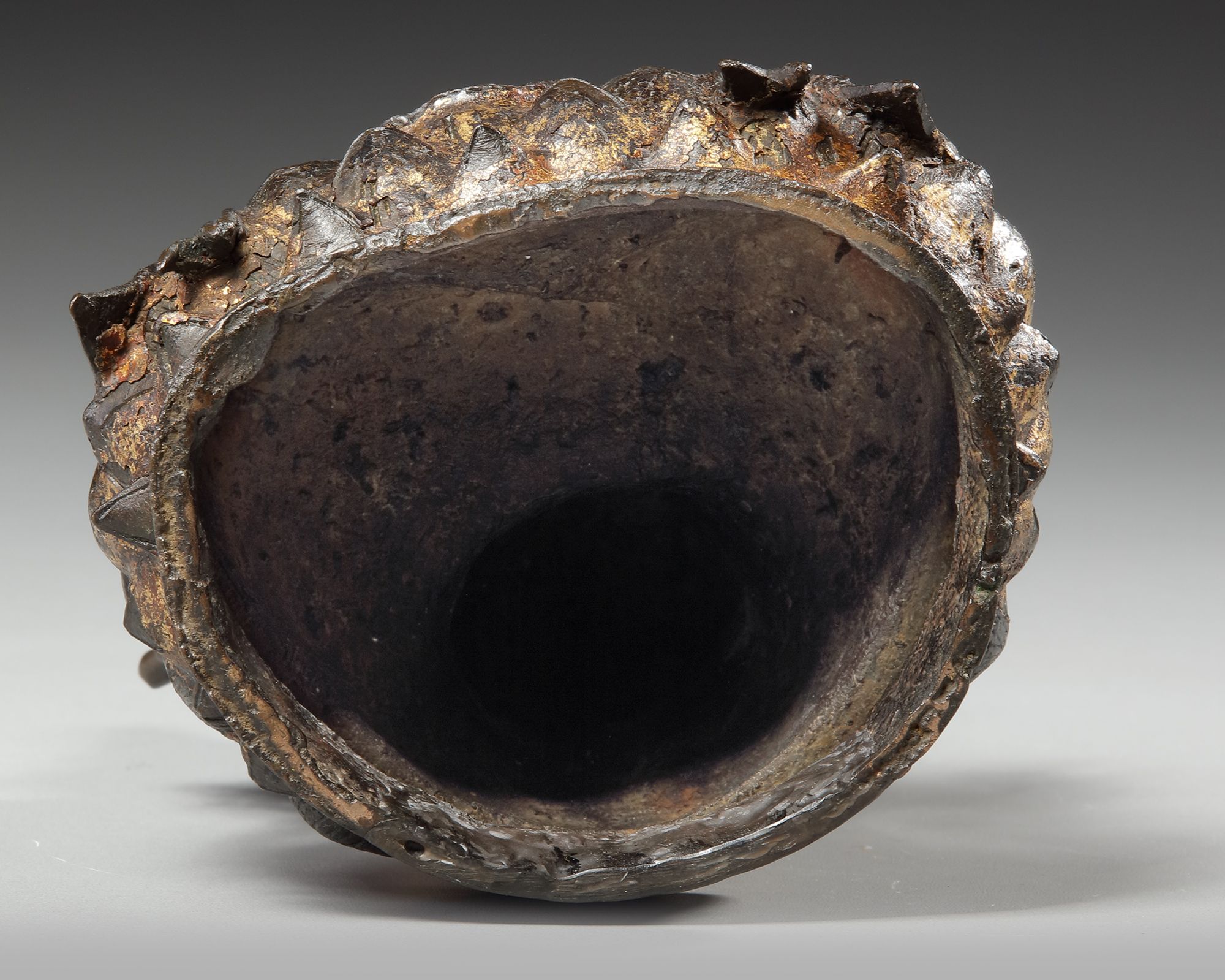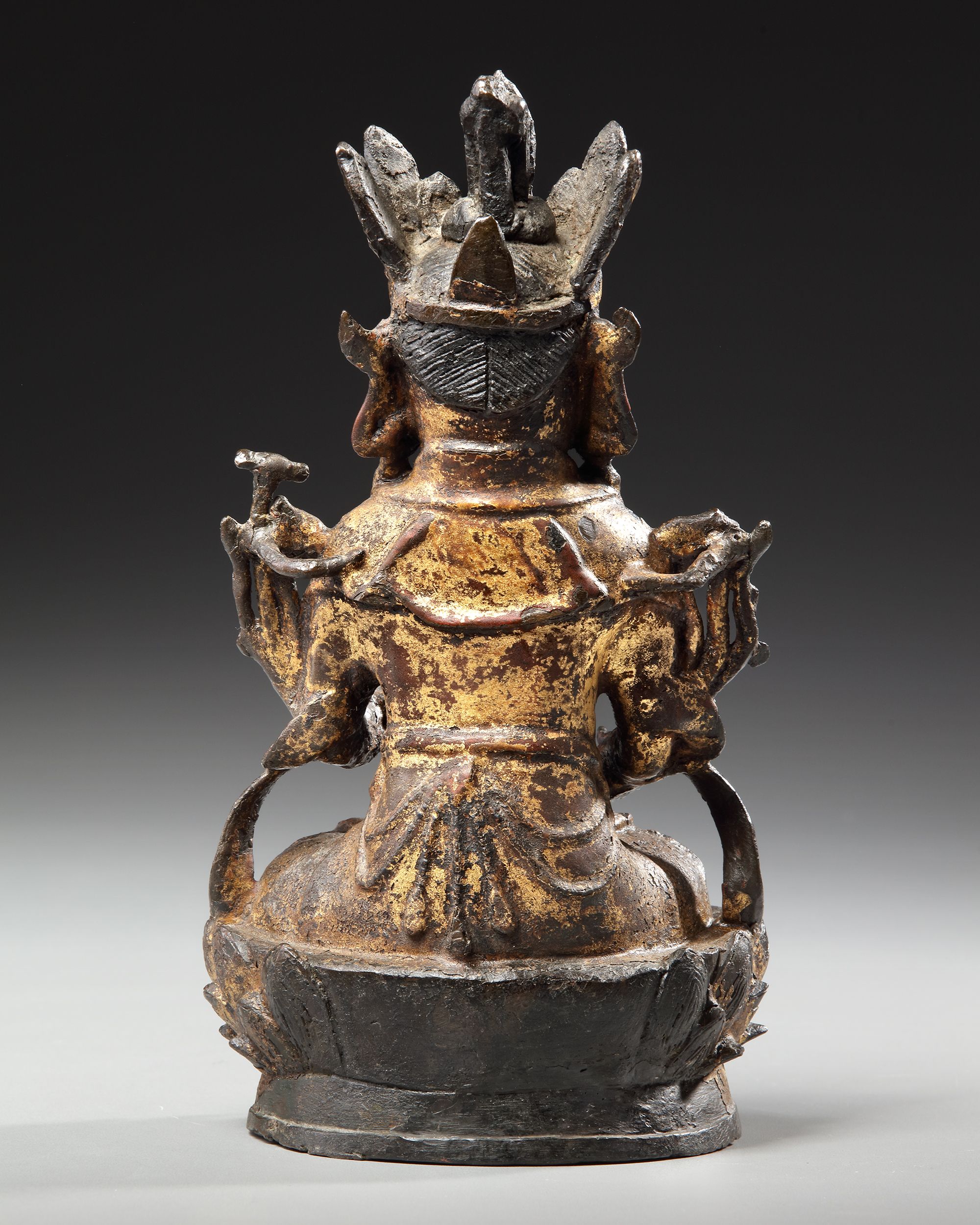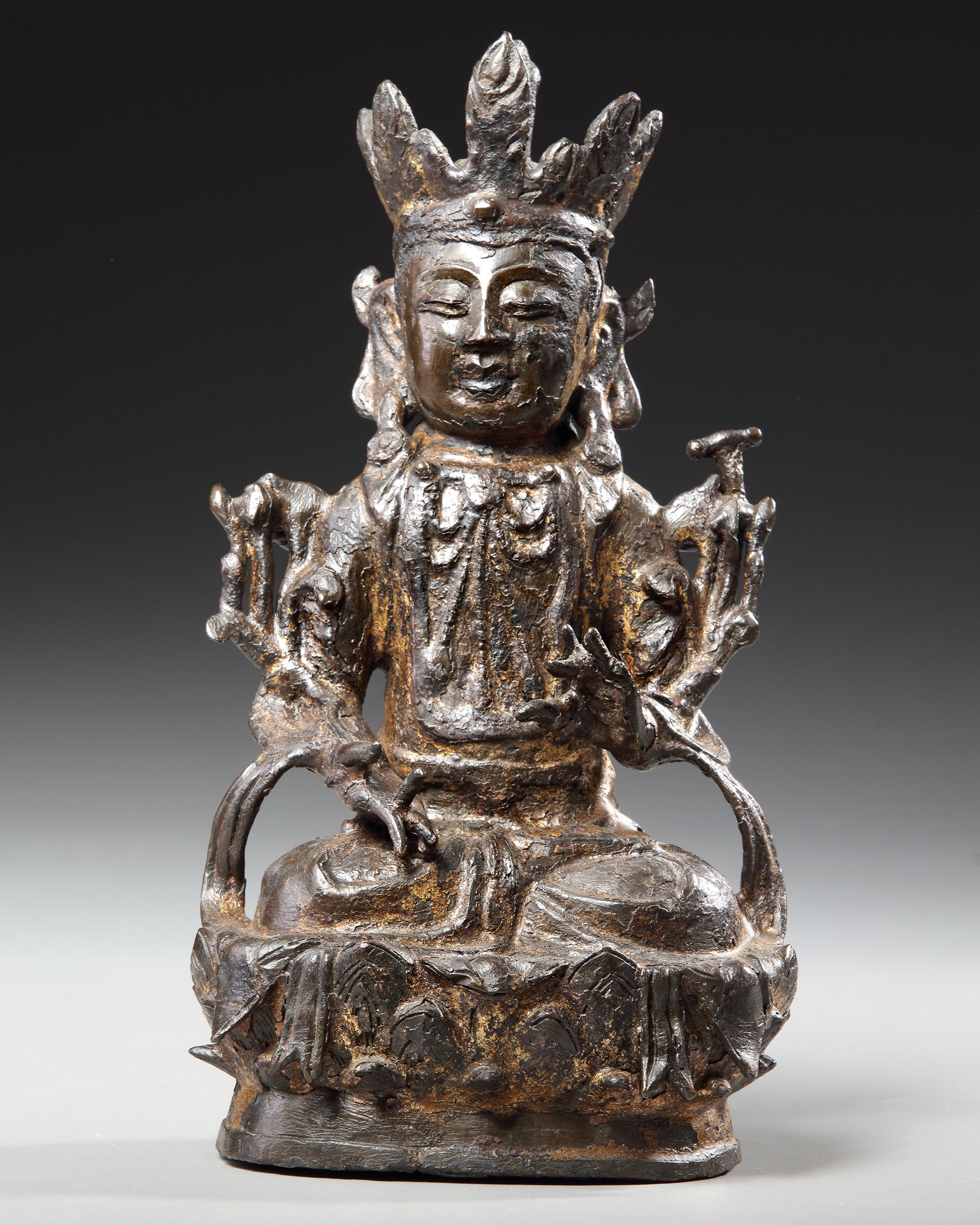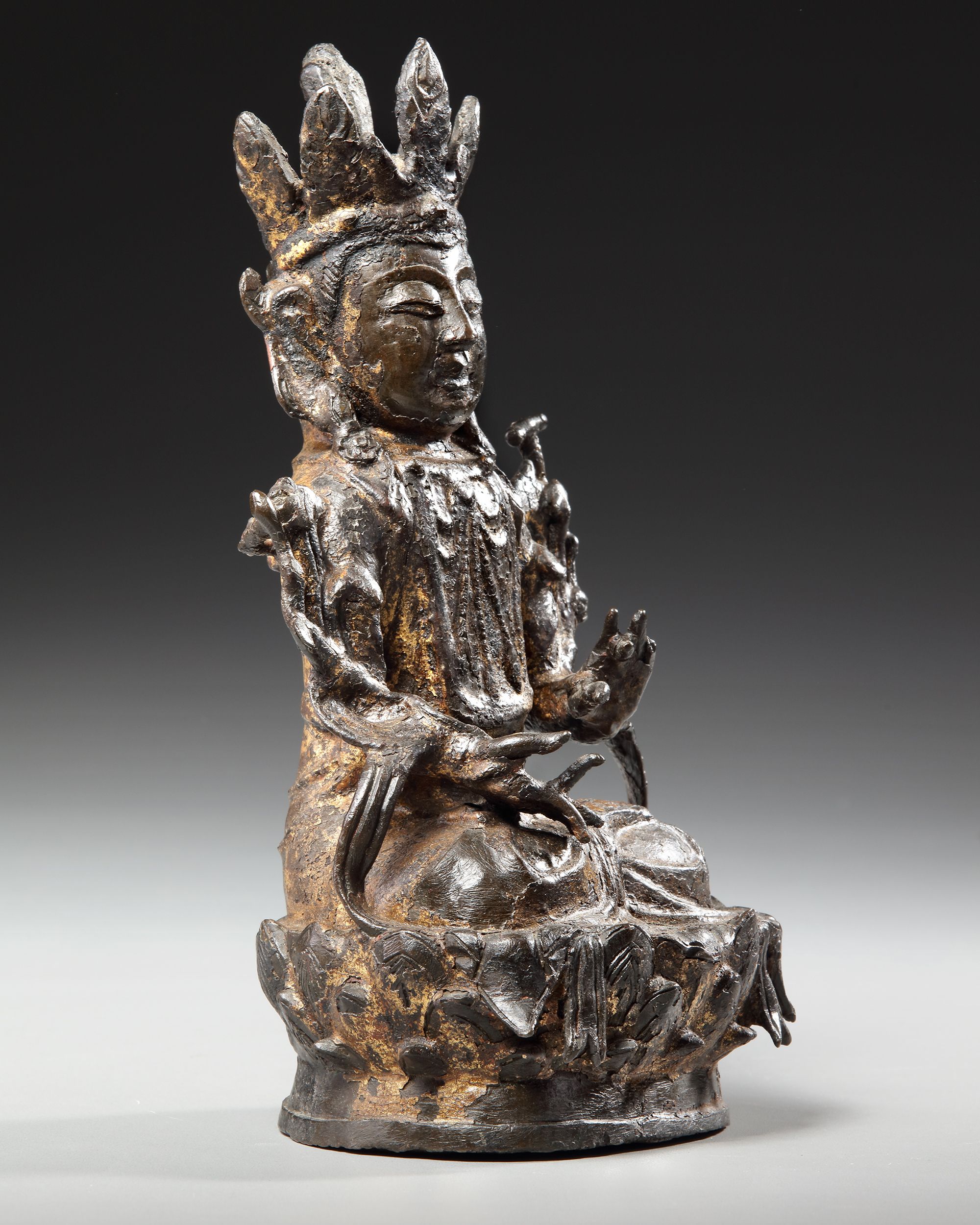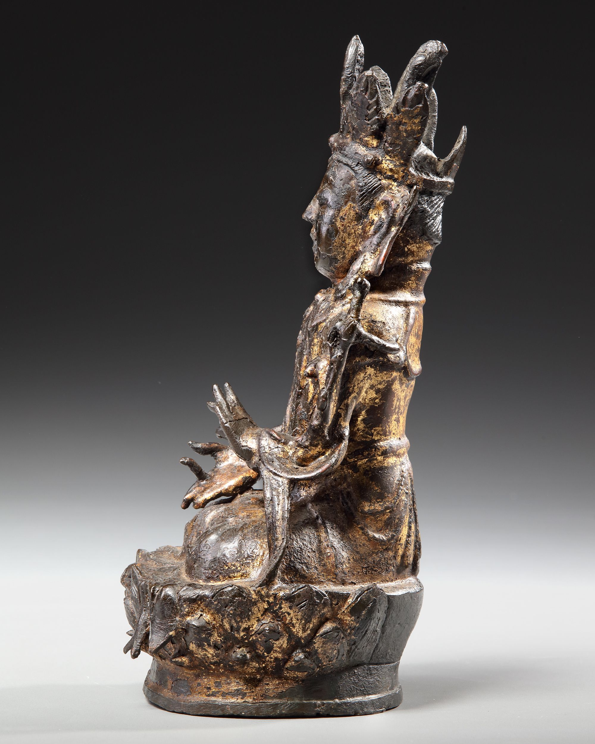 A Chinese bronze figure of a Guanyin, seated in dhyanasana, hands in vitarka mudra, dressed in a monastic robe with finely incised borders of floral motifs, uncovered torso adorned with jewelry, serene face topped with an ornate crown, hair held in a high bun leaving long locks along the shoulders, seated on a lotus stand, with traces of gilding.