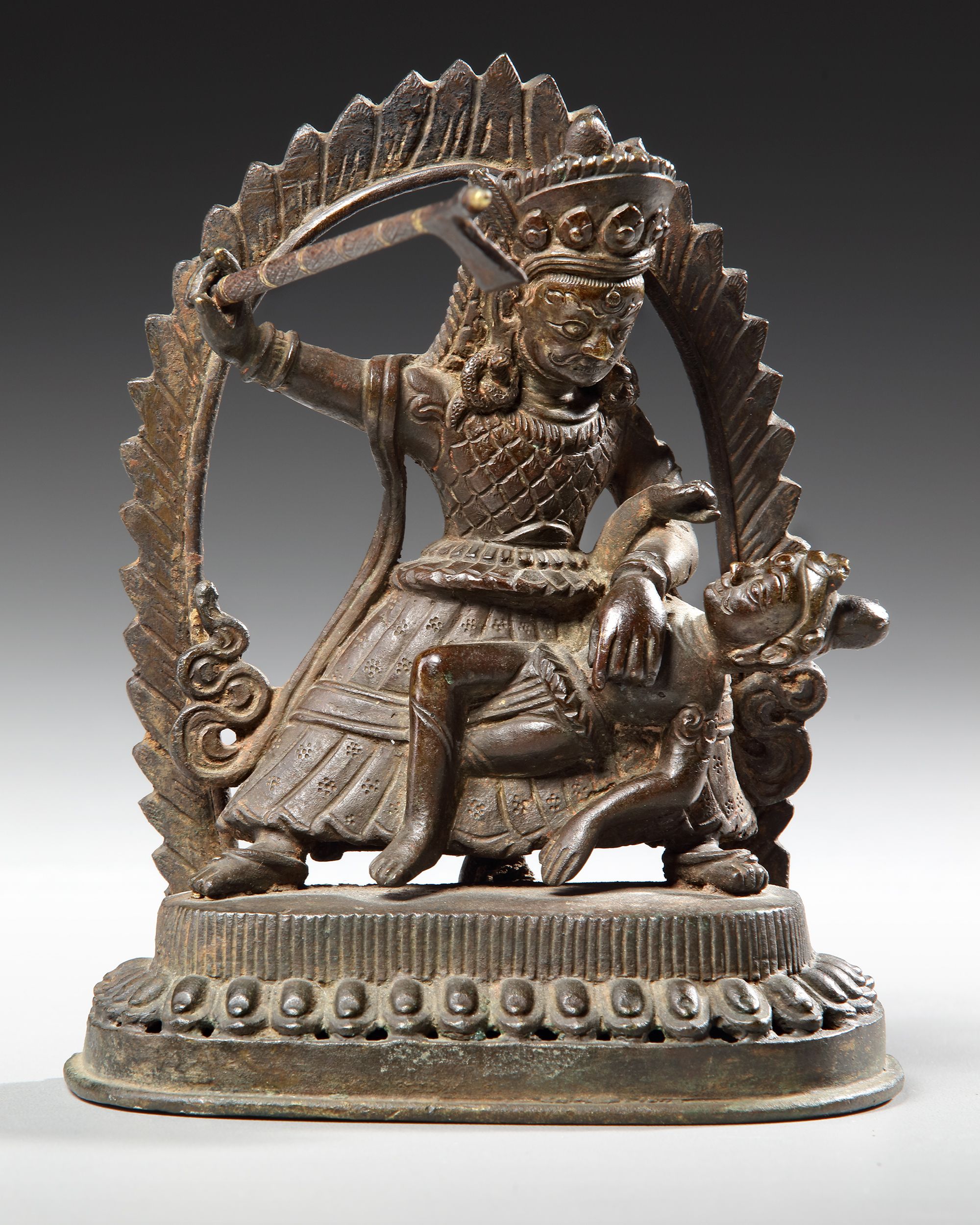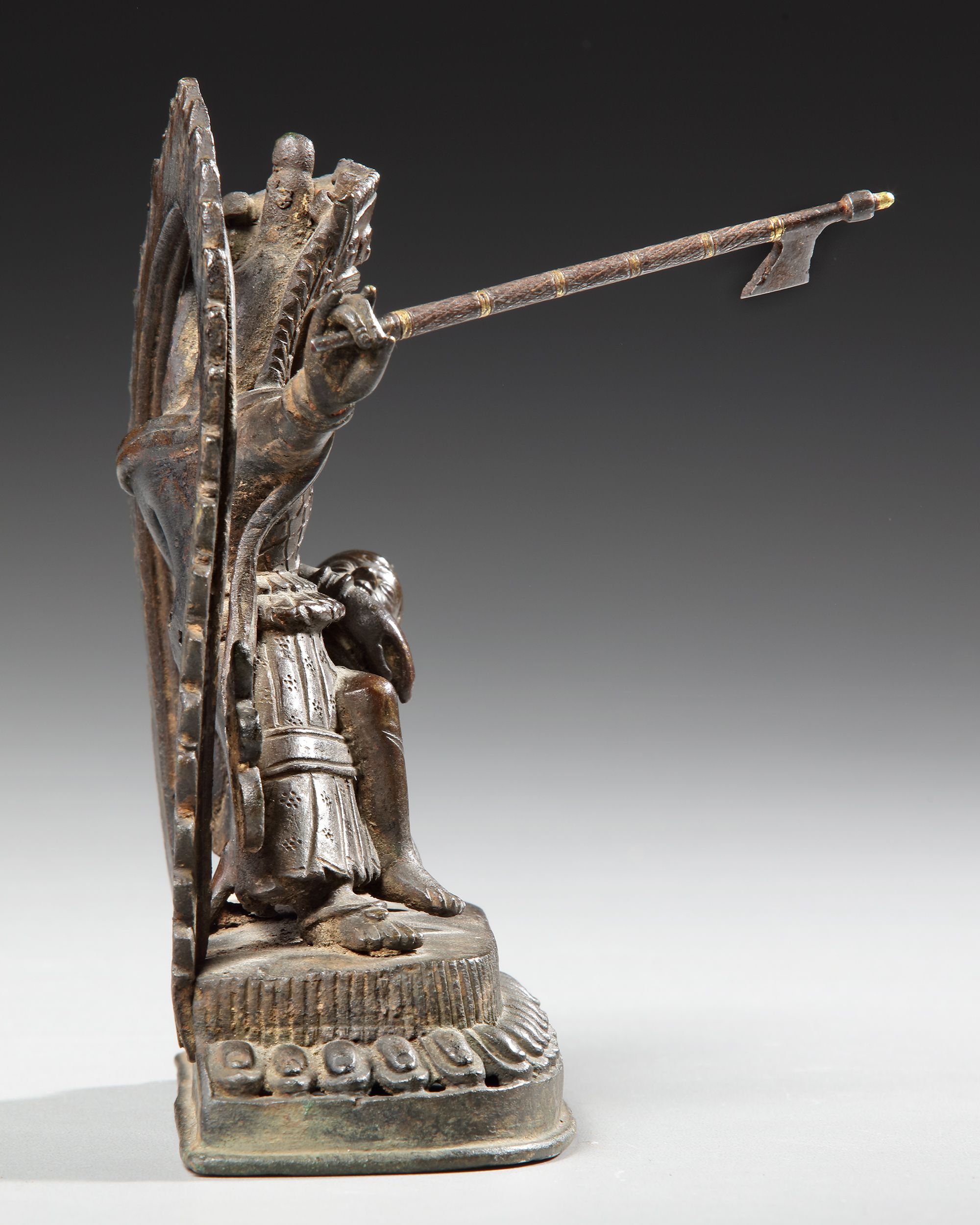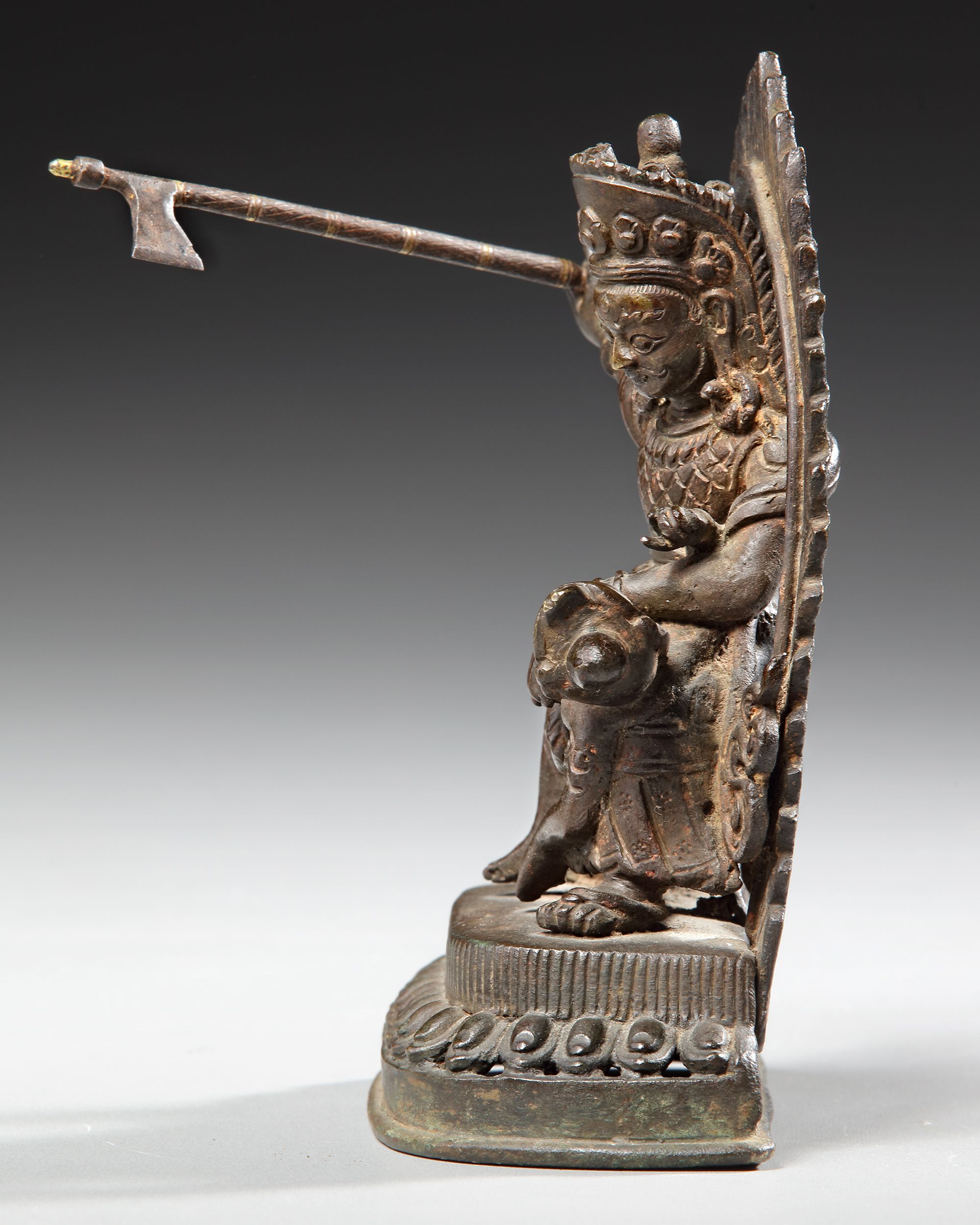 A bronze sculpture of a wrathful deity from the Hindu pantheon of Nepal. The bronze of the deity with a third eye on the forehead is standing on a lotus base together with his Dakini. This tantric deity is perhaps a certain wrathful aspect of Vishnu as generally known by the name Bhairava. He has wild hair rising up behind crown and holding an axe.