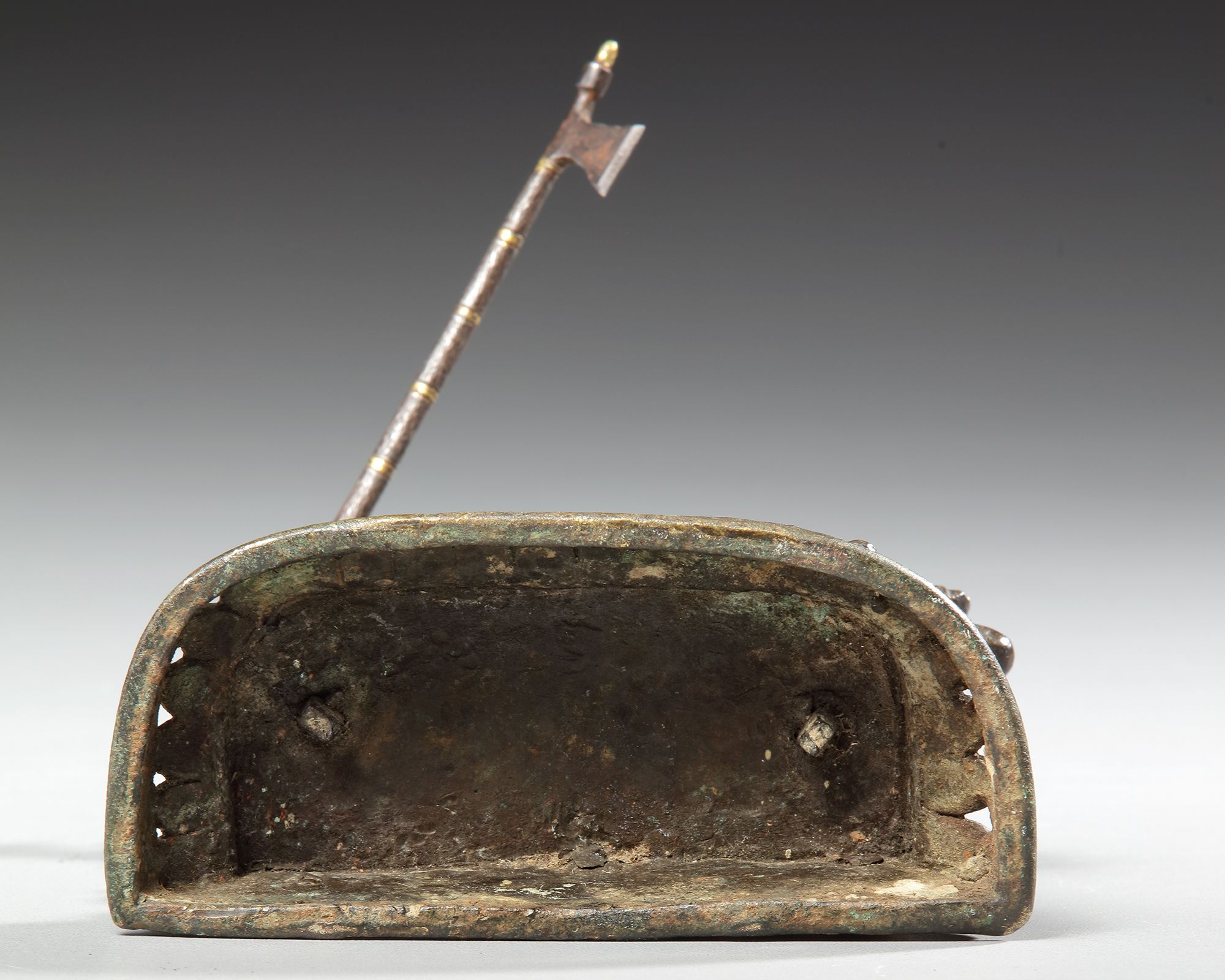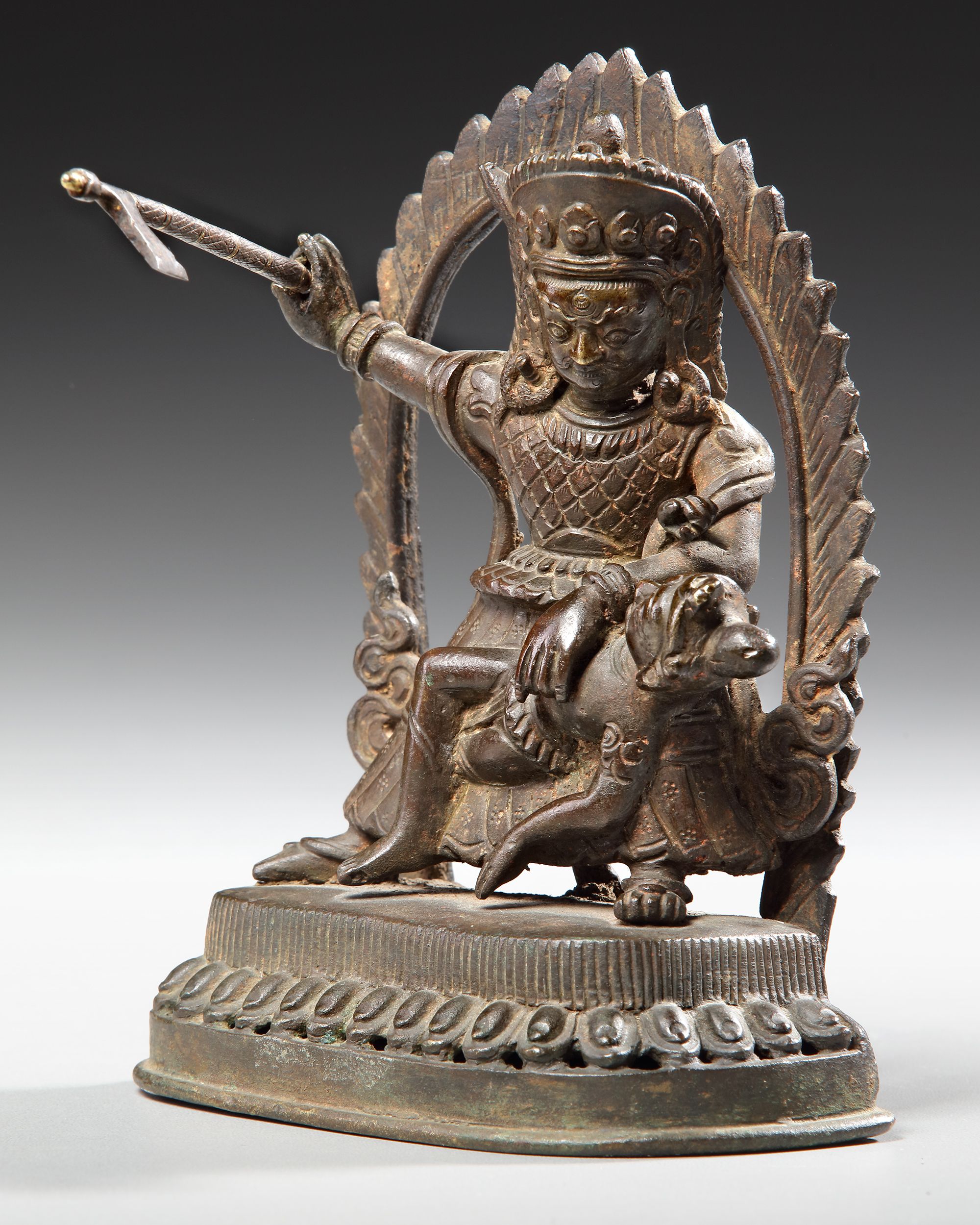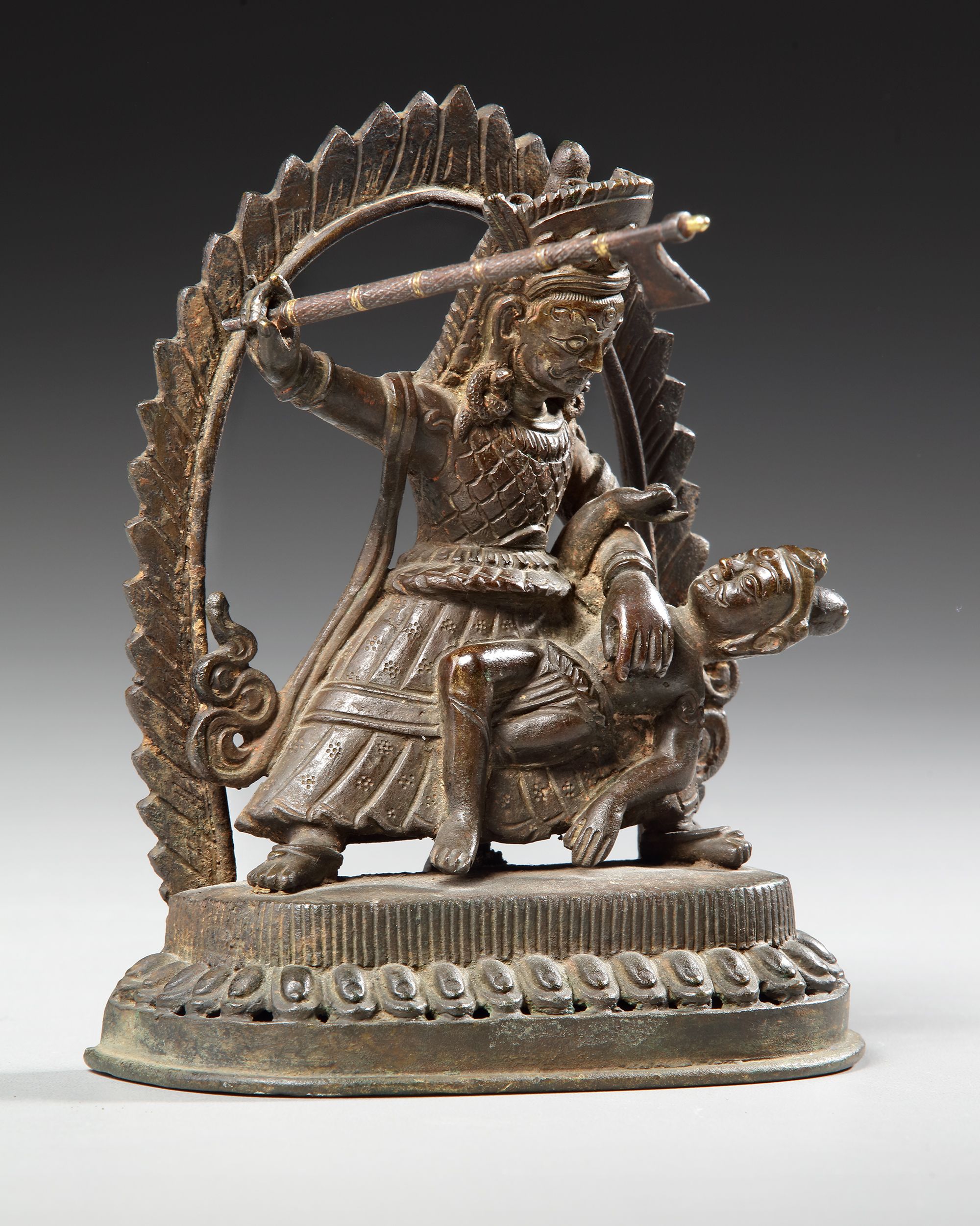 A bronze sculpture of a wrathful deity from the Hindu pantheon of Nepal. The bronze of the deity with a third eye on the forehead is standing on a lotus base together with his Dakini. This tantric deity is perhaps a certain wrathful aspect of Vishnu as generally known by the name Bhairava. He has wild hair rising up behind crown and holding an axe.