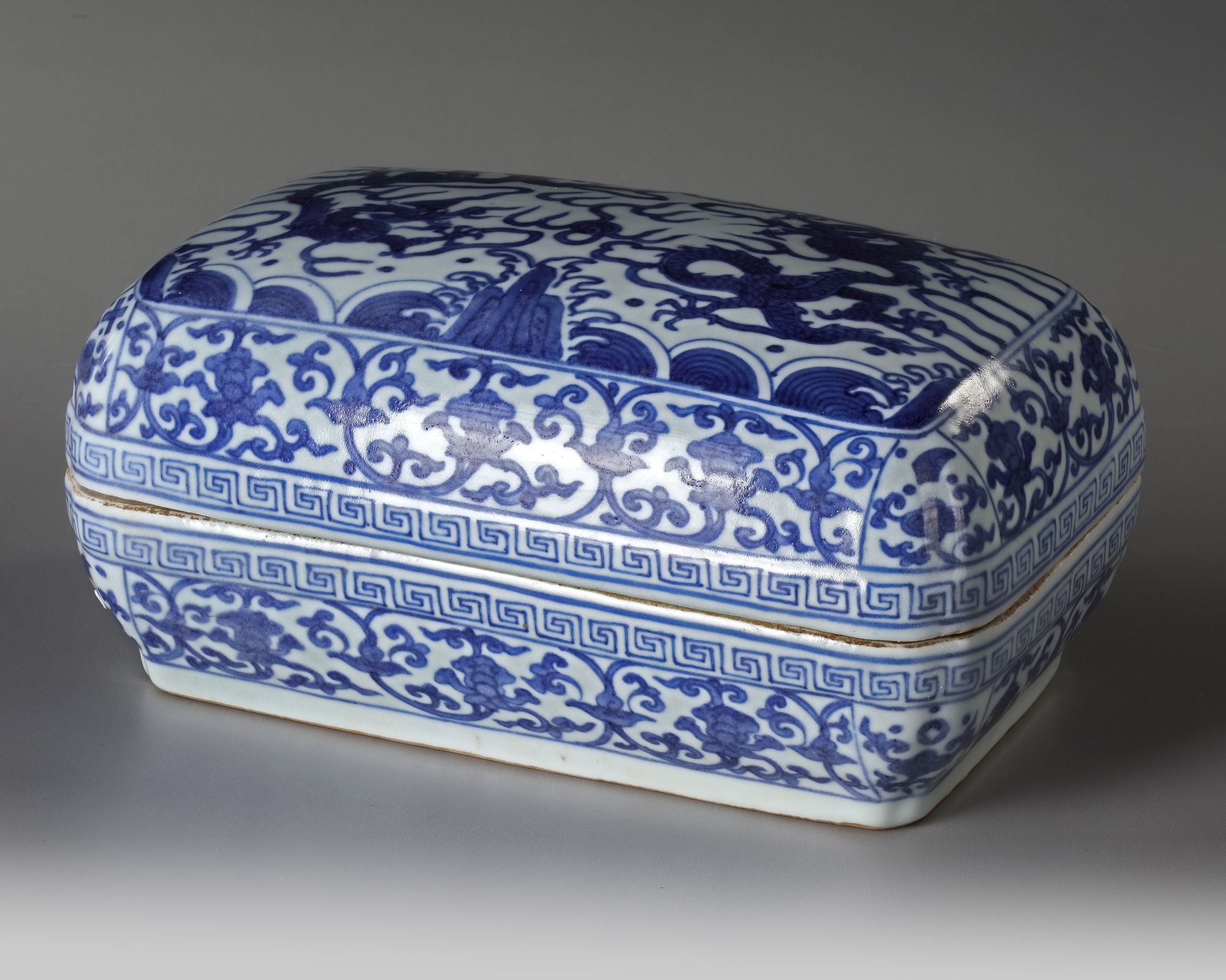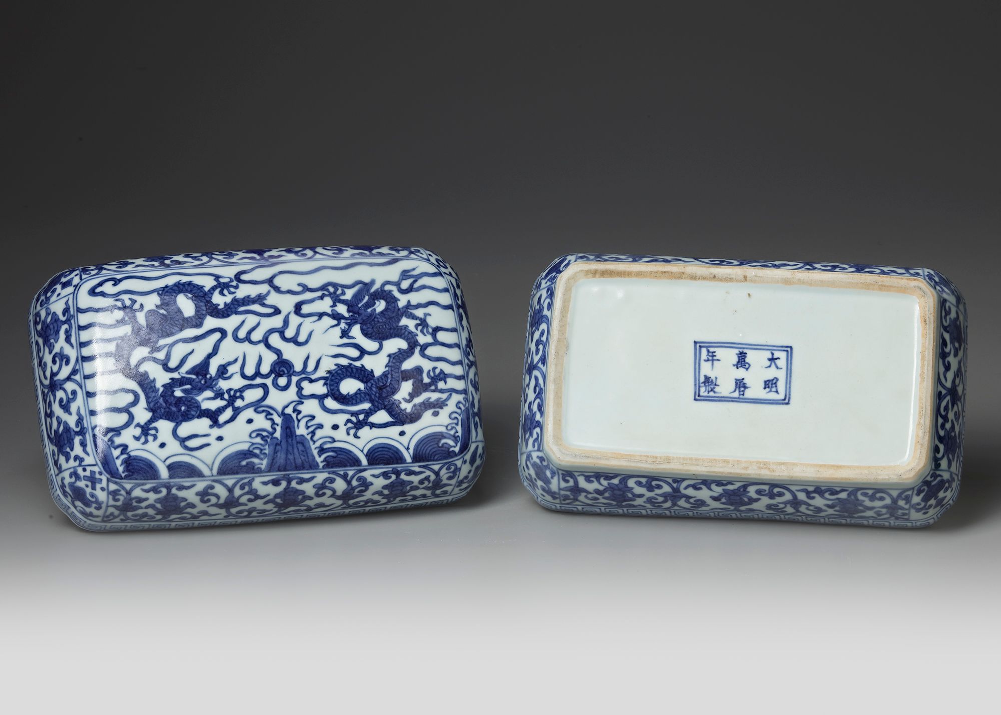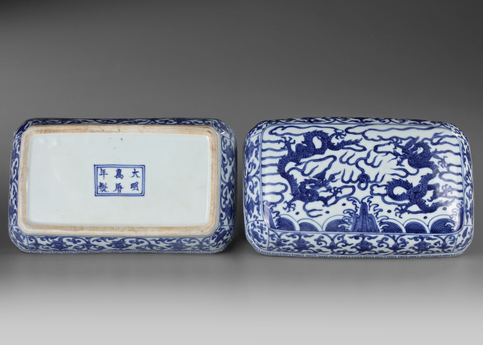 Of rectangular form with canted corners, decorated in vibrant tones of cobalt-blue to the cover with a rectangular panel enclosing two five-clawed dragons in mutual pursuit of a 'flaming pearl' amidst cloud swirls and above rolling waves crashing against rockwork, the rounded sides of the box and cover with stylised peony scrolls at the eight corners, the rims encircled by keyfret band. The bottom with a Chinese Wanli six character mark.