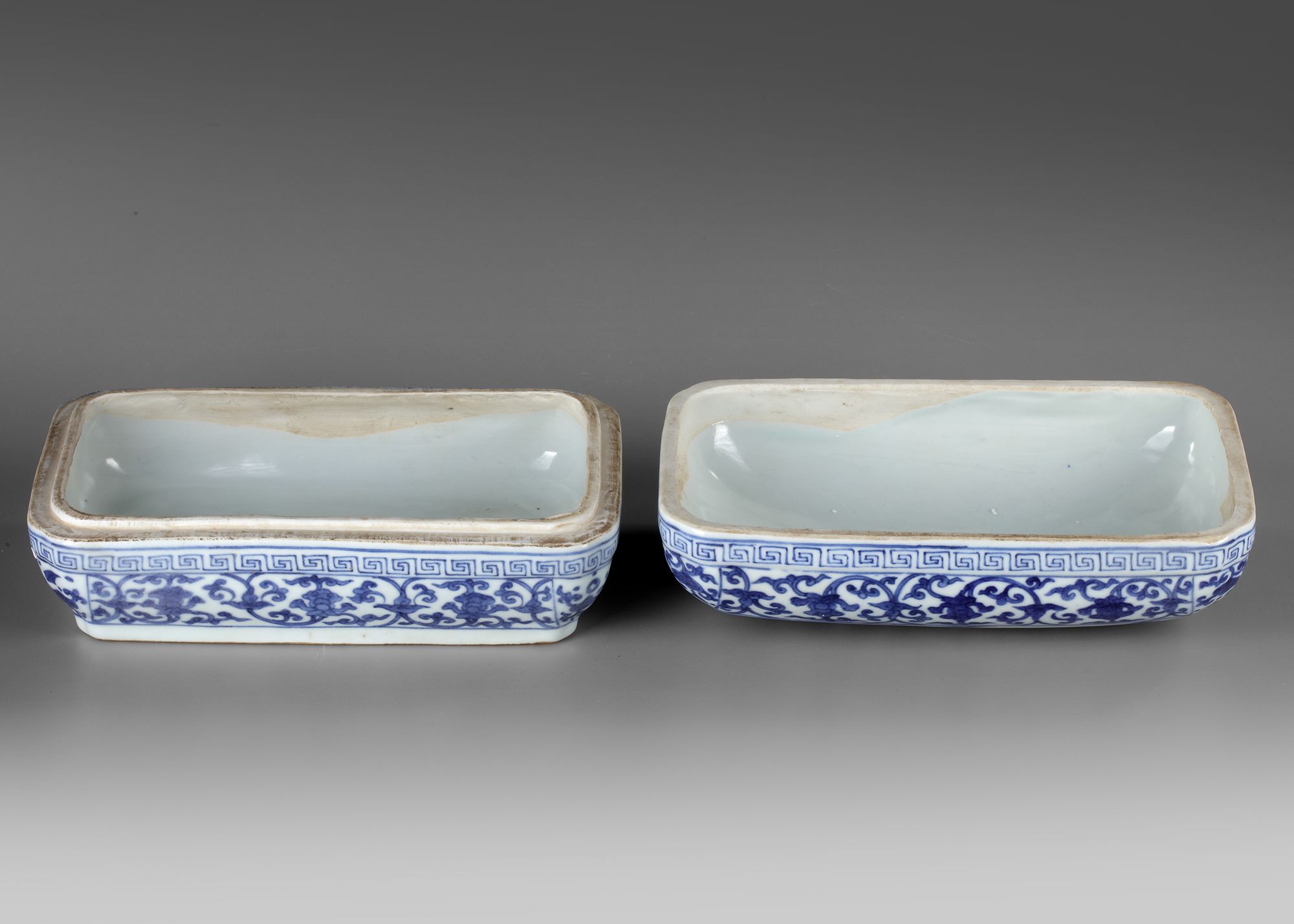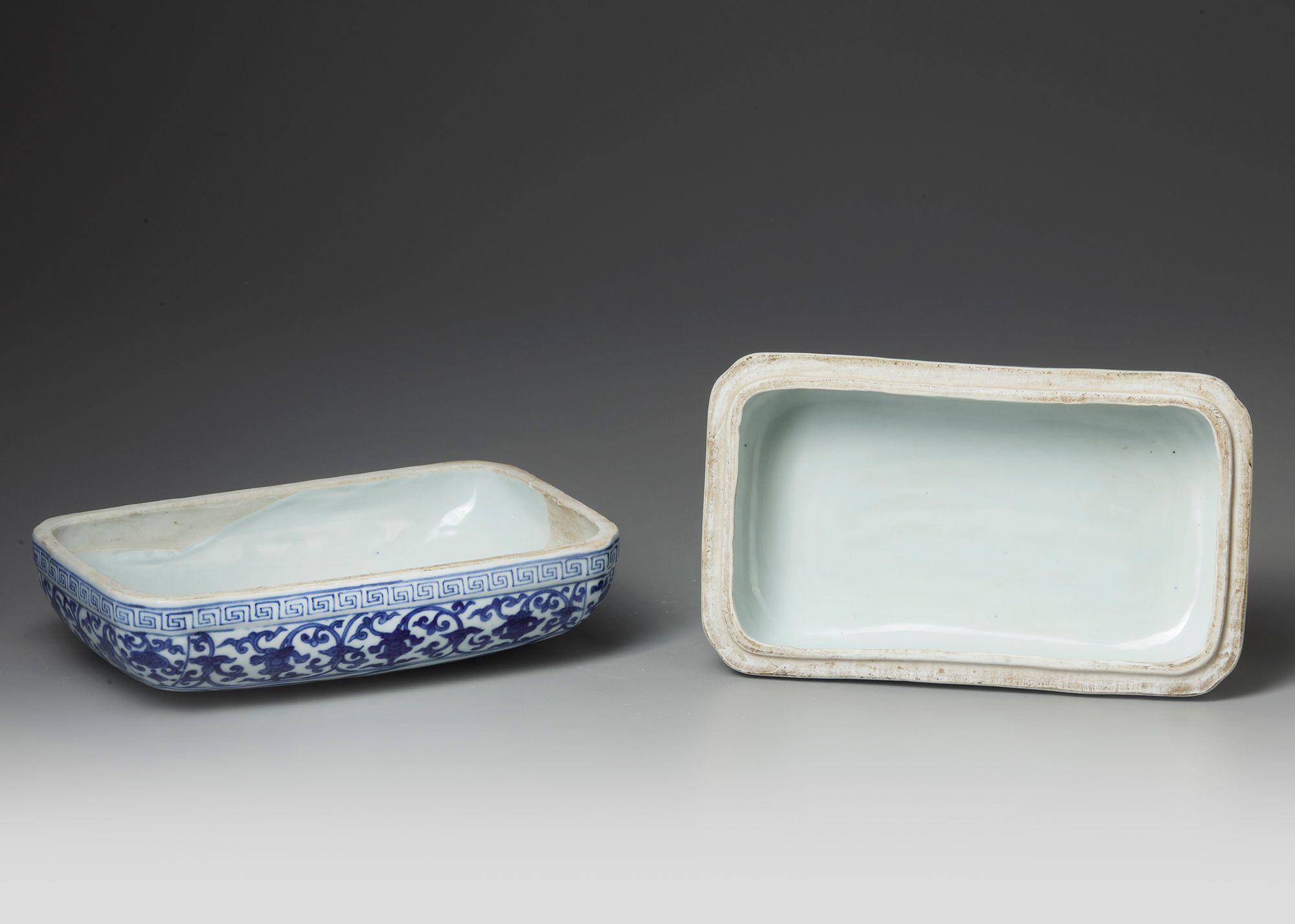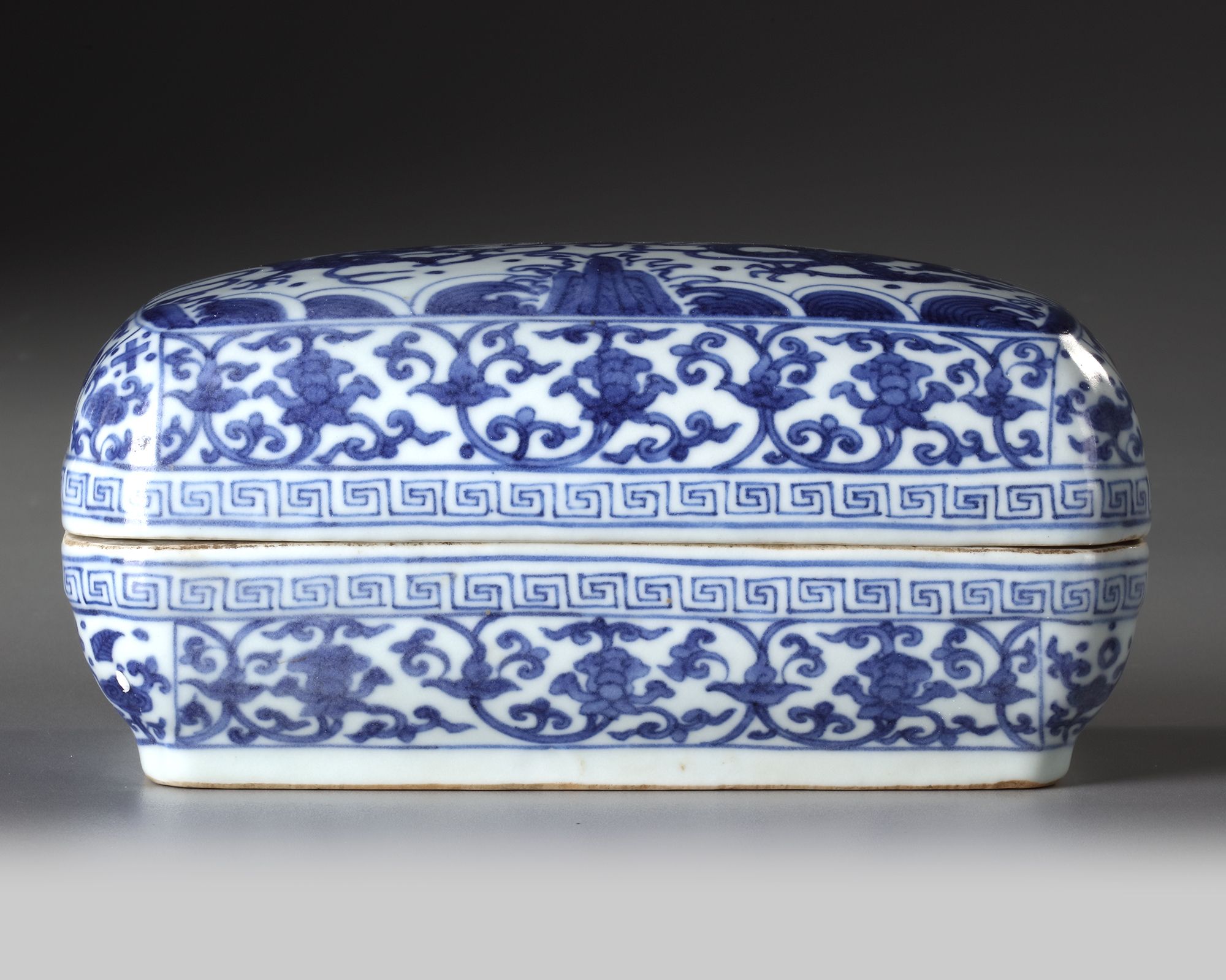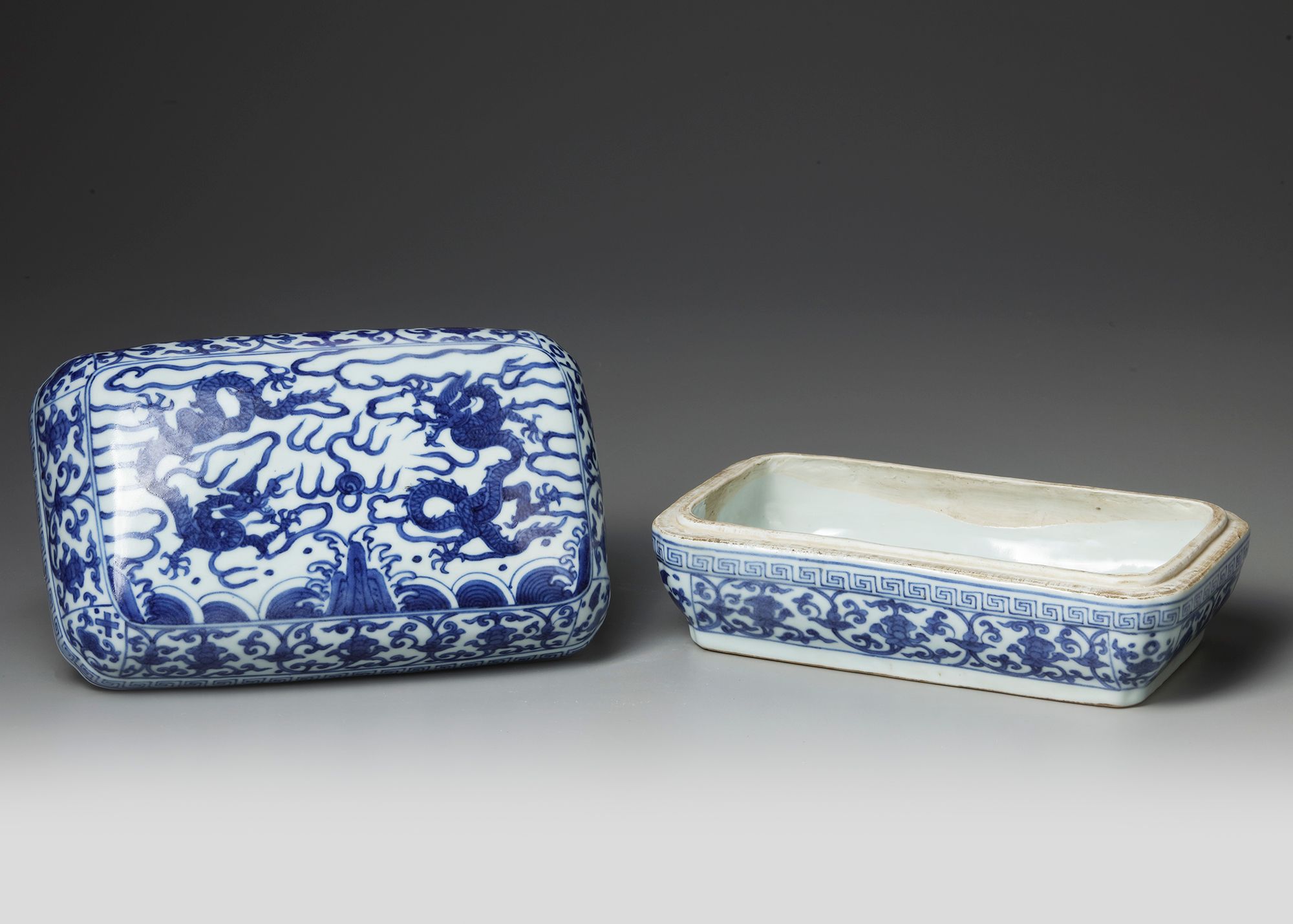 Of rectangular form with canted corners, decorated in vibrant tones of cobalt-blue to the cover with a rectangular panel enclosing two five-clawed dragons in mutual pursuit of a 'flaming pearl' amidst cloud swirls and above rolling waves crashing against rockwork, the rounded sides of the box and cover with stylised peony scrolls at the eight corners, the rims encircled by keyfret band. The bottom with a Chinese Wanli six character mark.