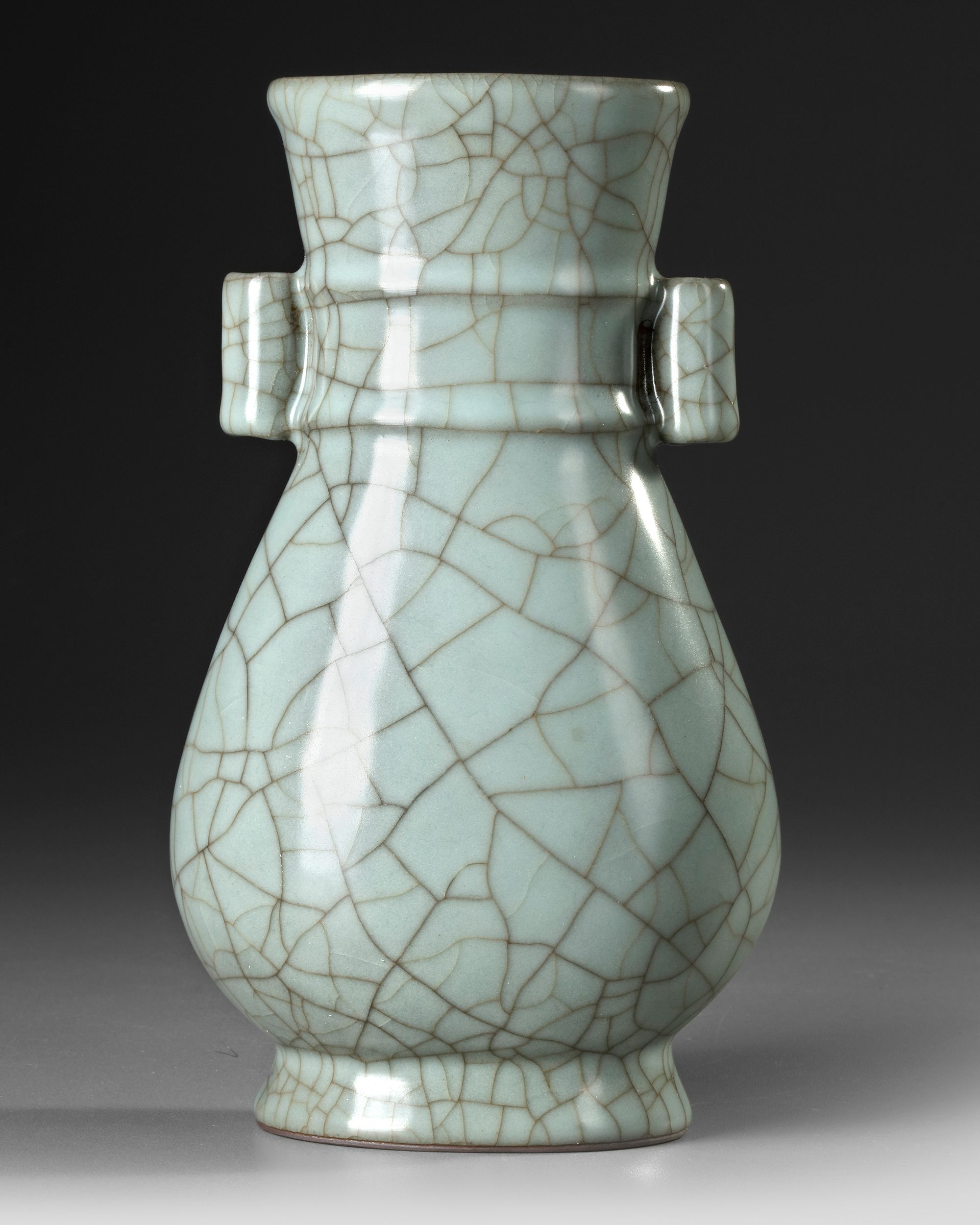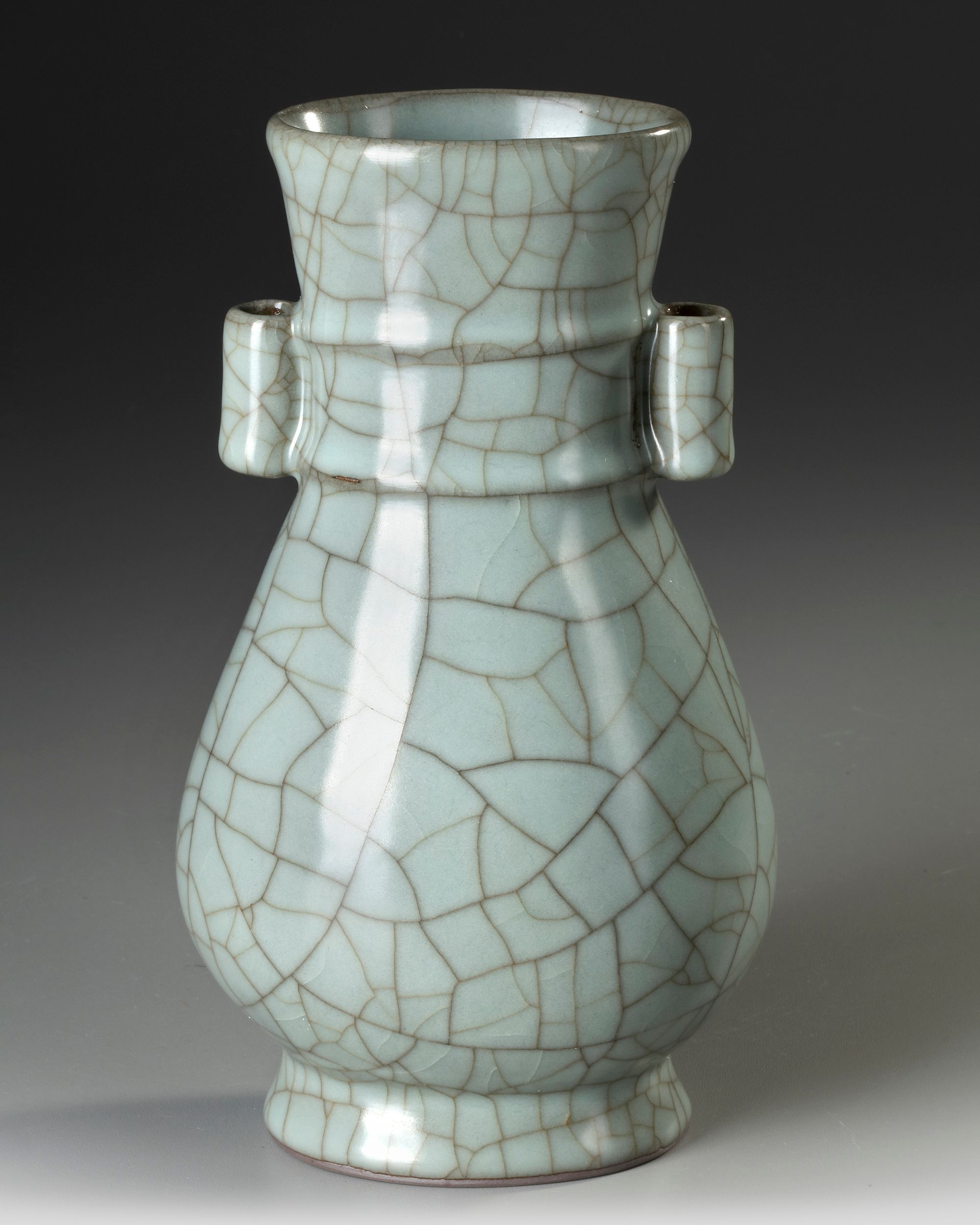 Thinly potted, of pear shape, resting on a slightly flared foot, the tapered neck flanked by a pair of lug handles, covered all over and on the base in a pale creamy glaze suffused with a network of black crackle ('iron wire'), stopping above the foot to expose the dark grey ware burnt pale brown in the firing.