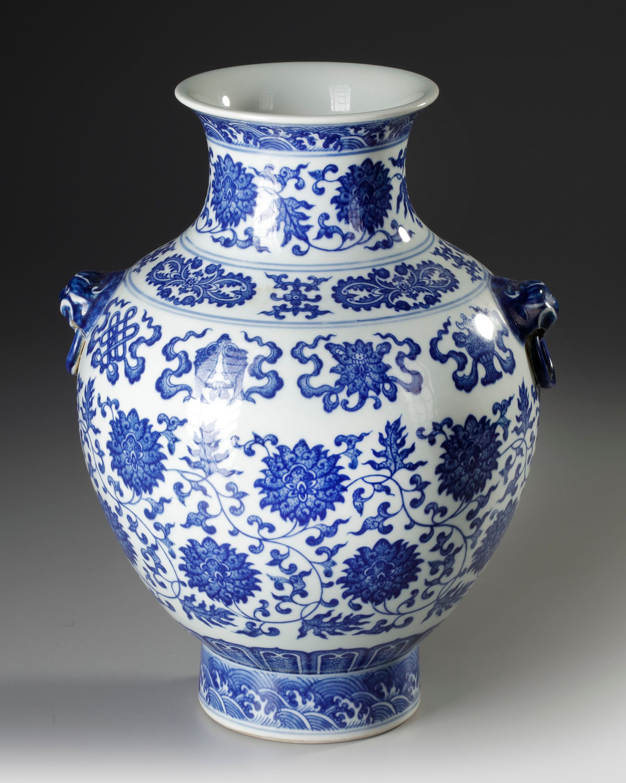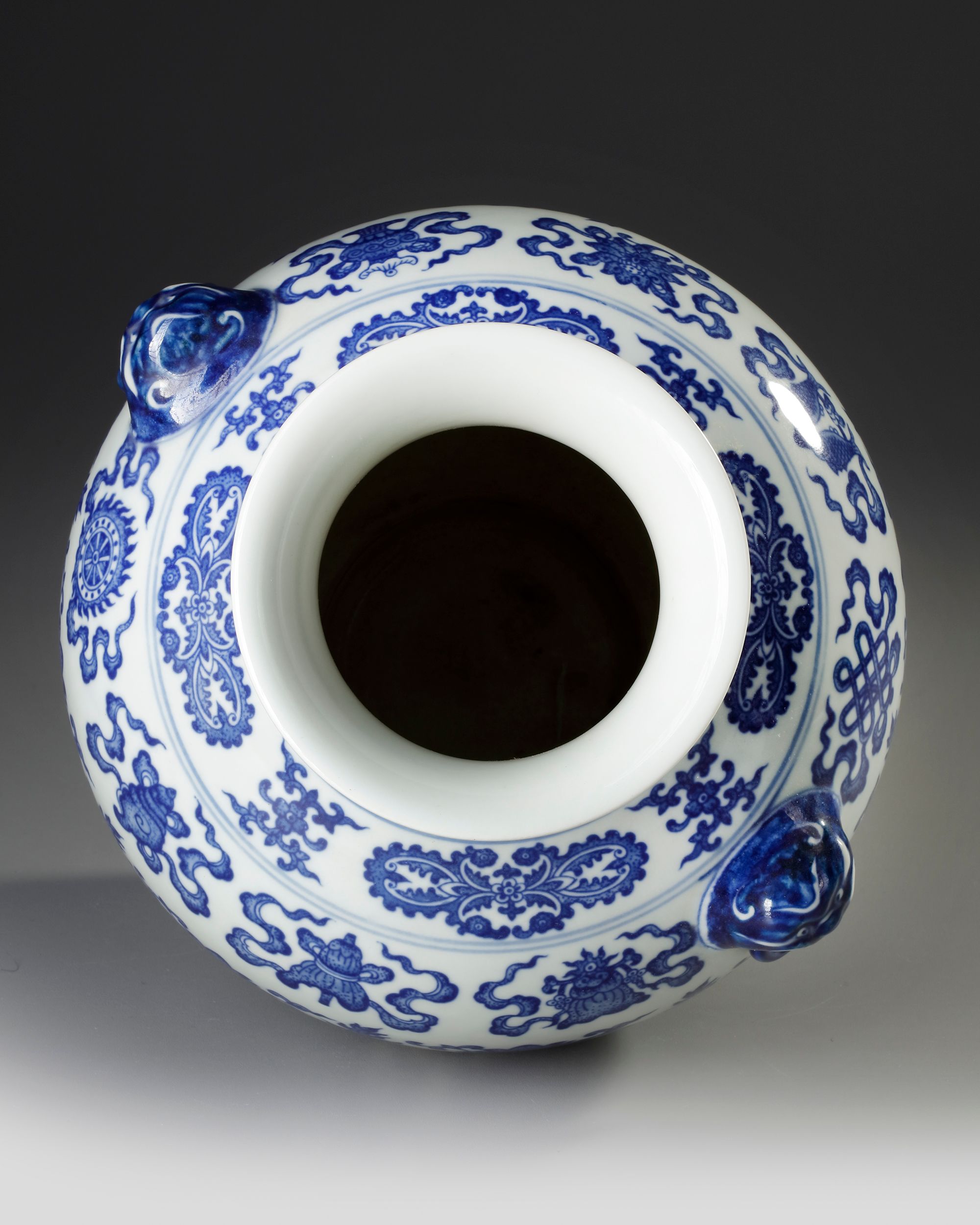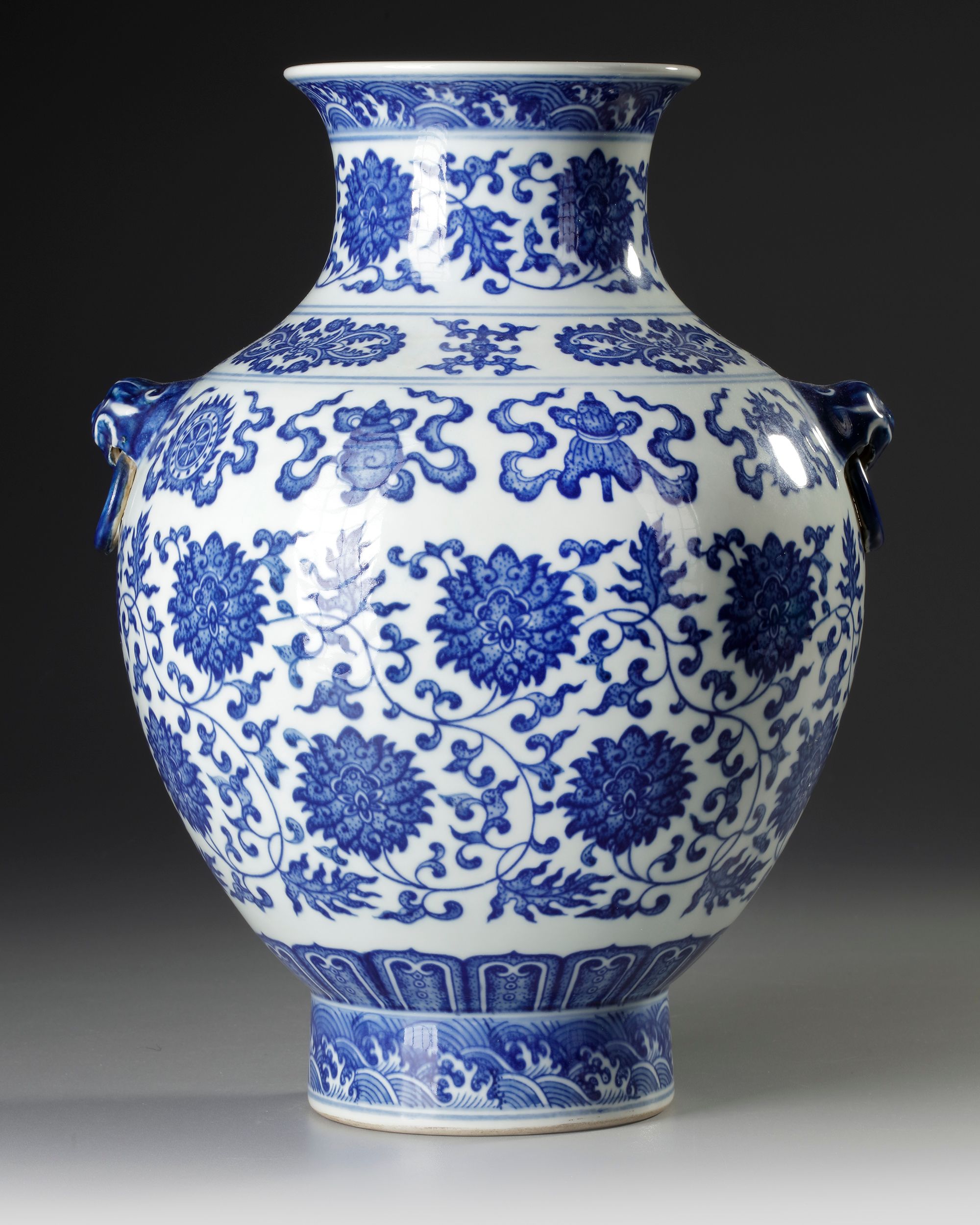 The robust ovoid body supported on a splayed foot, sweeping up to a waisted neck and everted rim, set with two taotie-mask handles suspending mock rings, brightly painted in deep shades of cobalt accented by contrived 'heaping and piling' with a wide band of scrolling lotus, the large blooms borne in an alternating double register with the upper row each supporting one of the beribboned bajixiang, the neck encircled by a band of quatrefoil crenulated motifs divided by flower sprigs and further wrapped with a lotus scroll, the base skirted with petal panels, all between a band of tumultuous waves encircling the rim and foot, The bottom with a Chinese Qianlong seal mark.