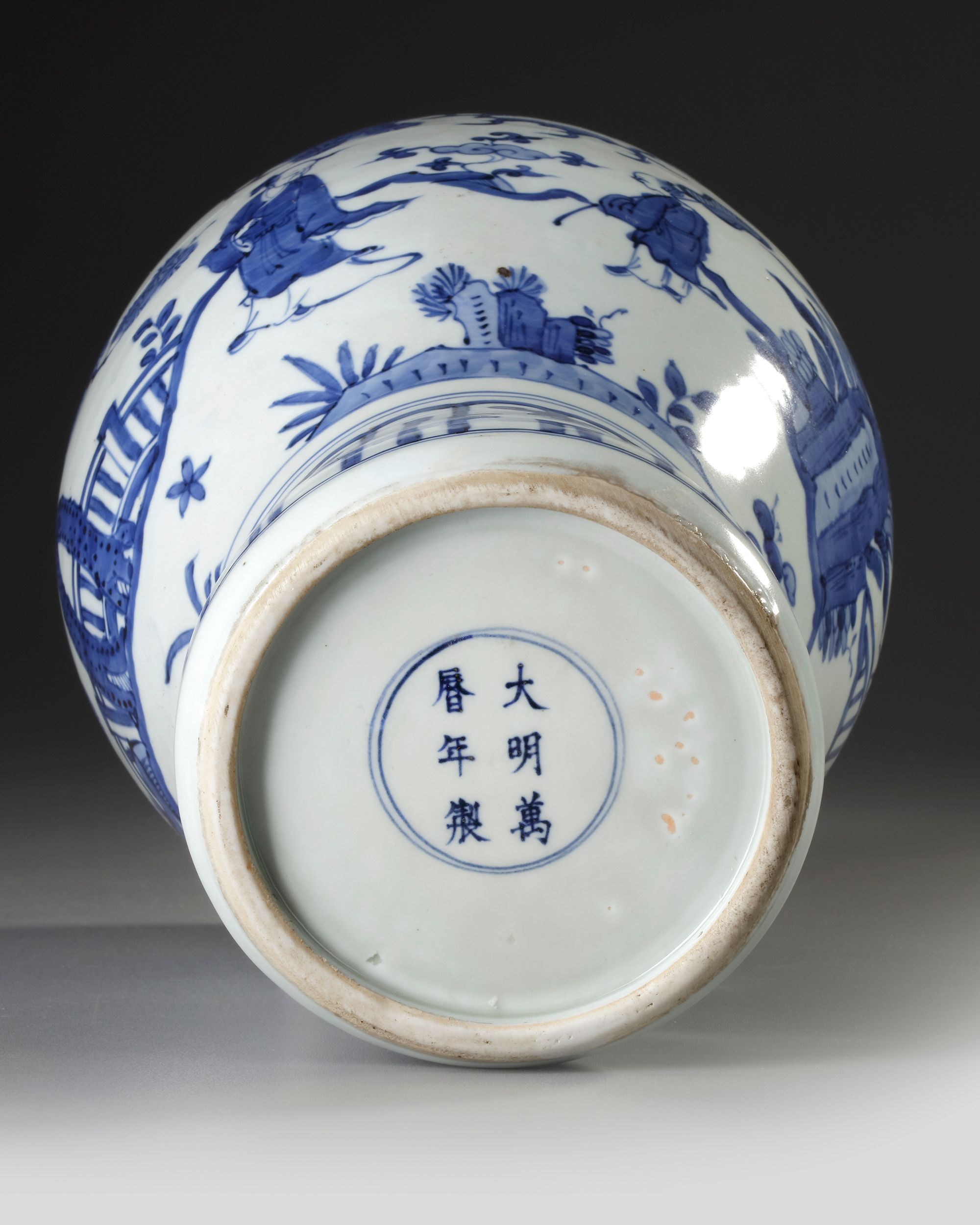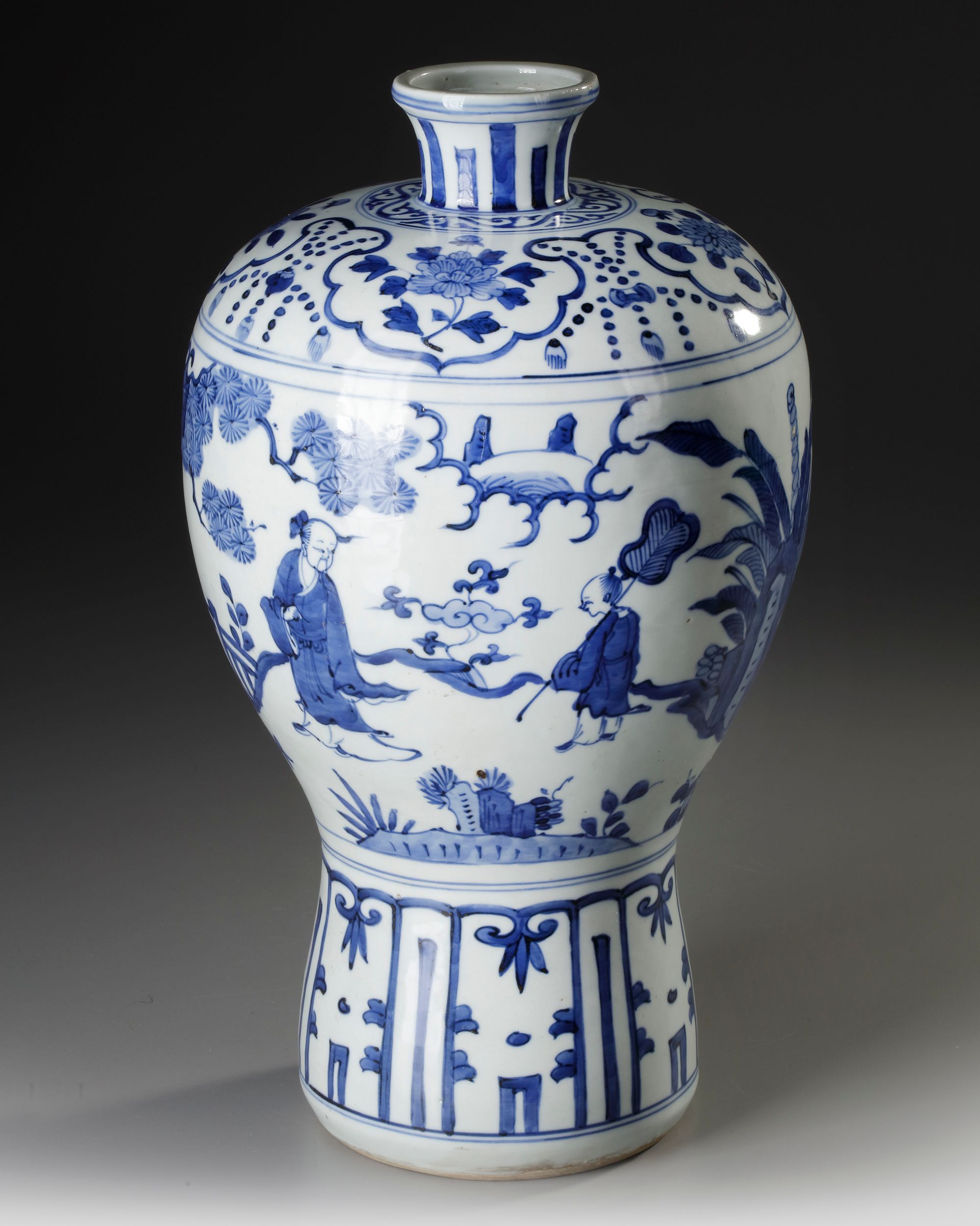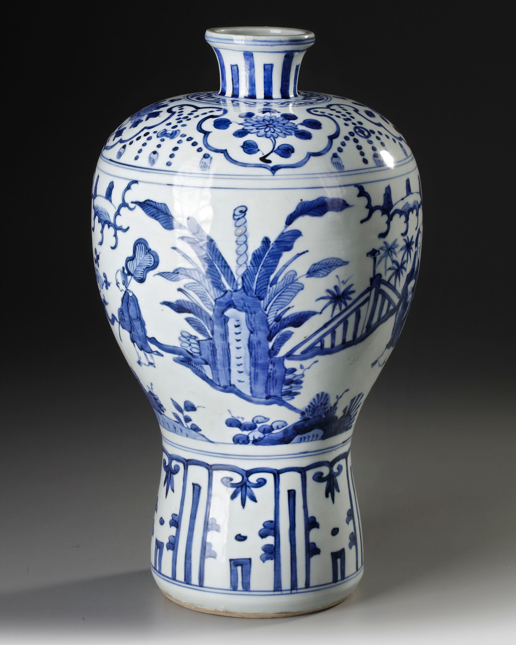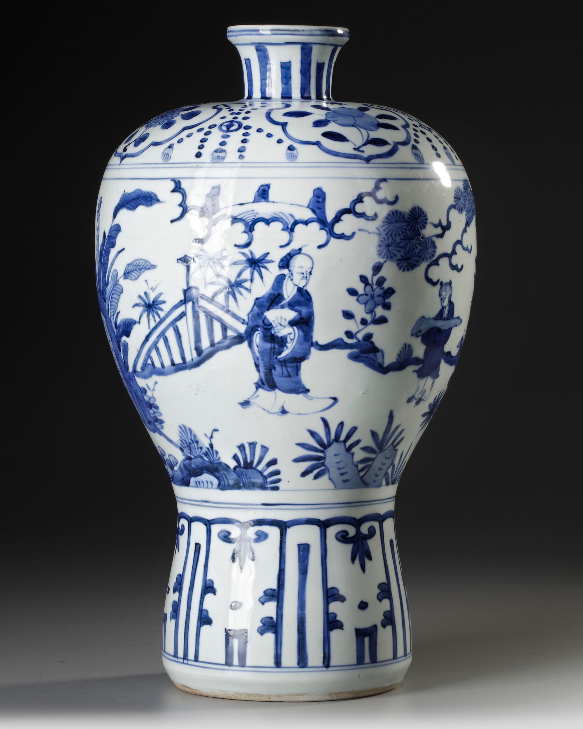 A Chinese porcelain meiping vase, decorated in cobalt-blue with a continuous scene of scholars and servants, with pine and bamboo trees in a landscape. The bottom with a Chinese Wanli six character mark.