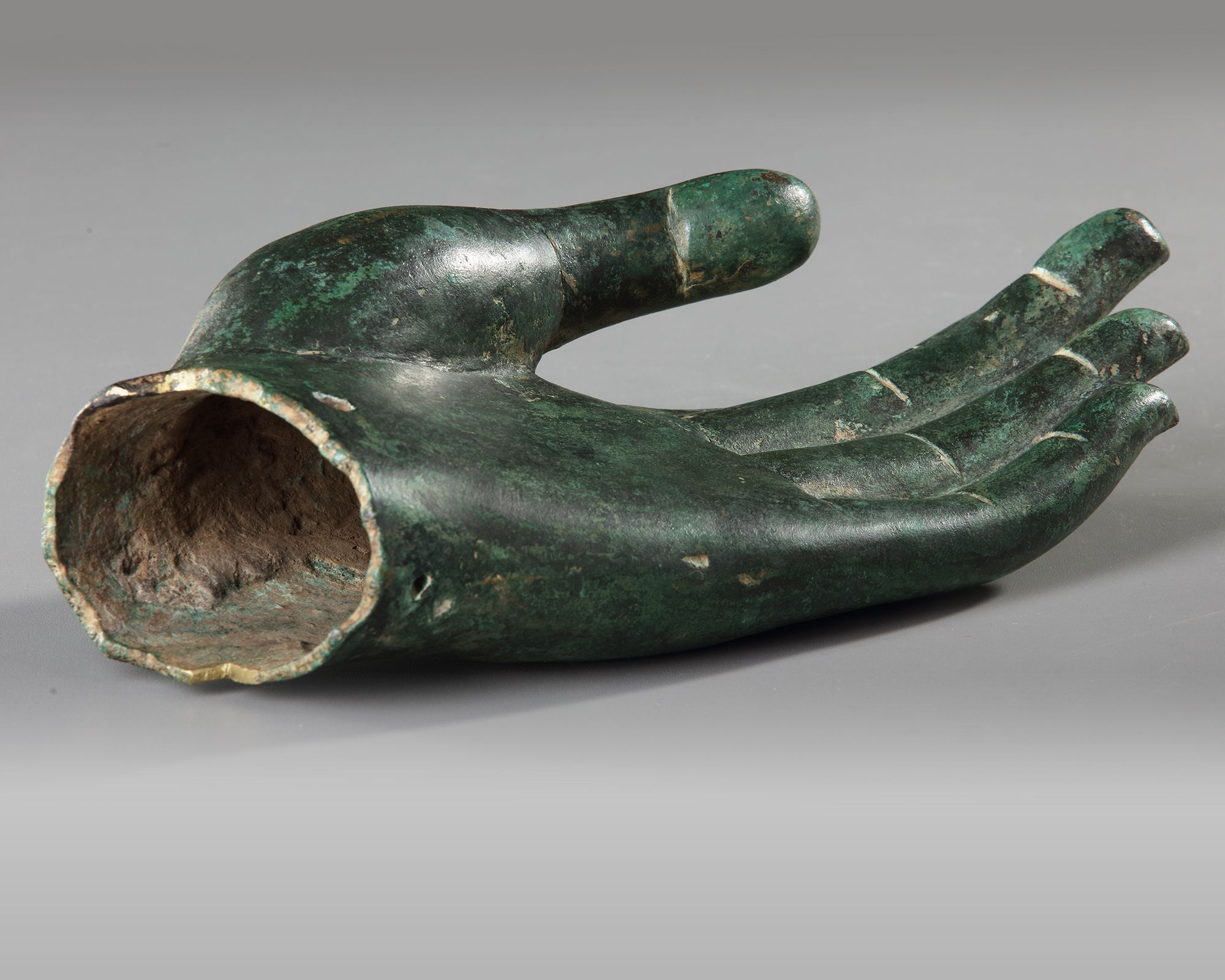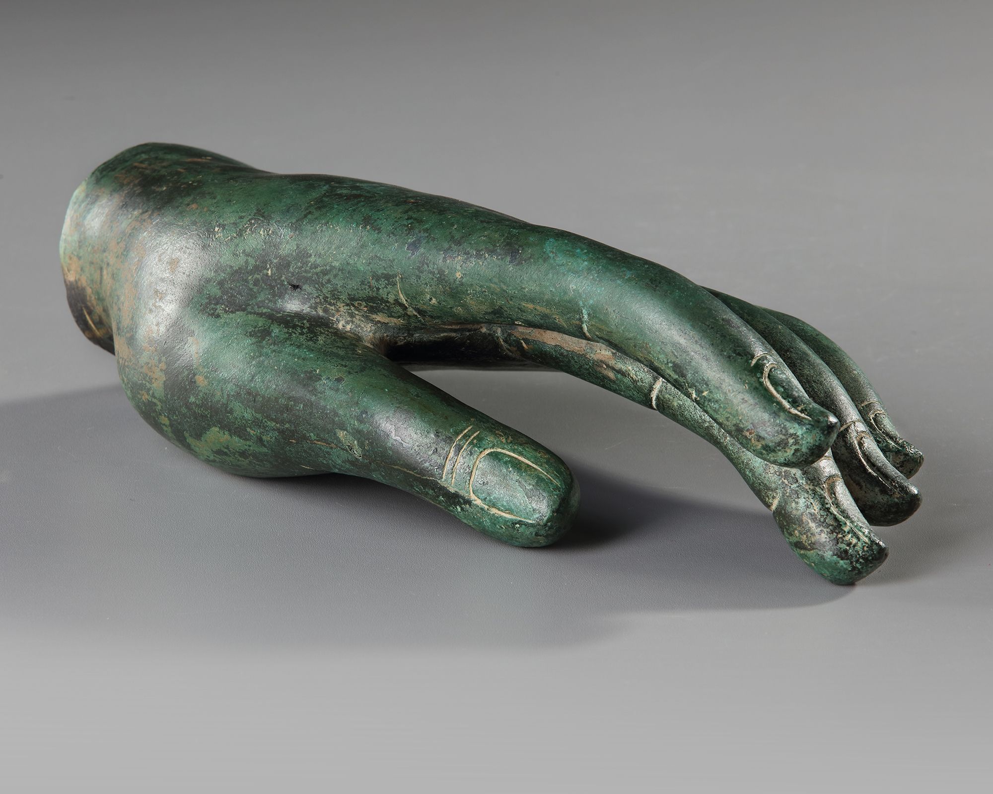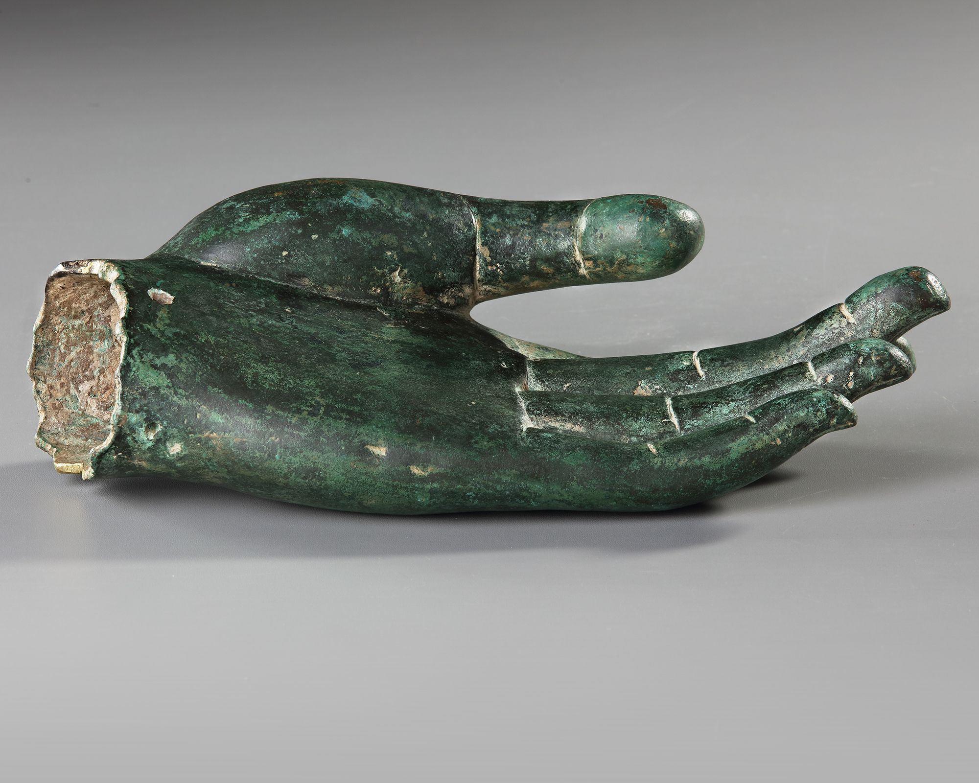 A Chinese bronze sculpted hand, probably from a Buddhist statue. Length: 28 cm.