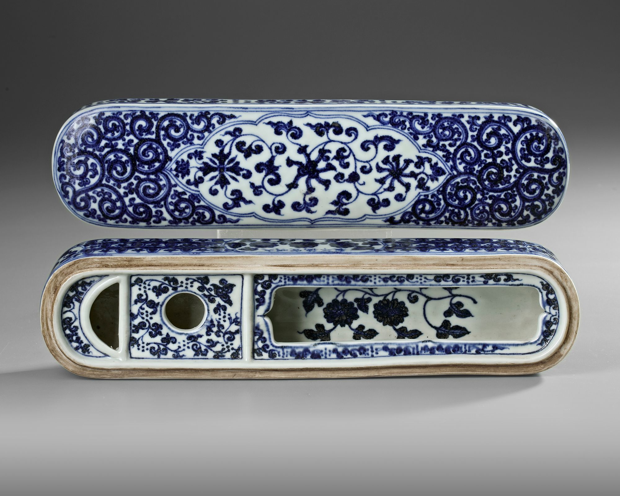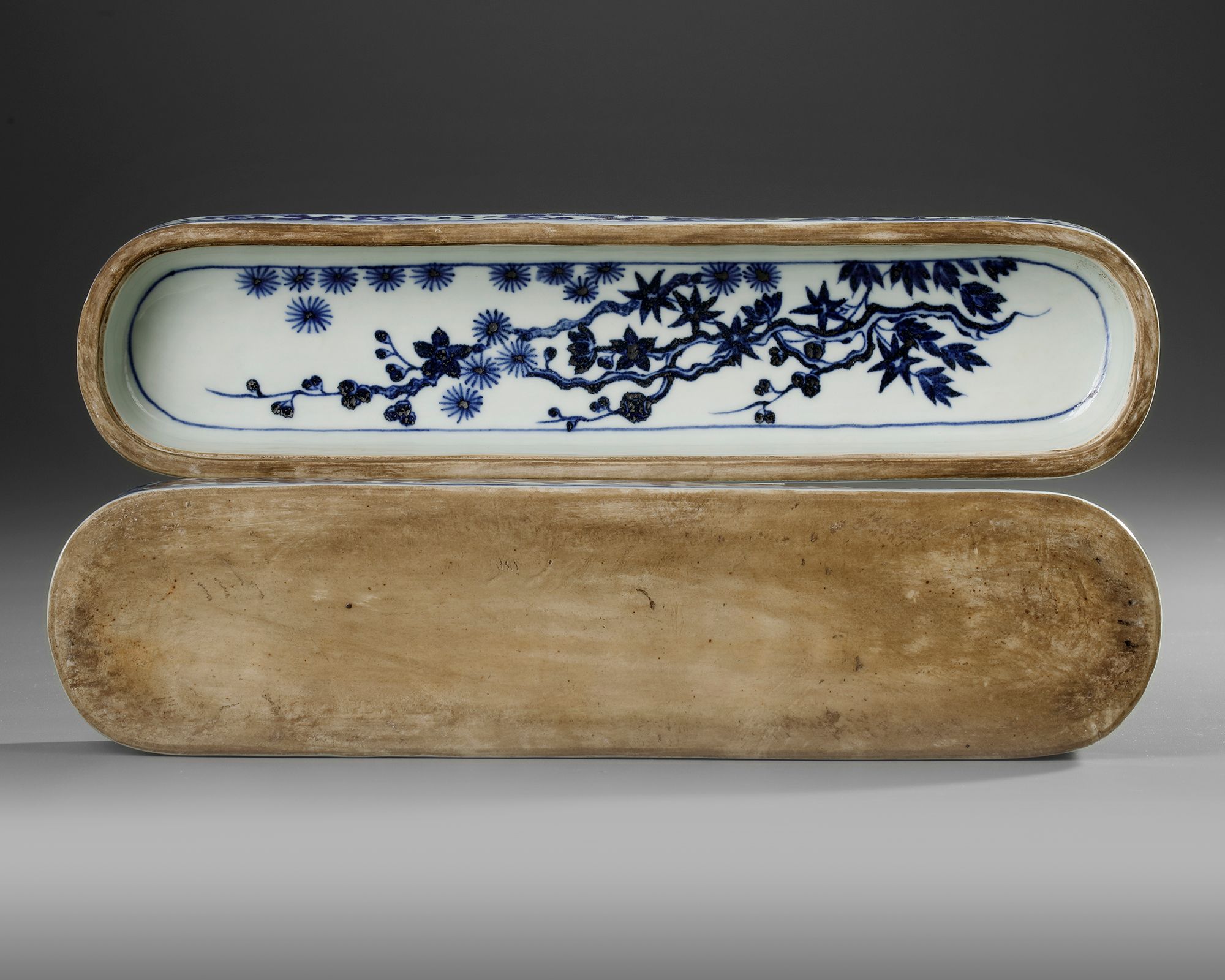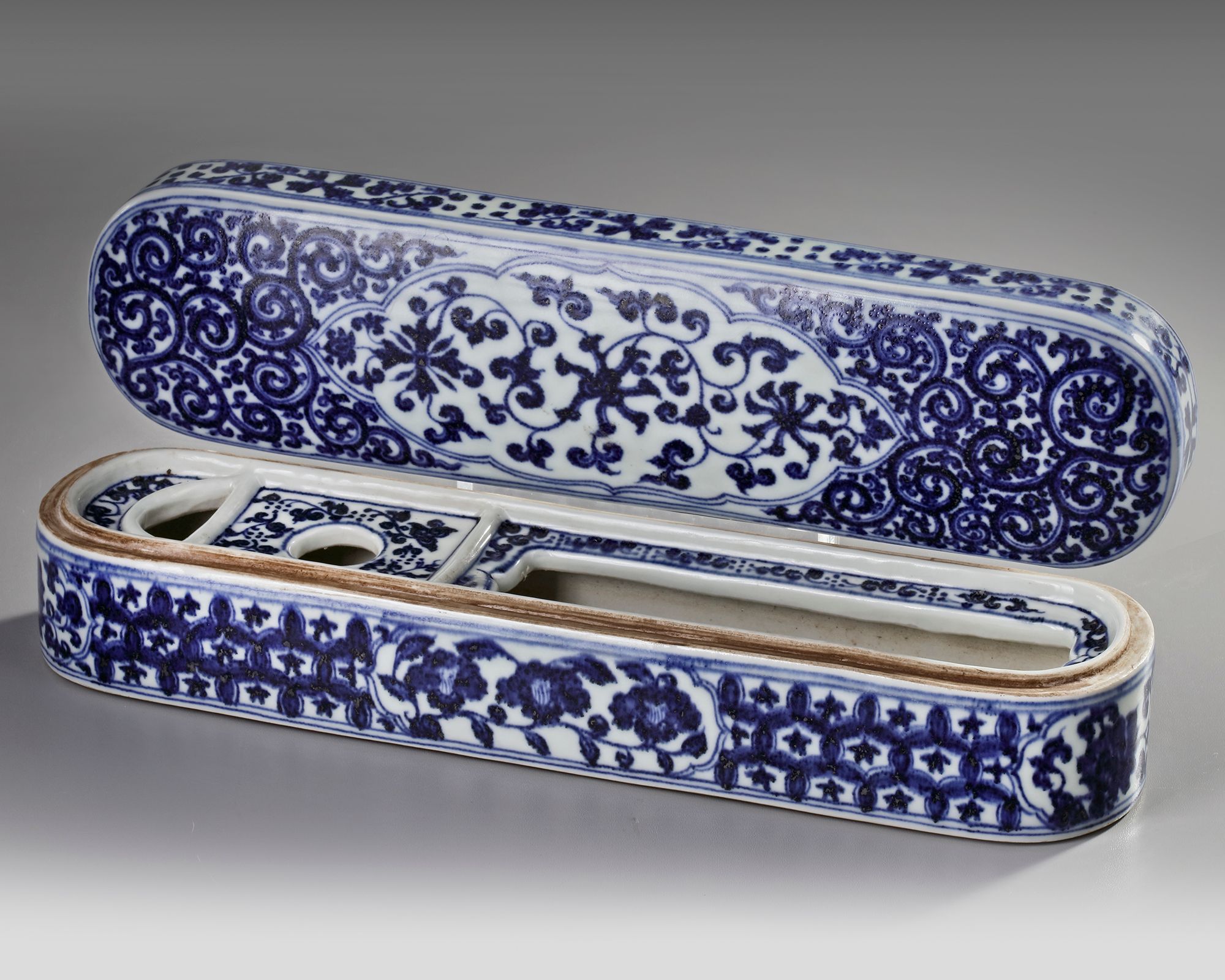 The cover is decorated with a shaped panel enclosing floral scrolls, all reserved on ground of dense 'golden horn' scrolls. The underside of the cover is decorated with the Three Friends of Winter (pine, prunus, and bamboo). The box base is decorated with four cartouches enclosing scrolling flowers, all reserved on a honeycomb ground, the side with a Xuande mark. The interior is modelled with a separate porcelain inkwell and apertures for other writing implements.