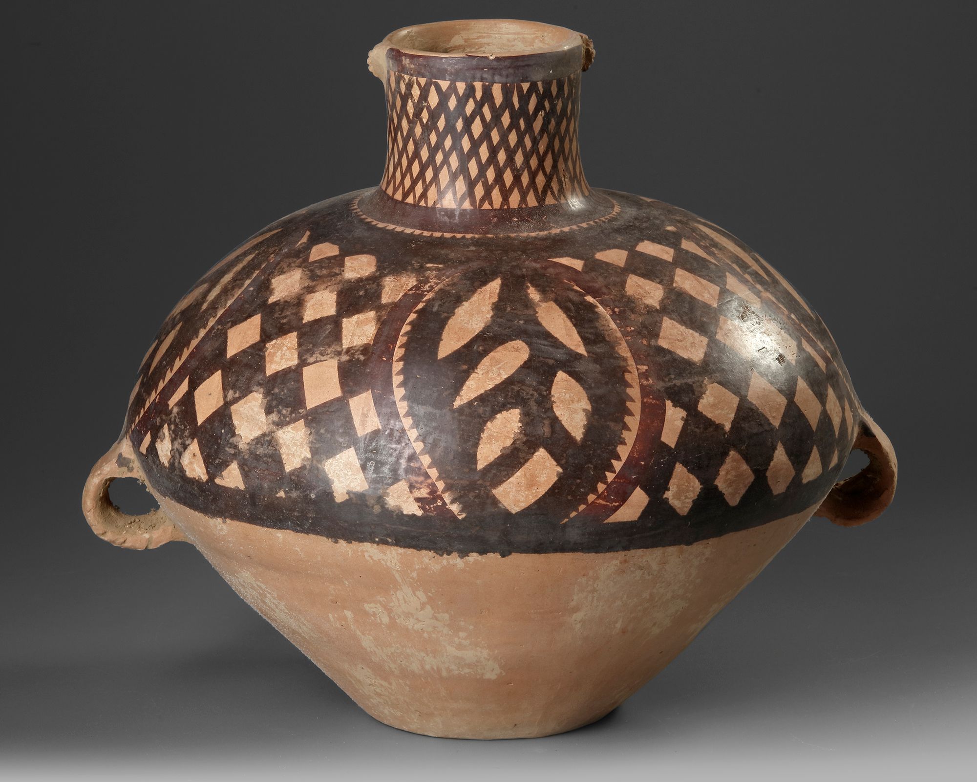 The compressed globular jar with two loop handles is painted on body in black with a fishnet pattern enclosing leaf shaped designs. Height 25 cm.