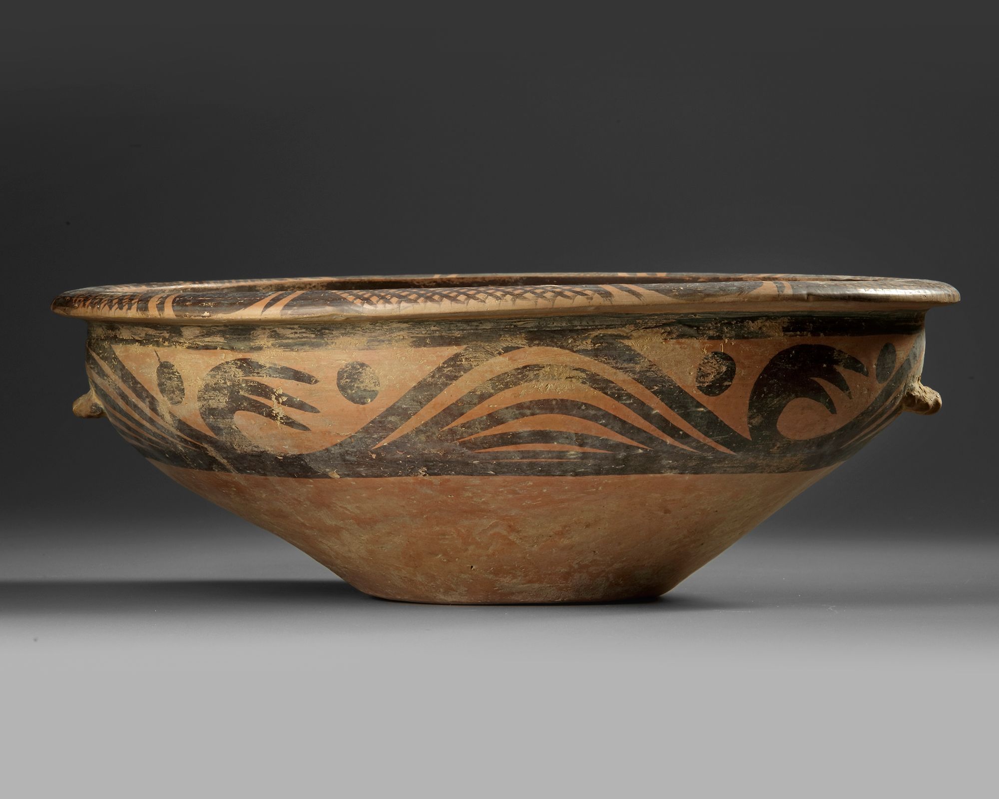 The conical lower sides rising from a flat circular foot and rounded and incurving toward the everted rim, the interior smooth, and finely burnished, and painted with three oval roundels amidst net patterns and geometric designs.