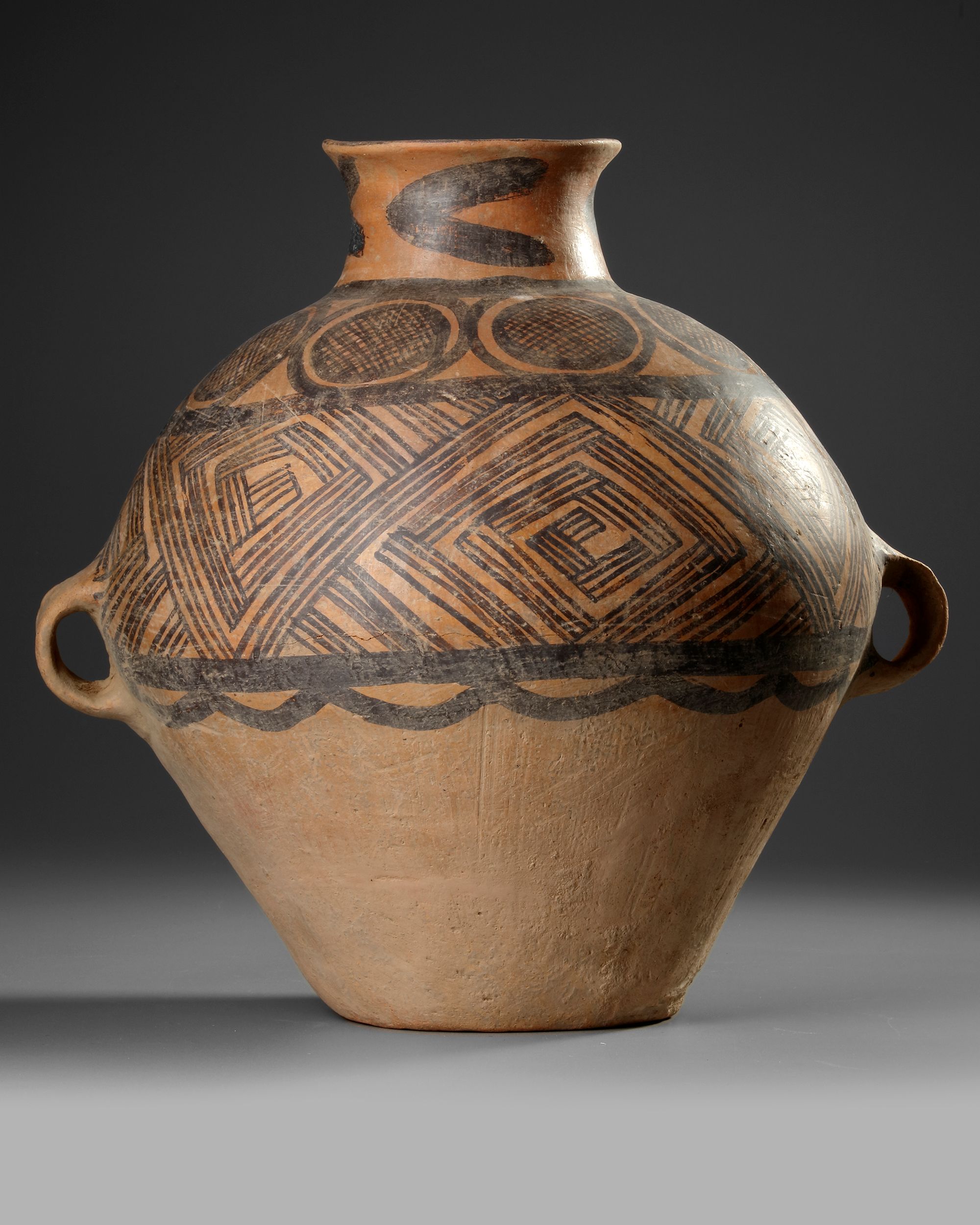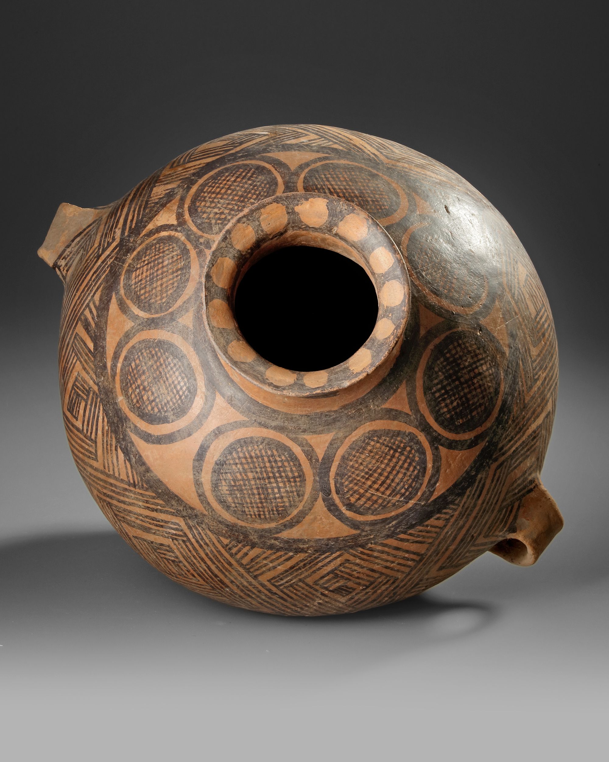 The compressed globular jar with two loop handles is painted on body in black with two bands enclosing fishnet patterns. Height 35 cm.