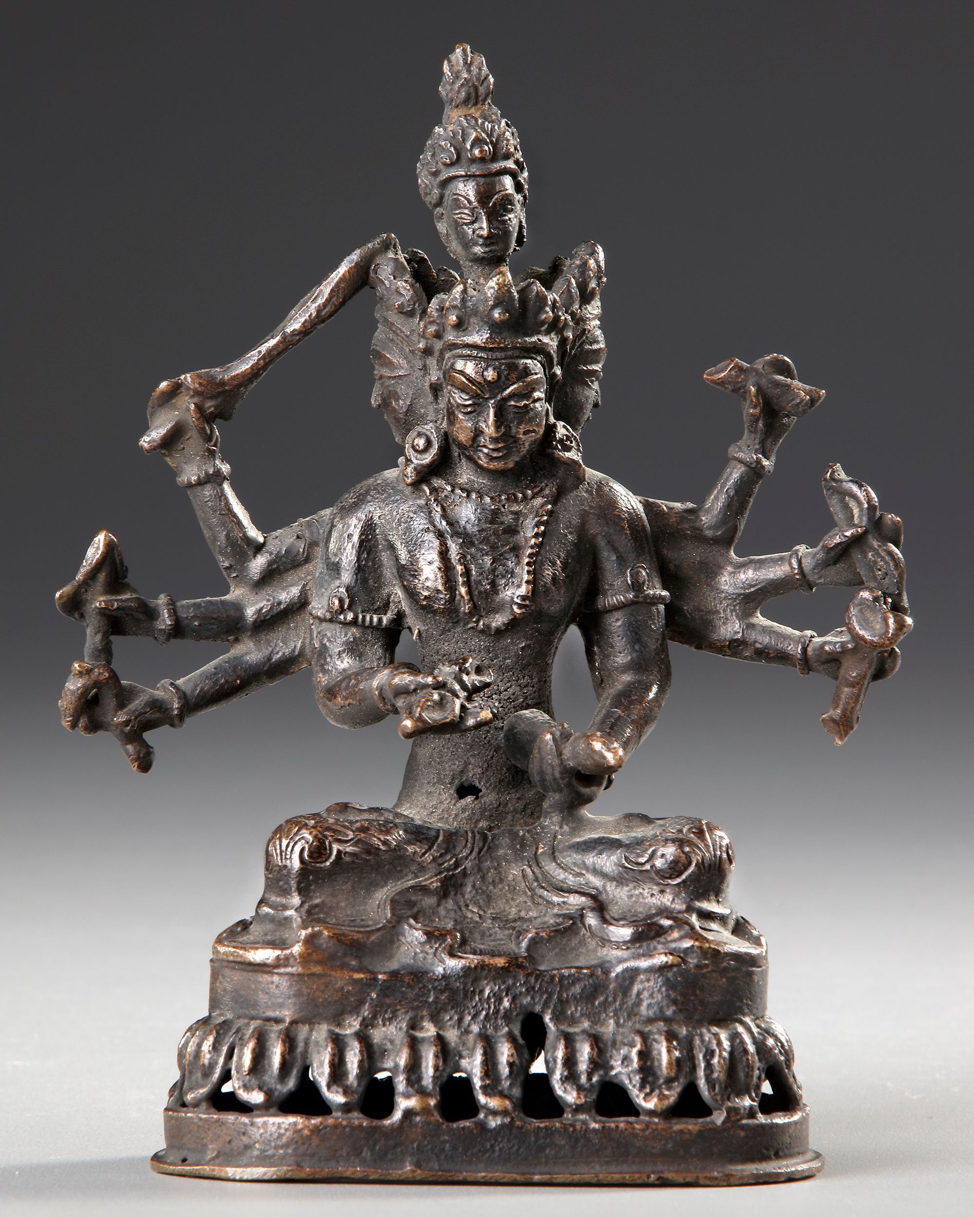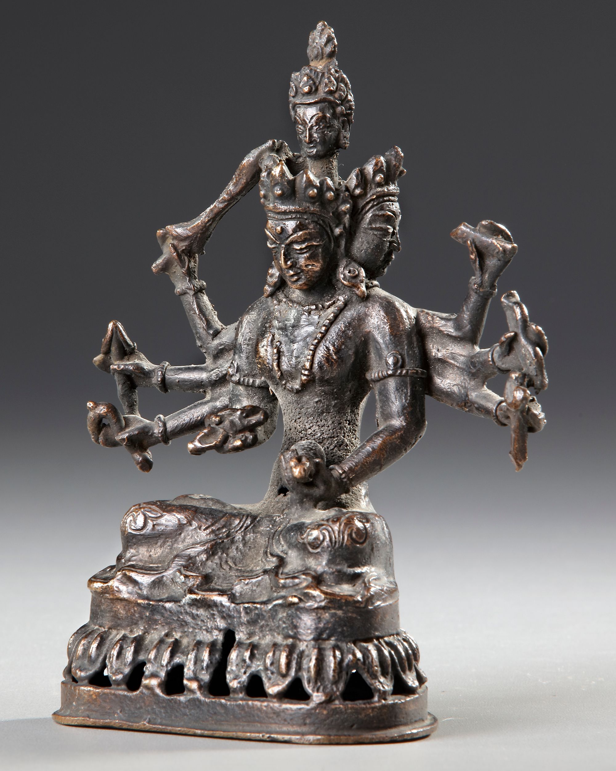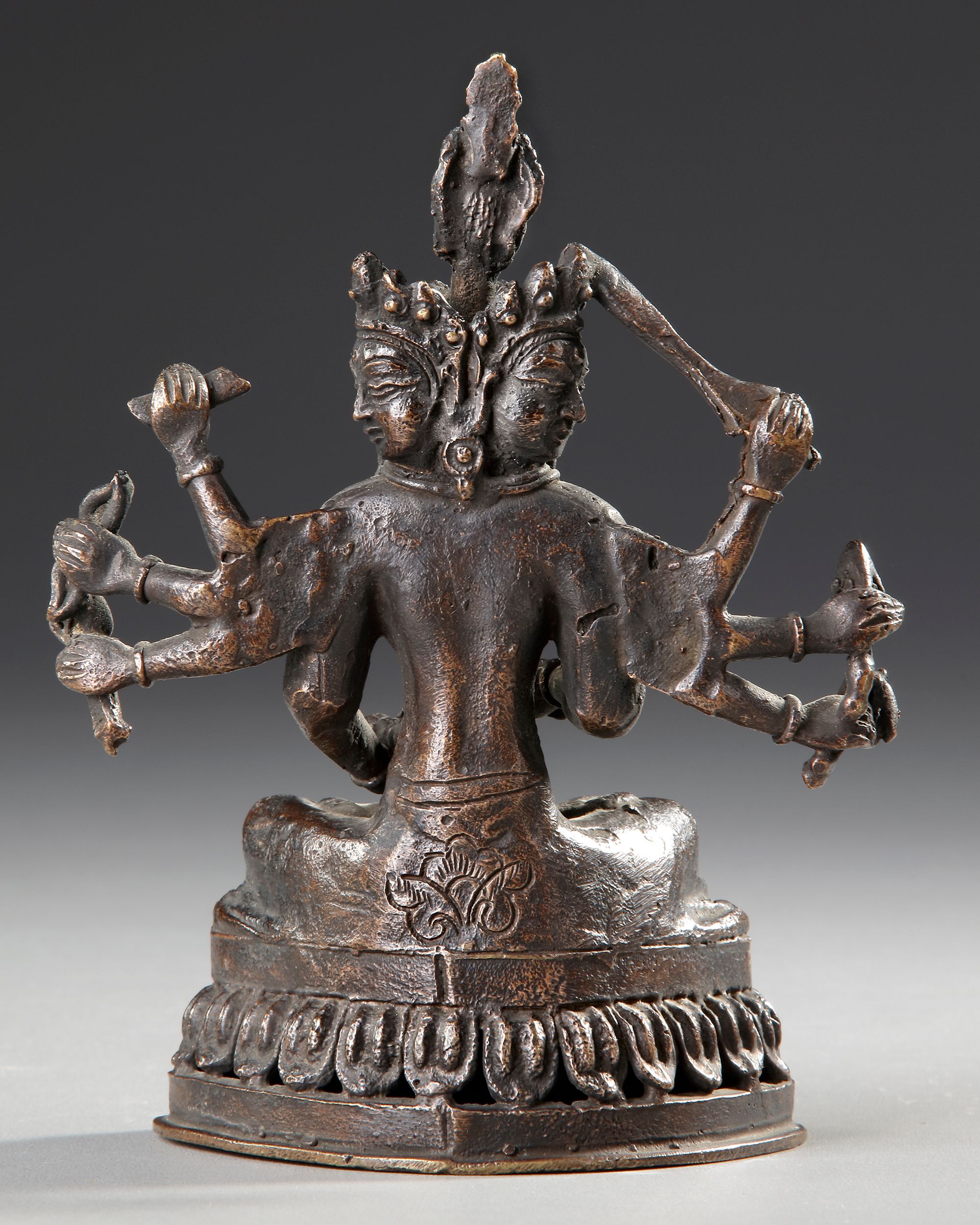 The eight-armed and three-headed deity seated in dhyanasana on a lotus base, clad in a short dhoti secured with a beaded belt, wearing a sash, sacred thread, and beaded necklaces, armlets and foliate crown, the faces with benign expressions, with a a fourth head at top.