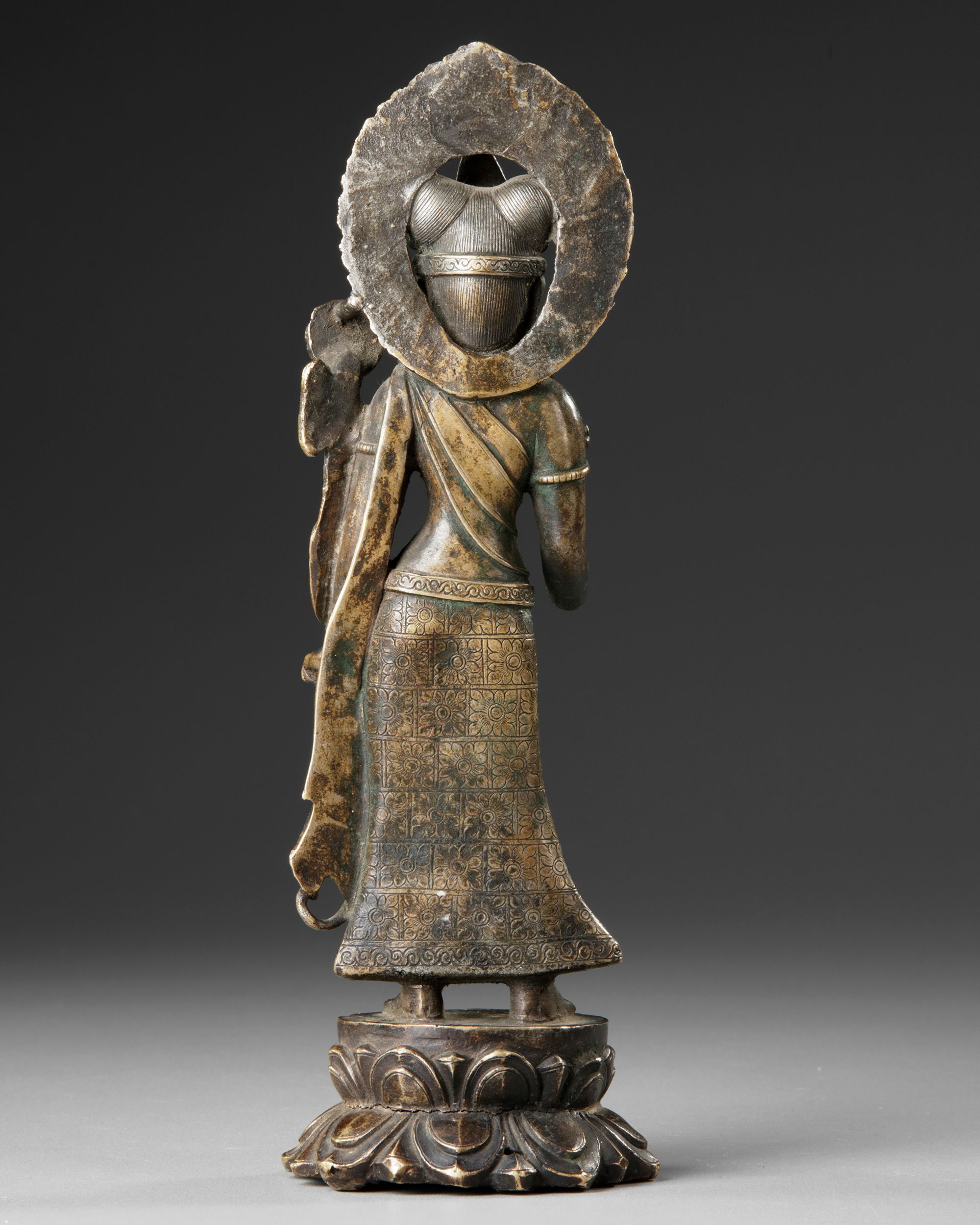A Nepalese bronze tar standing in tribhanga on a double lotus stand, with serene expresssion, elongated ears and holding a flowering stem.