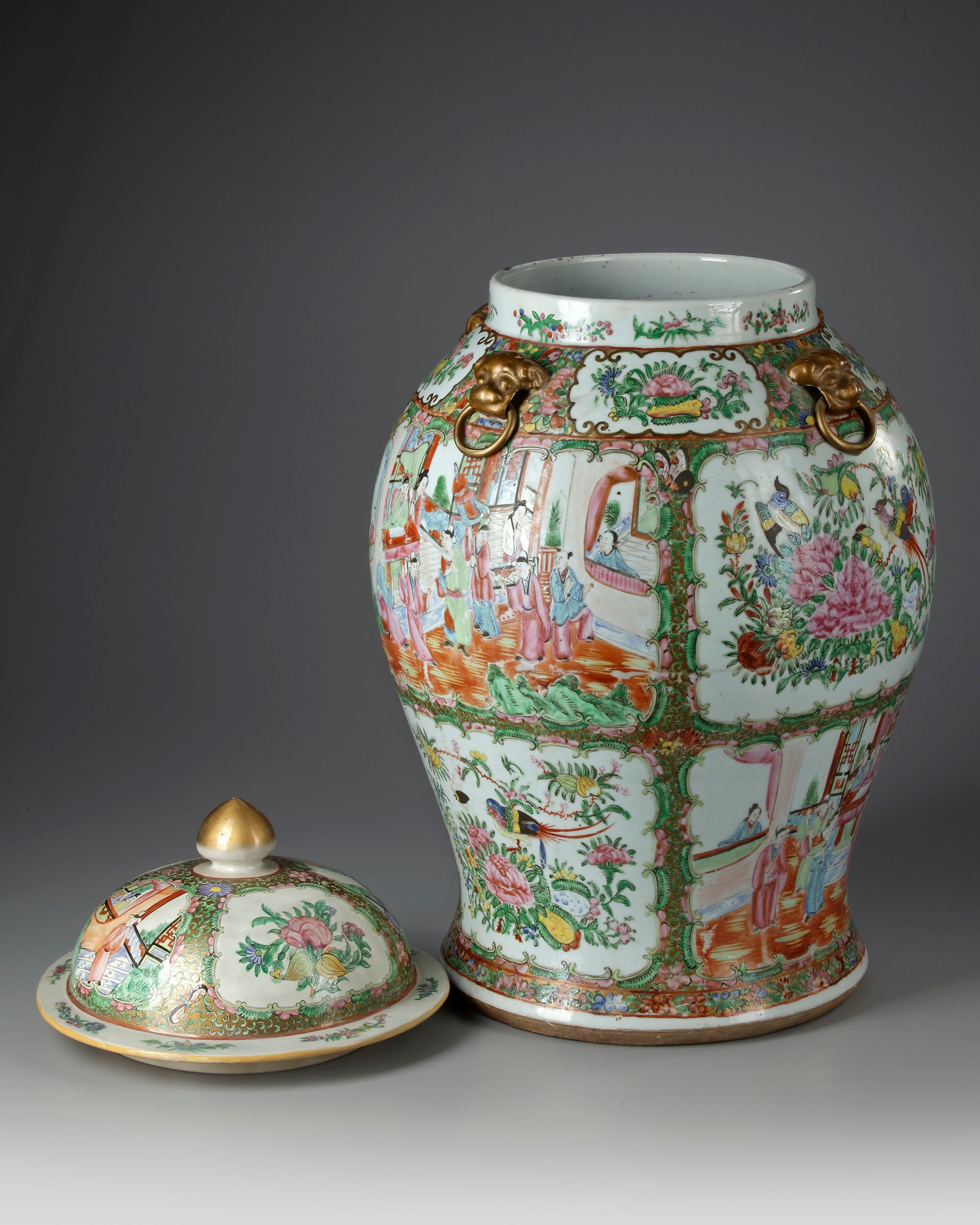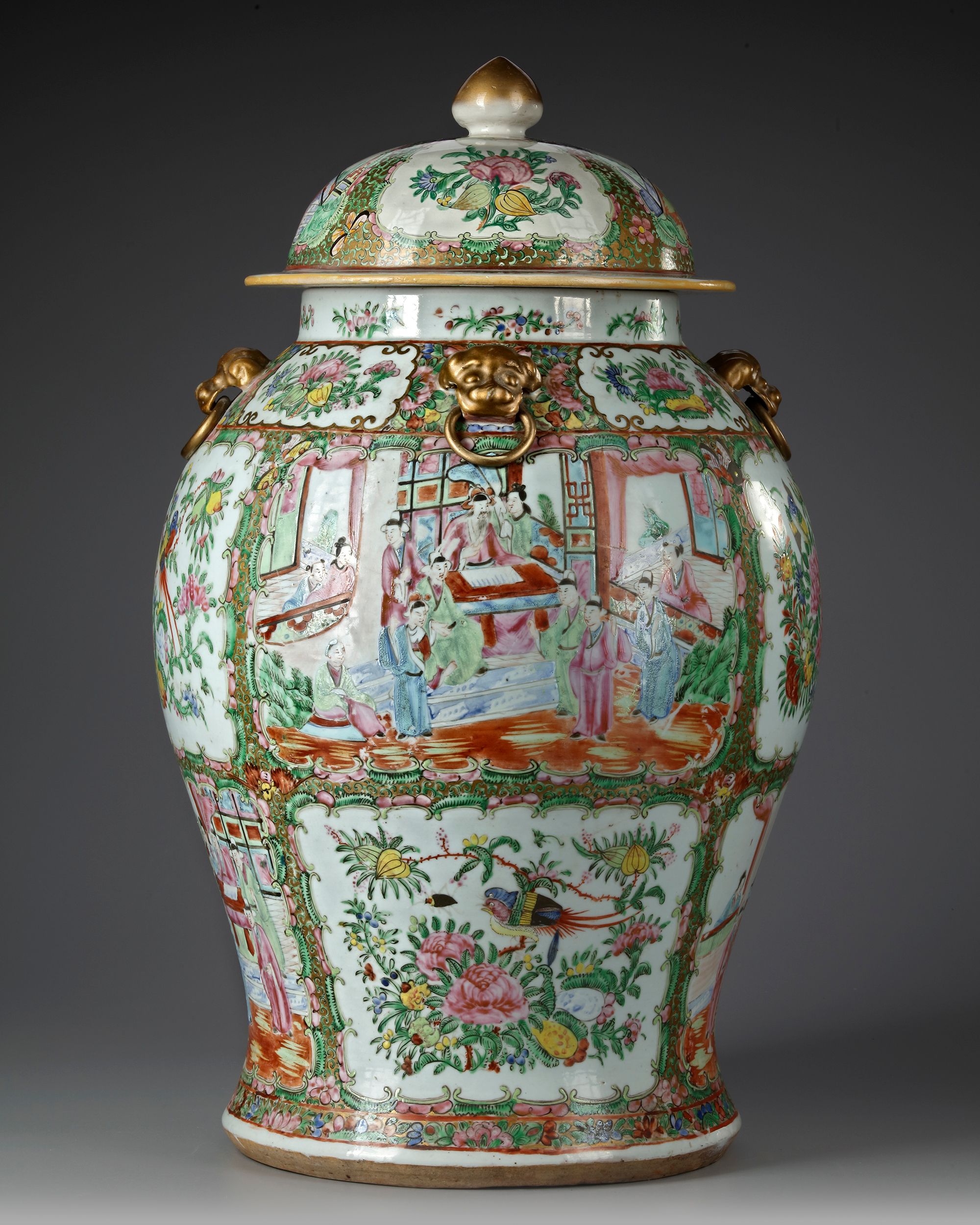 A Chinese porcelain vase stylised with four gilt Fo lions heads handles with rings, enameled with panels of court scenes and birds perched amongst peonies blossoming branches, divided by flower scrolls, the gilt domed cover similarily decorated.