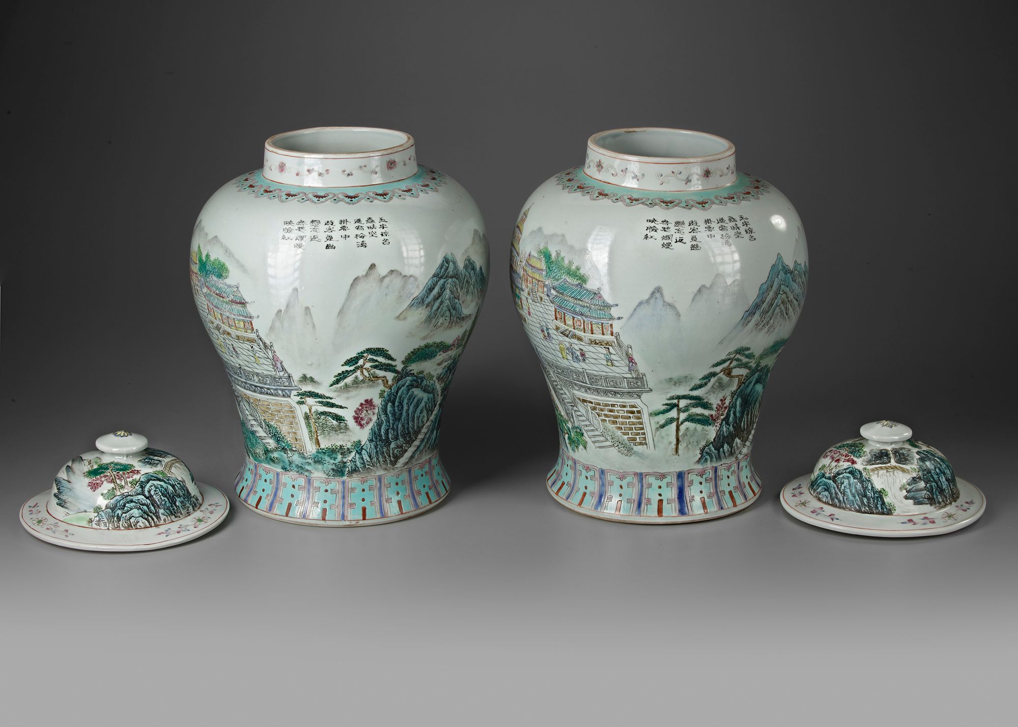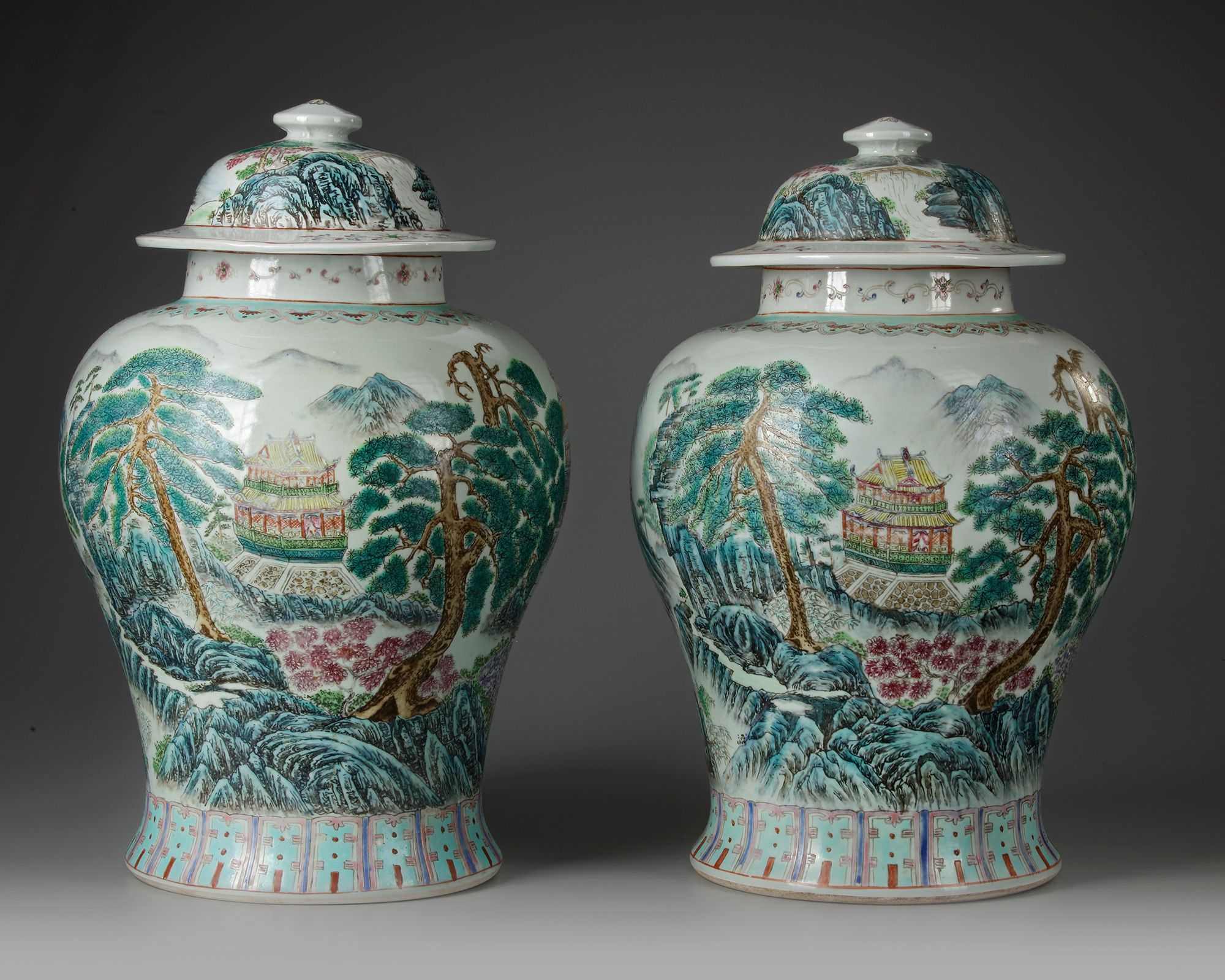 A pair of Chinese porcelain vases, decorated in famille rose enamels with a continous scene of figures on terrace in large houses and amongst pine trees in a mountinous landscape, set between a band of ruyi heads to the shoulders and a petal lappet border to the base, the covers similarily decorated.