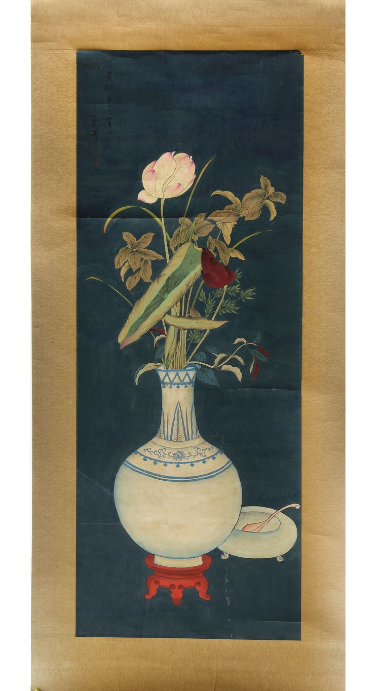 Ink and colour on paper, depicting a vase filled with flowers and a censer. 76 by 152 cm