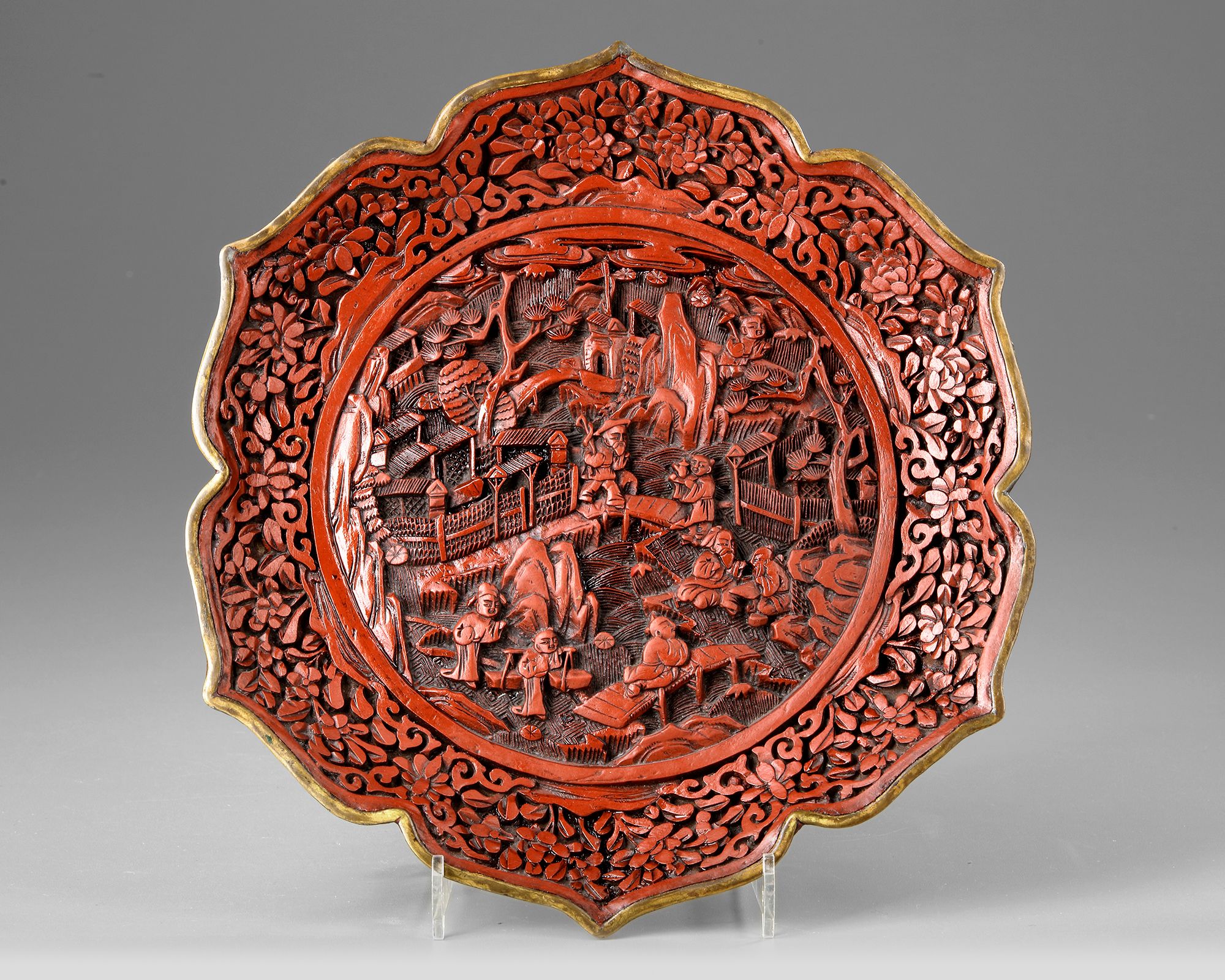 The dish is carved through layers of red lacquer depicting with boys at play in a landscape with houses. Diameter: 23 cm
