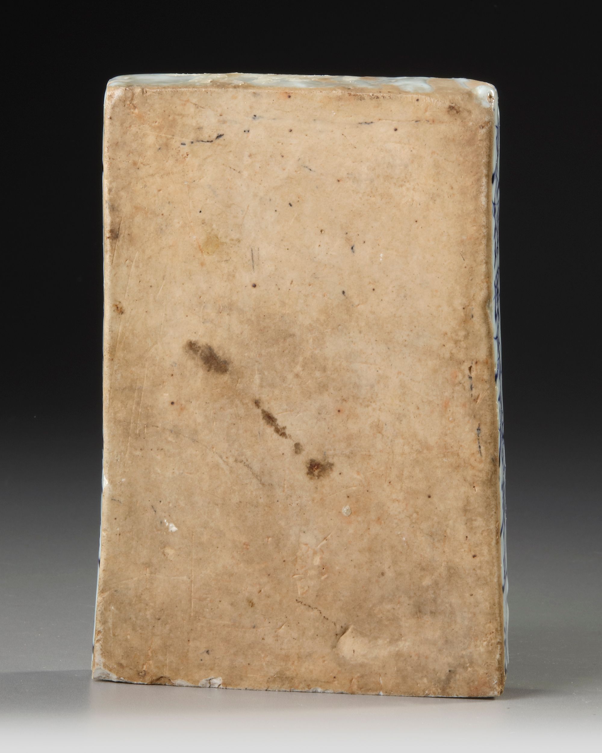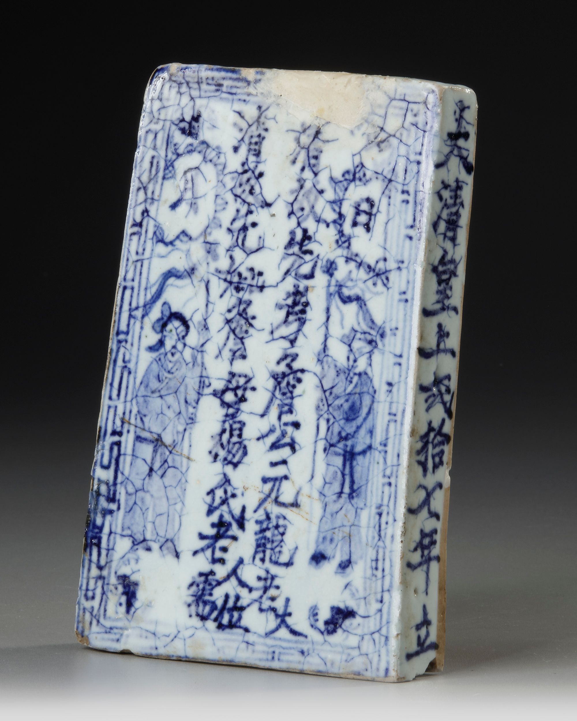 A Chinese porcelain tile decorated in cobalt blue with two figures and a Chinese calligraphic poem. 11.2 by 17 cm
