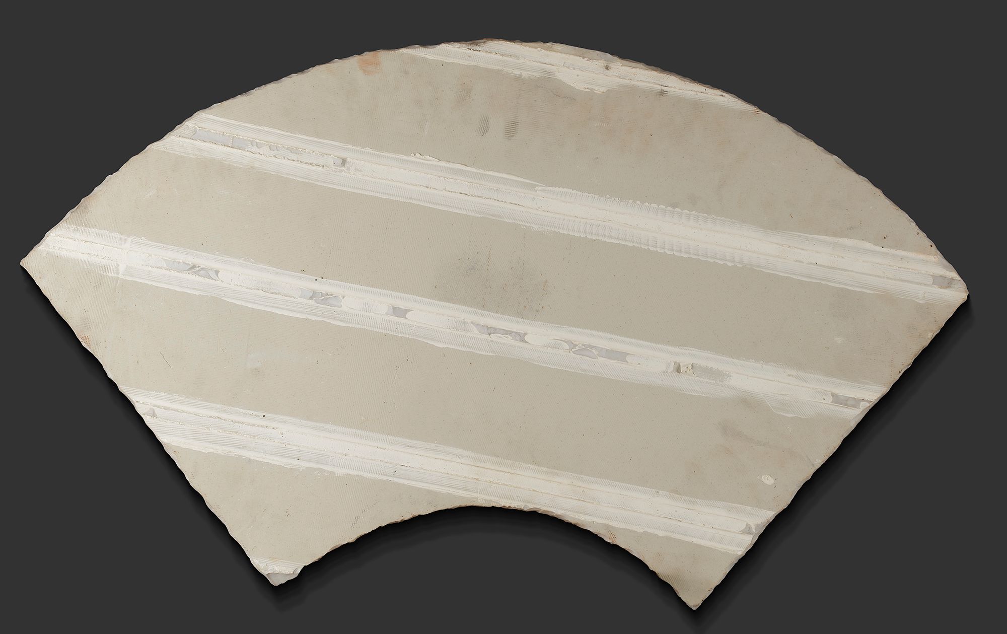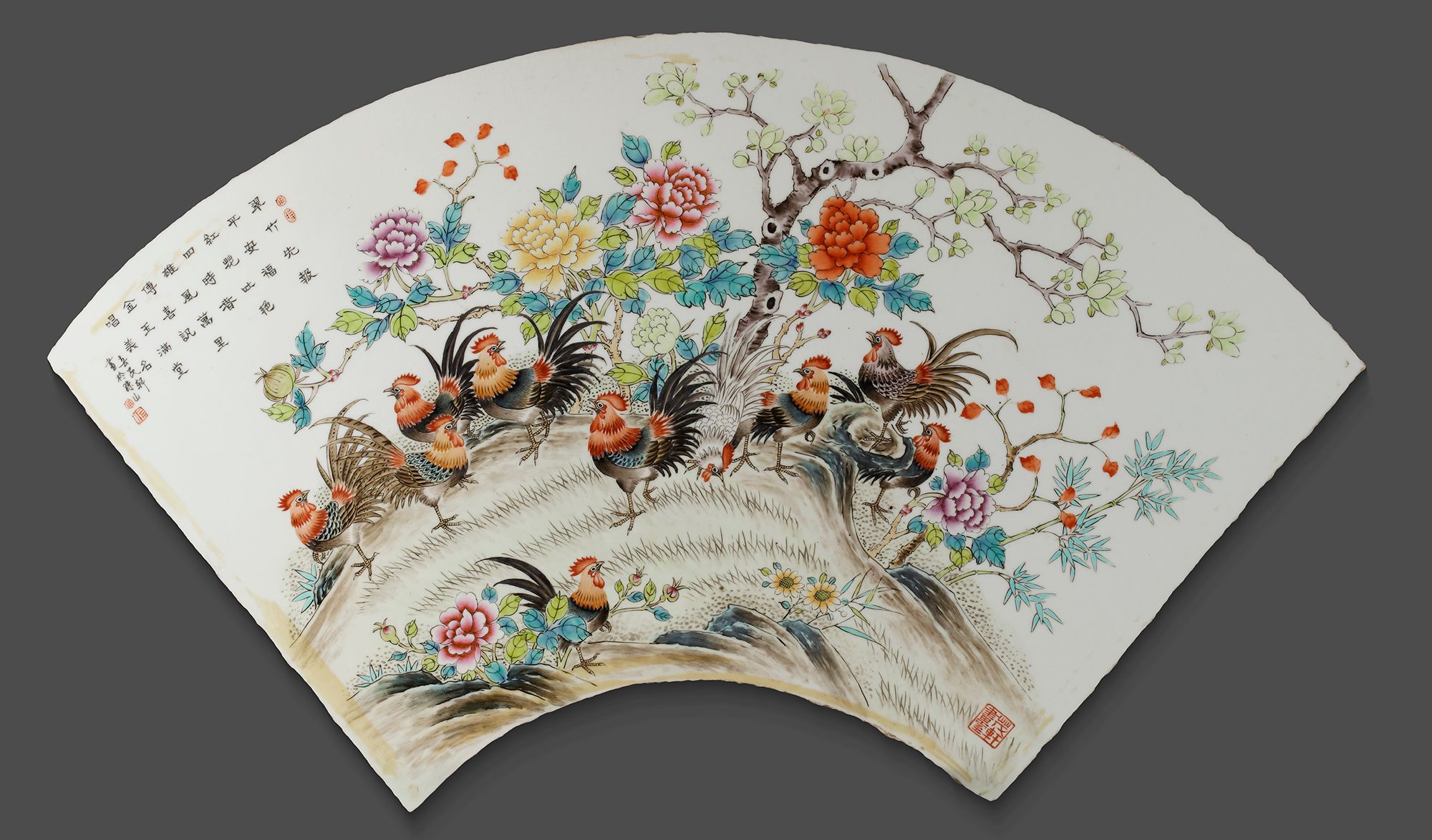 A Chinese porcelain fan shaped panel, decorated in famille rose enamels with cockerels amidst peony blossoming branches. 35 by 70 cm.