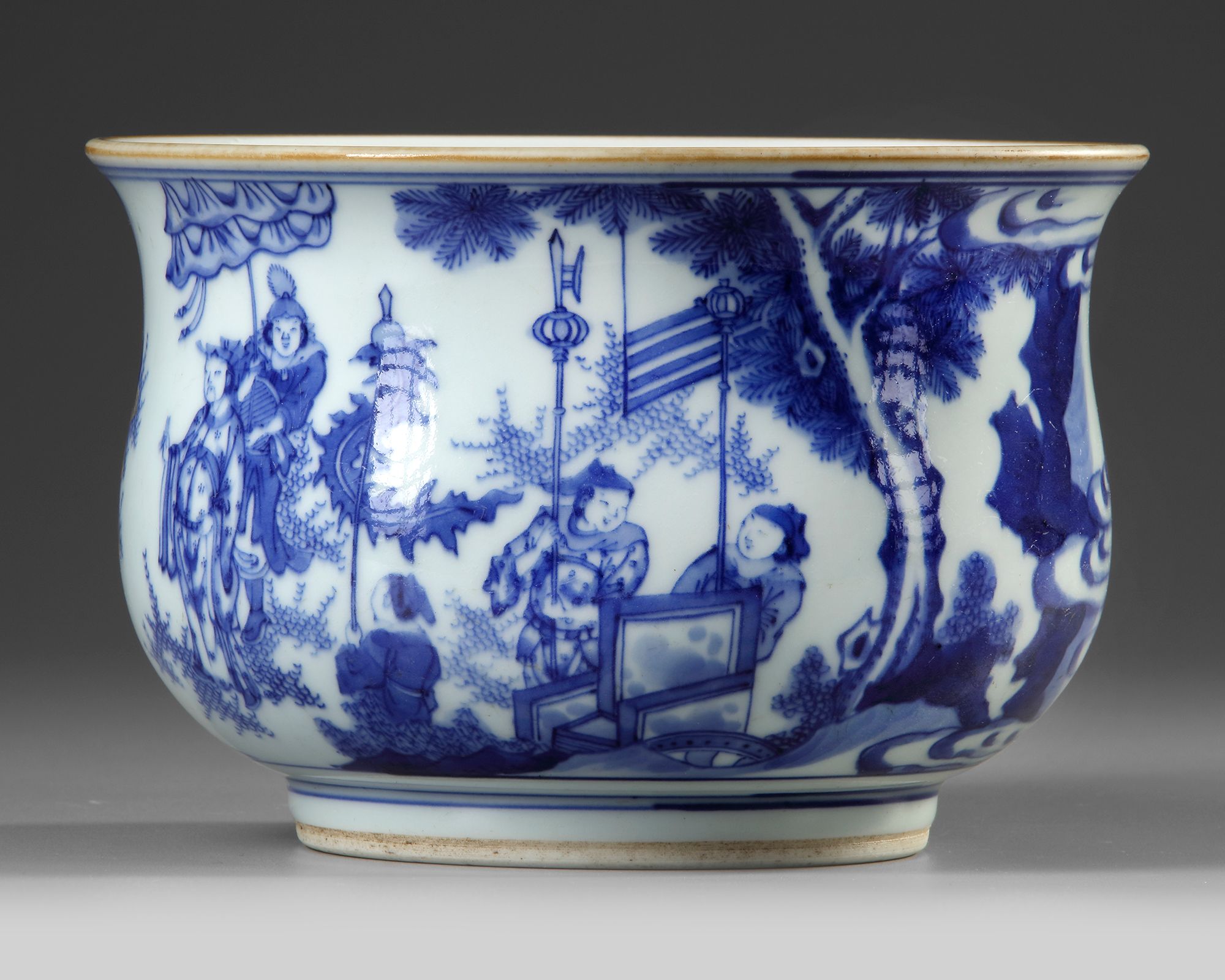 A Chinese porcelain bowl with conical sides rising to an everted rim, decorated in cobalt blue with a dignitary accompanied by soldiers and servants.
