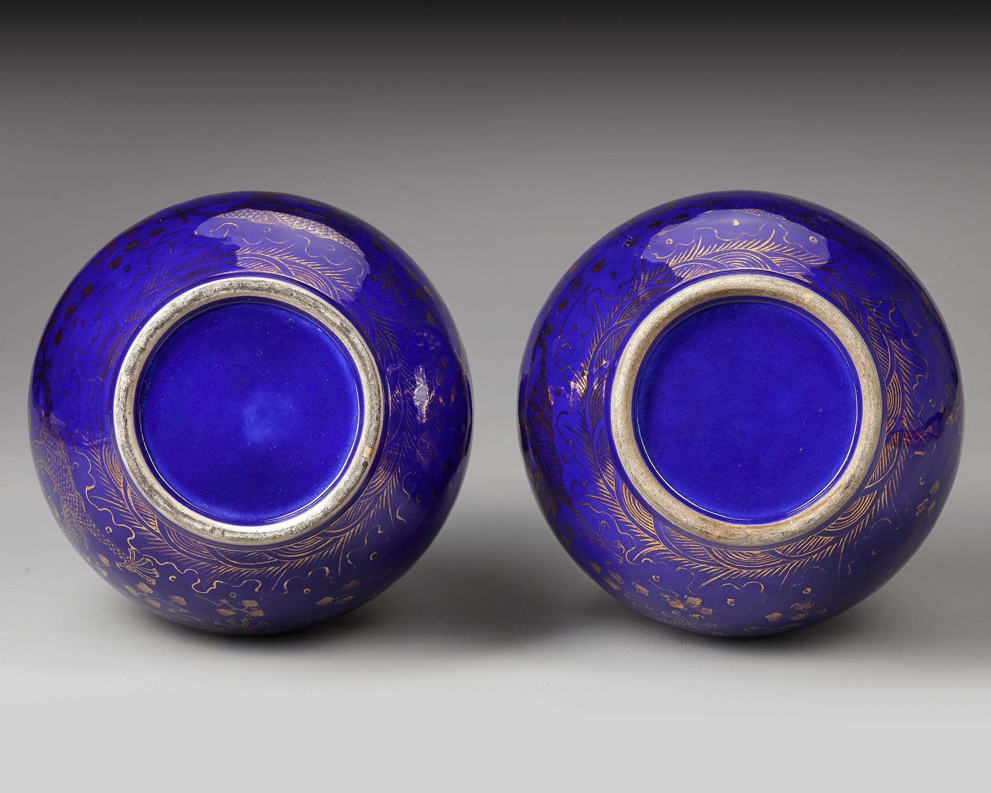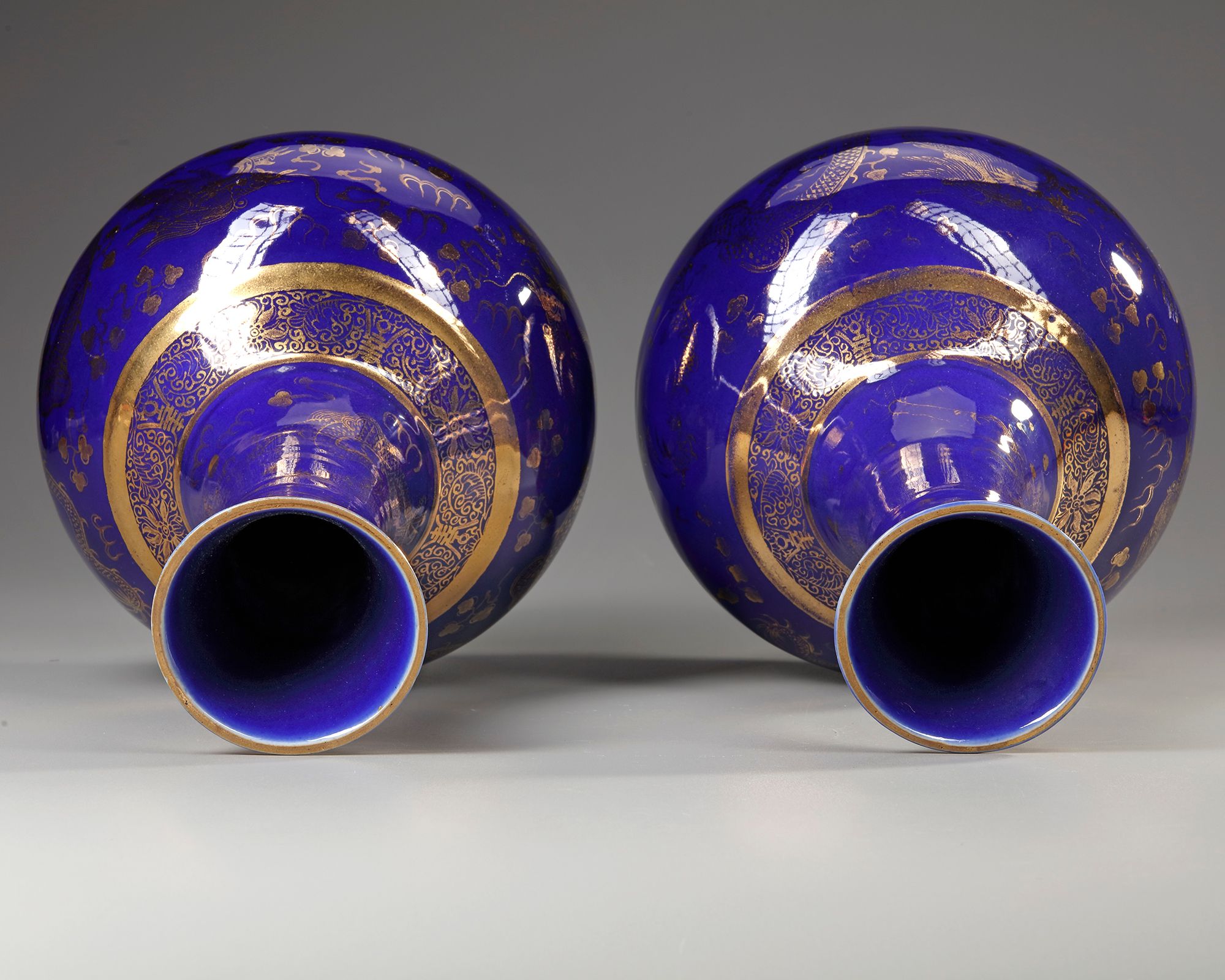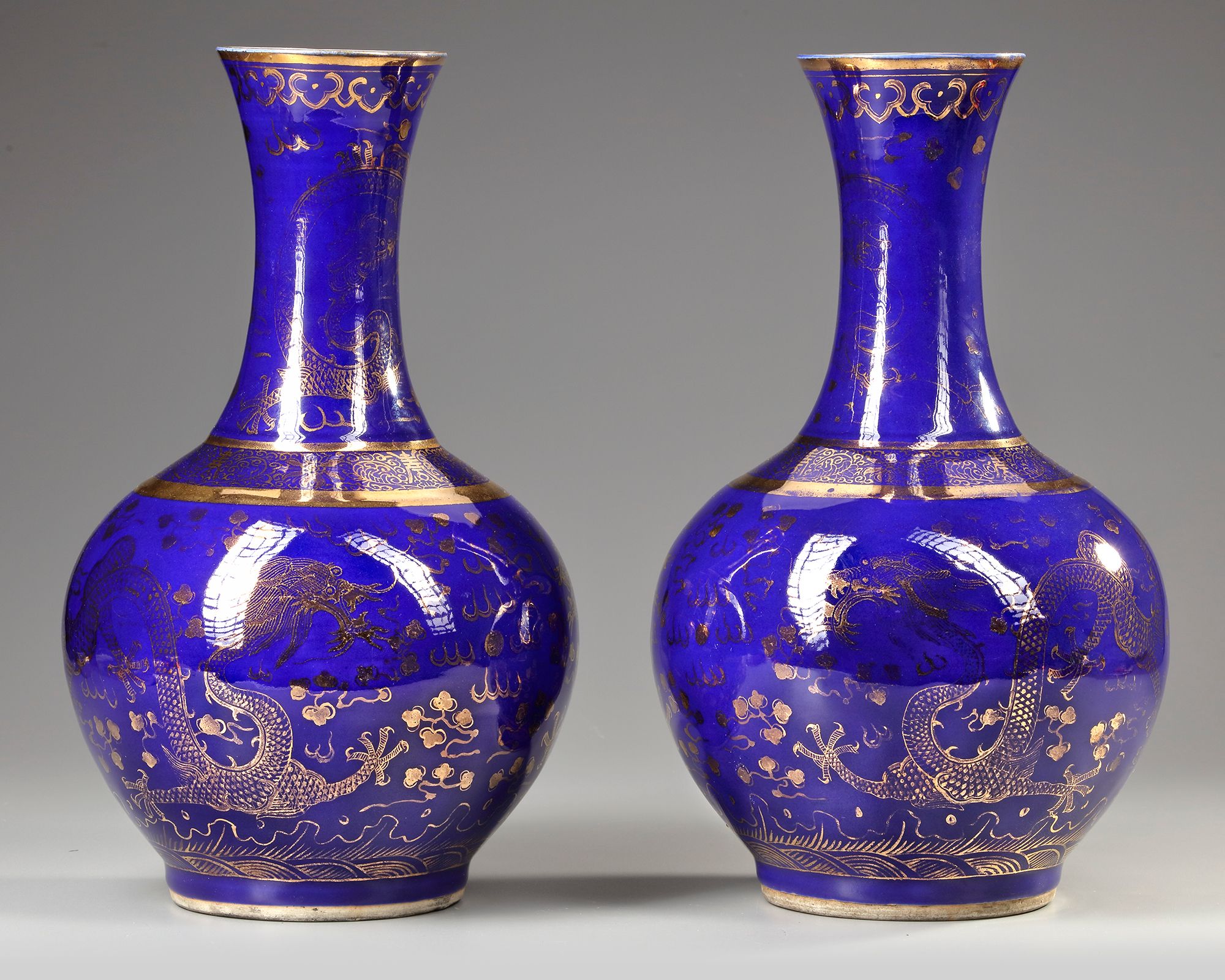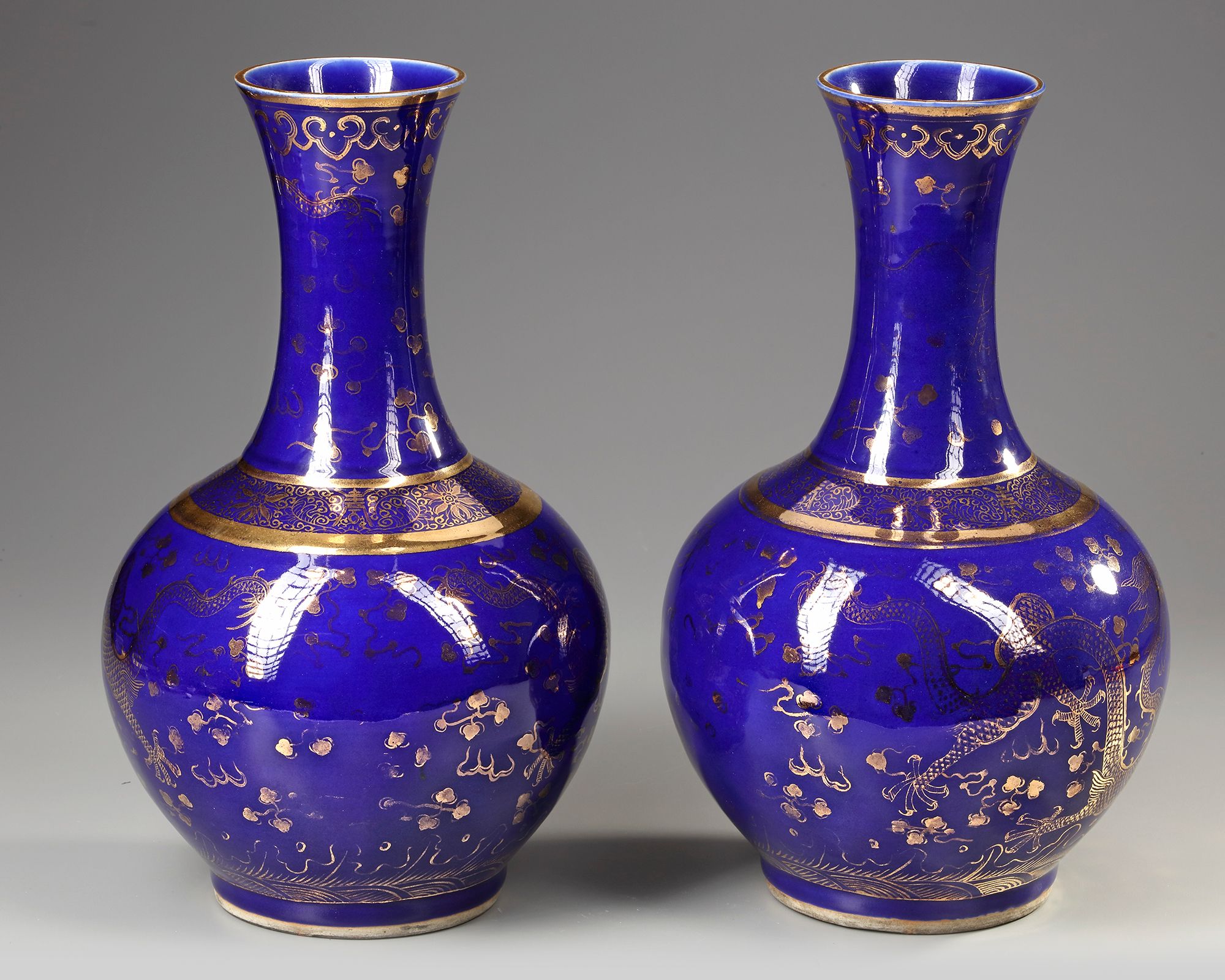A Chinese porcelain bottle vase with globular body supported on a short straight foot and finely gilt with two scaly dragons in pursuit of the flaming pearl amidst wispy clouds, above a band of overlapping waves at the base and below a band of lotus blooms borne on leafy scrolls, the flaring neck with a further scaly dragon.