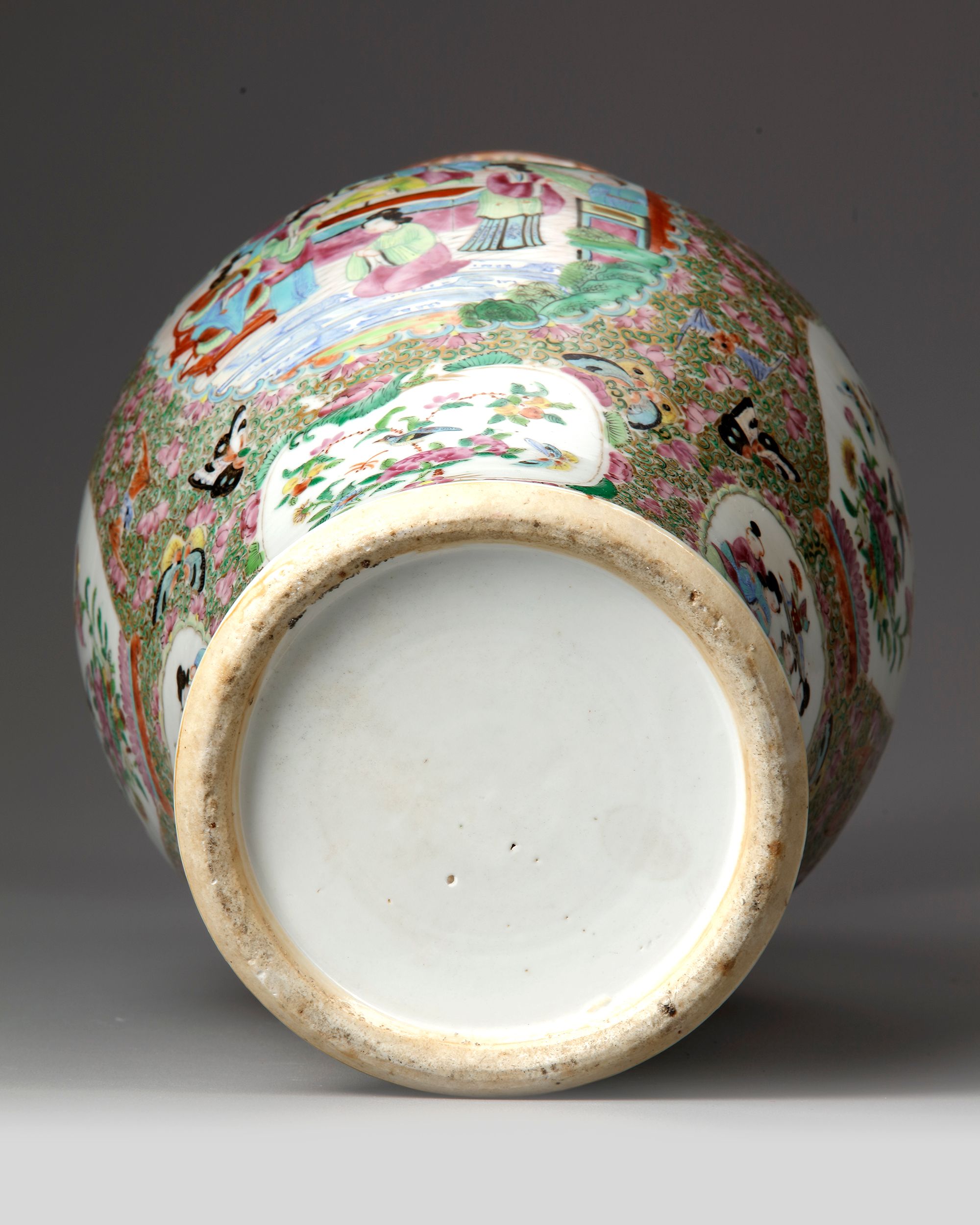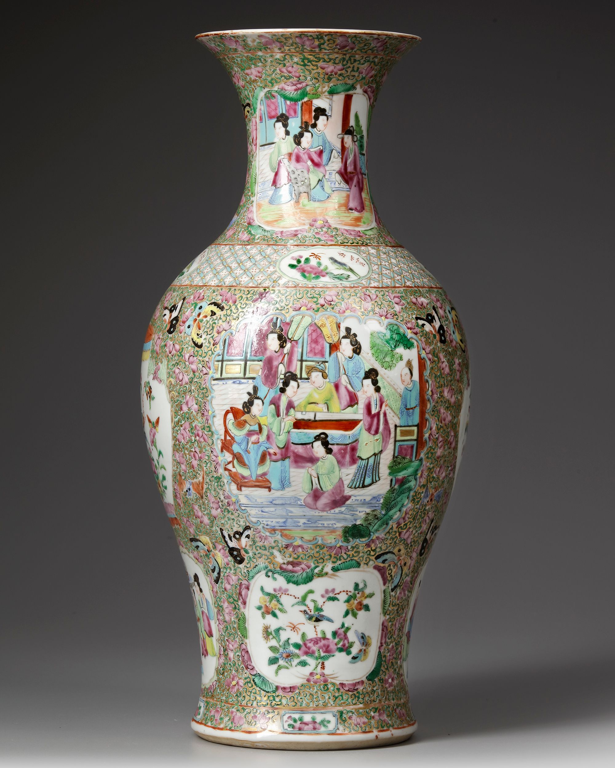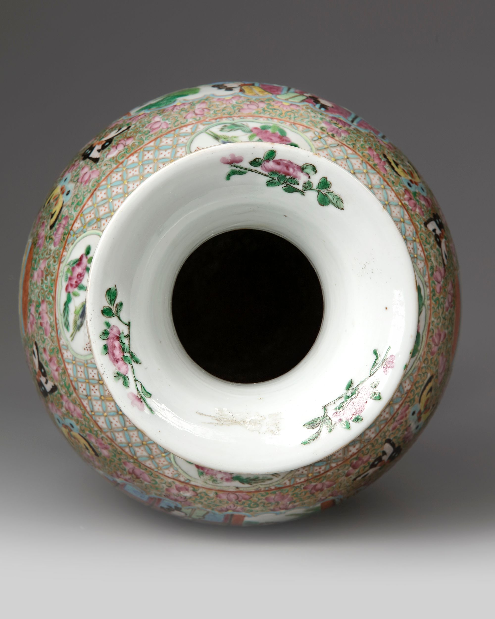 A Chinese porcelain vase in the medallion style is elaborately enameled and painted with medallions featuring court scenes and groups of flora and fauna with birds.