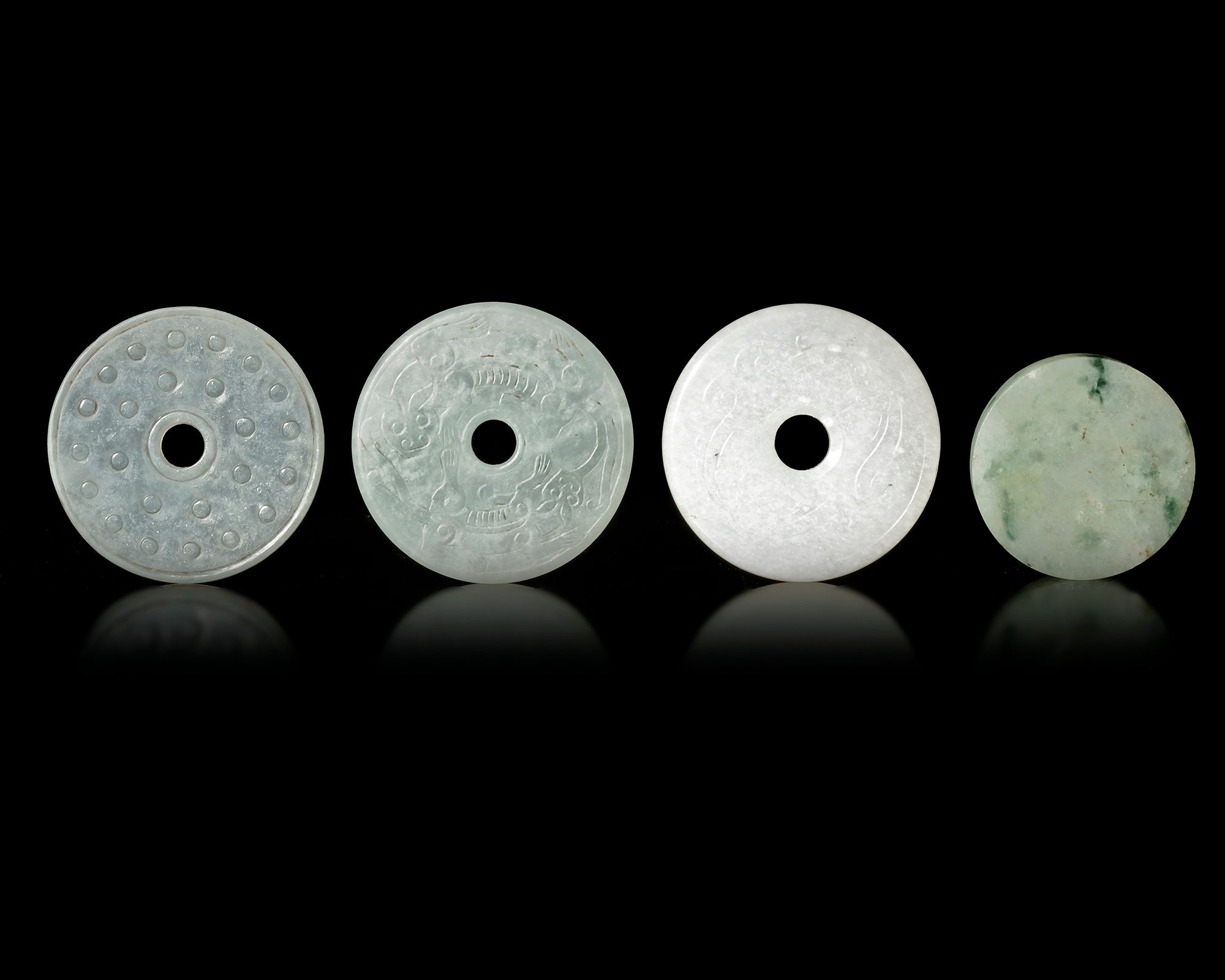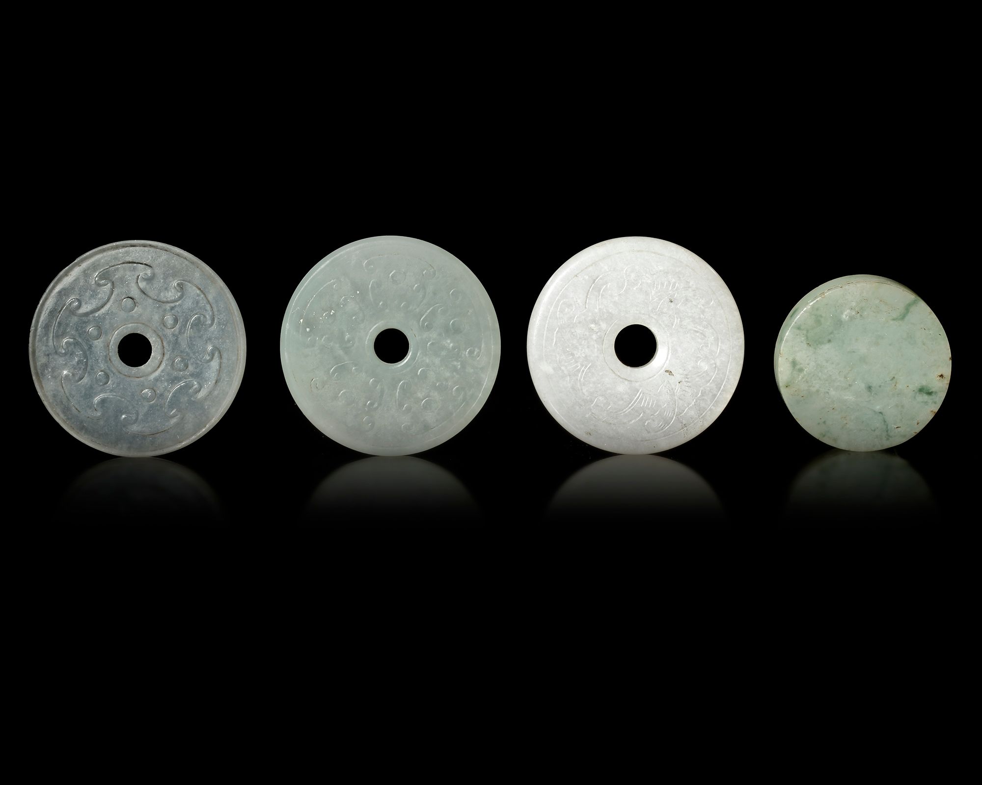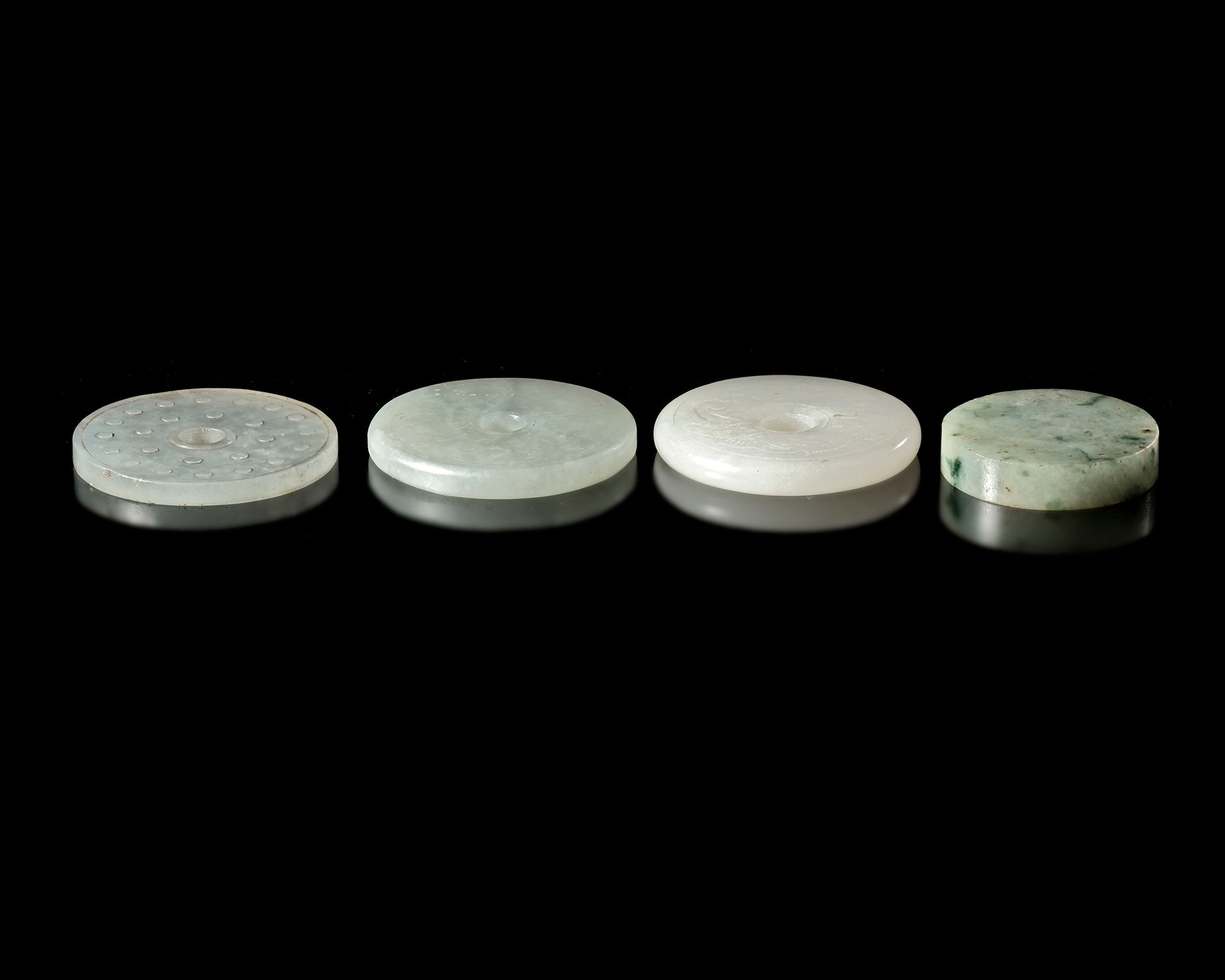 Four Chinese jade Bi discs, carved with an ordered array of raised spirals, Fu bats, and ruyi heads. Diameter: 5.7- 5.8 cm.