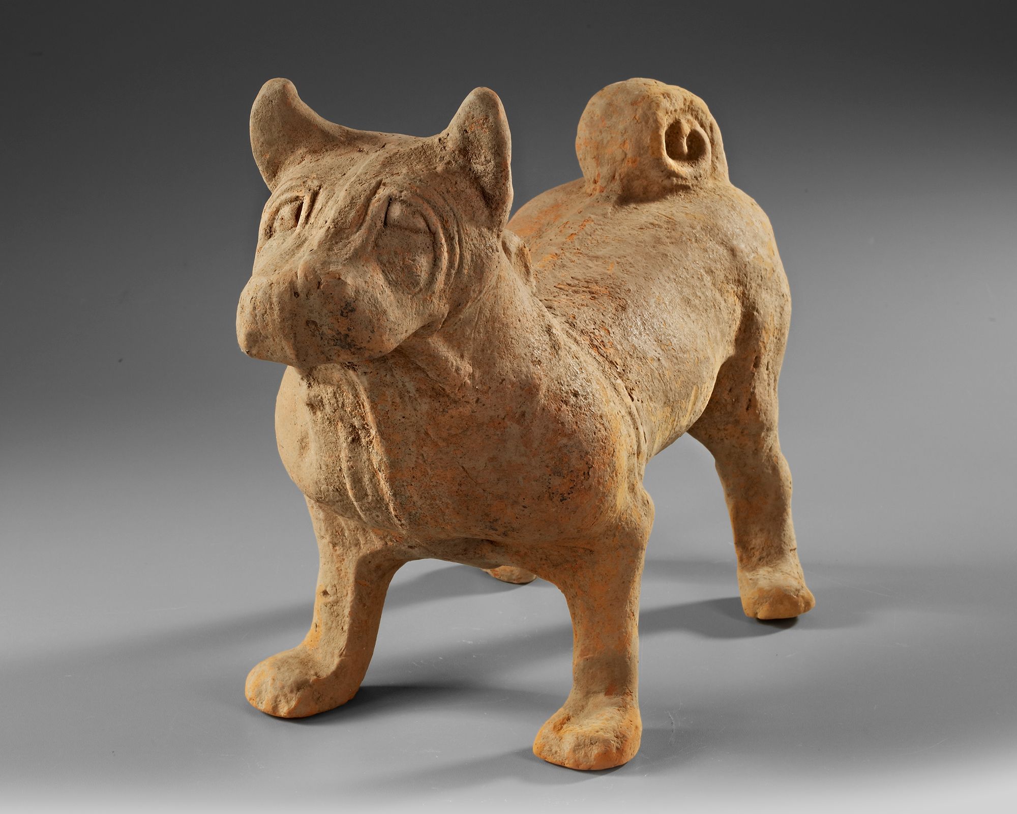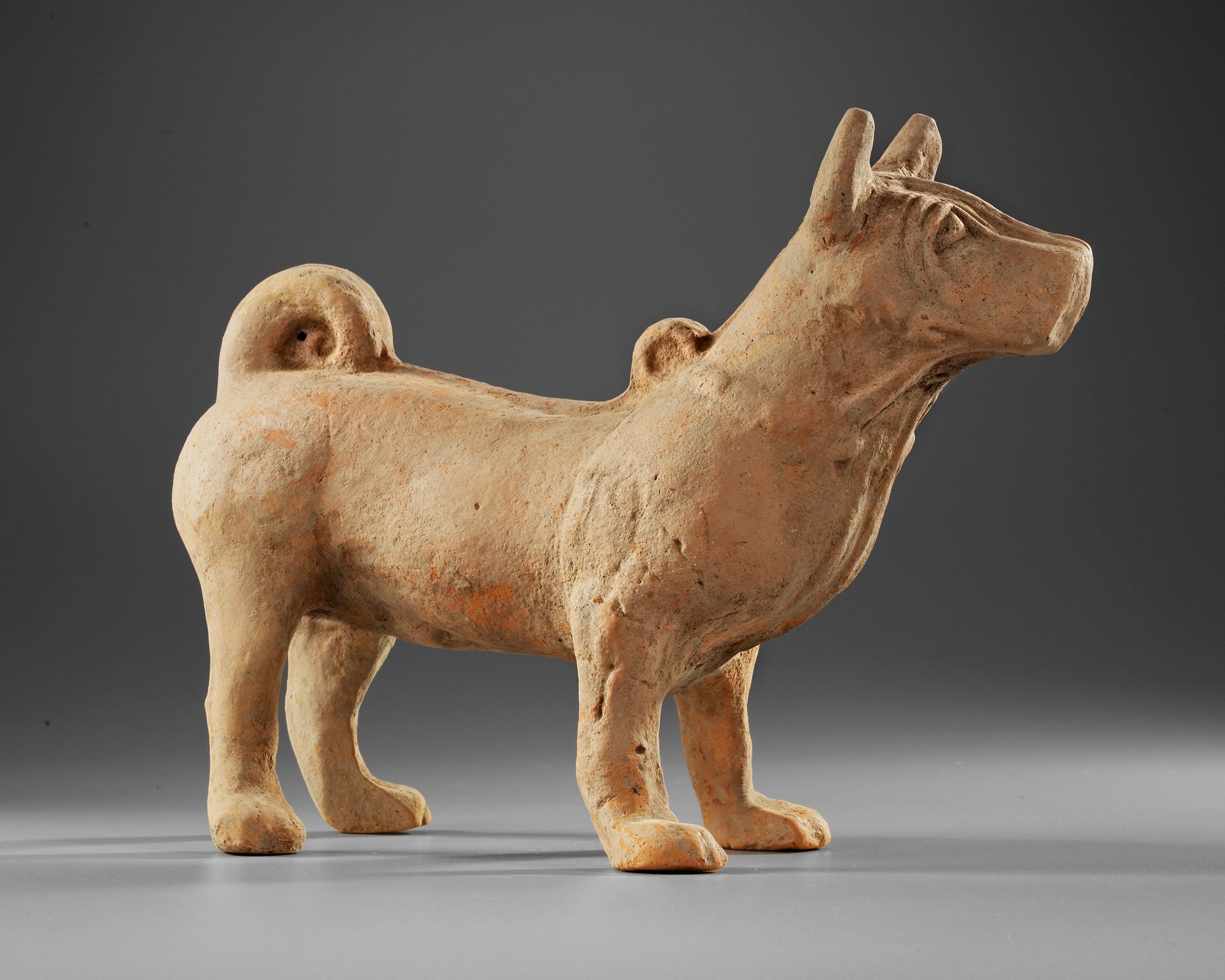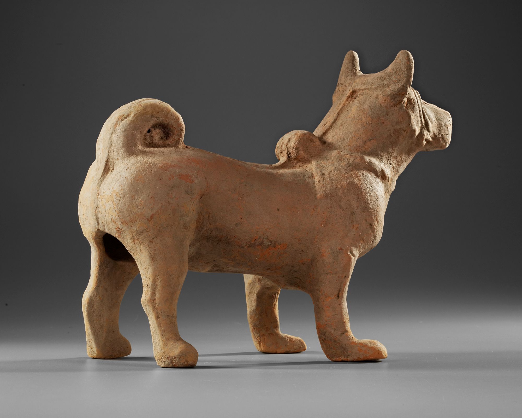 An alert dog, with a strong and protective stance and fierce disposition, with a curved tail.