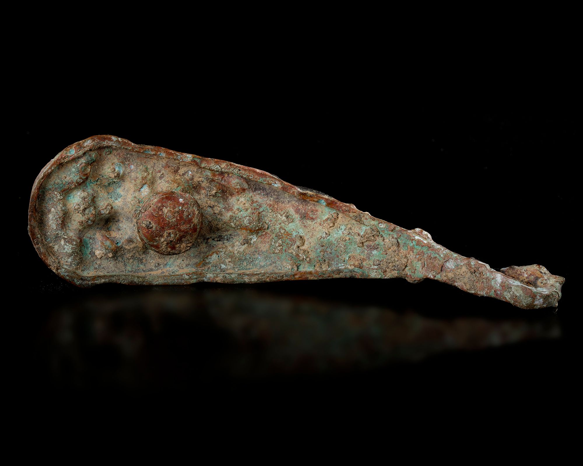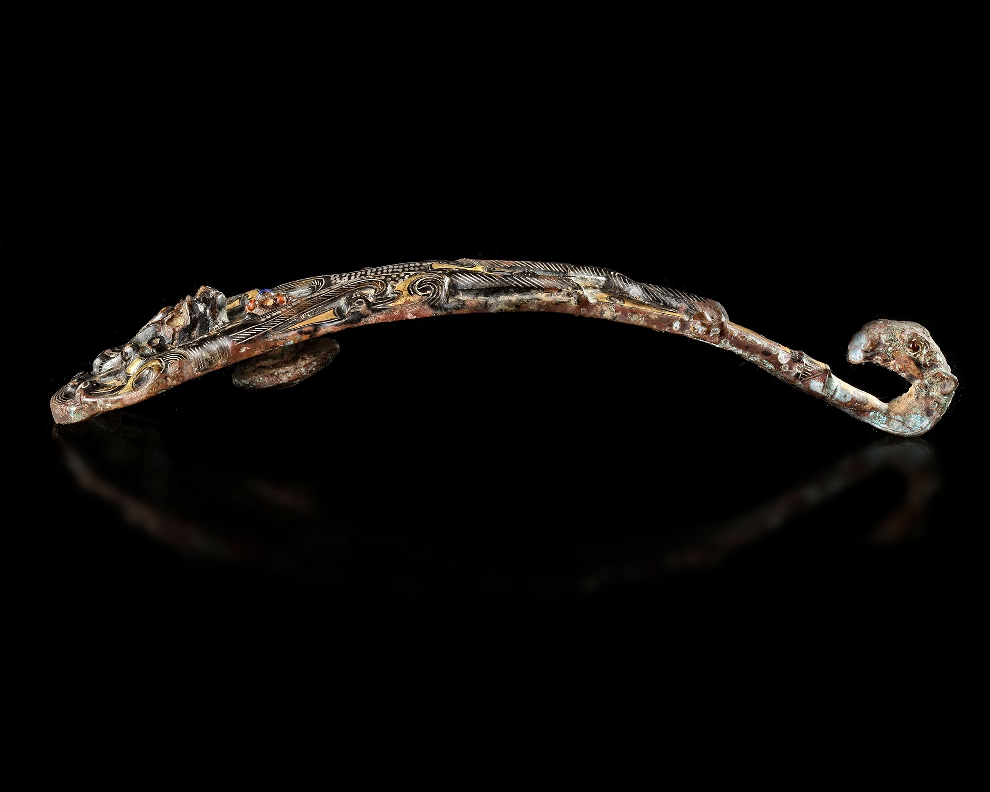 A gilt bronze belt hook, the wide, flat section cast in relief with a complex pattern of two pairs of intertwined chilongs, the long hook terminates in a small animal’s head.