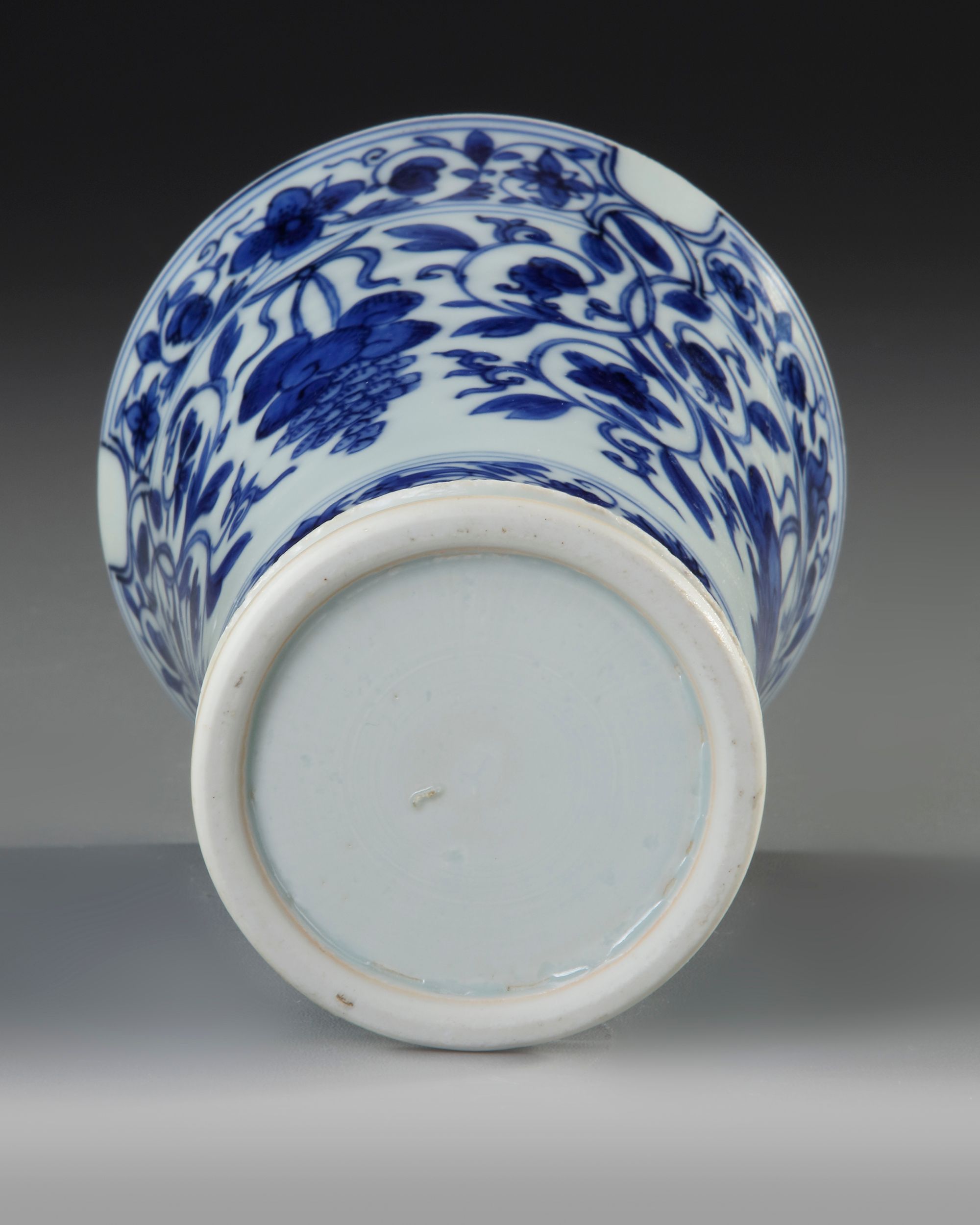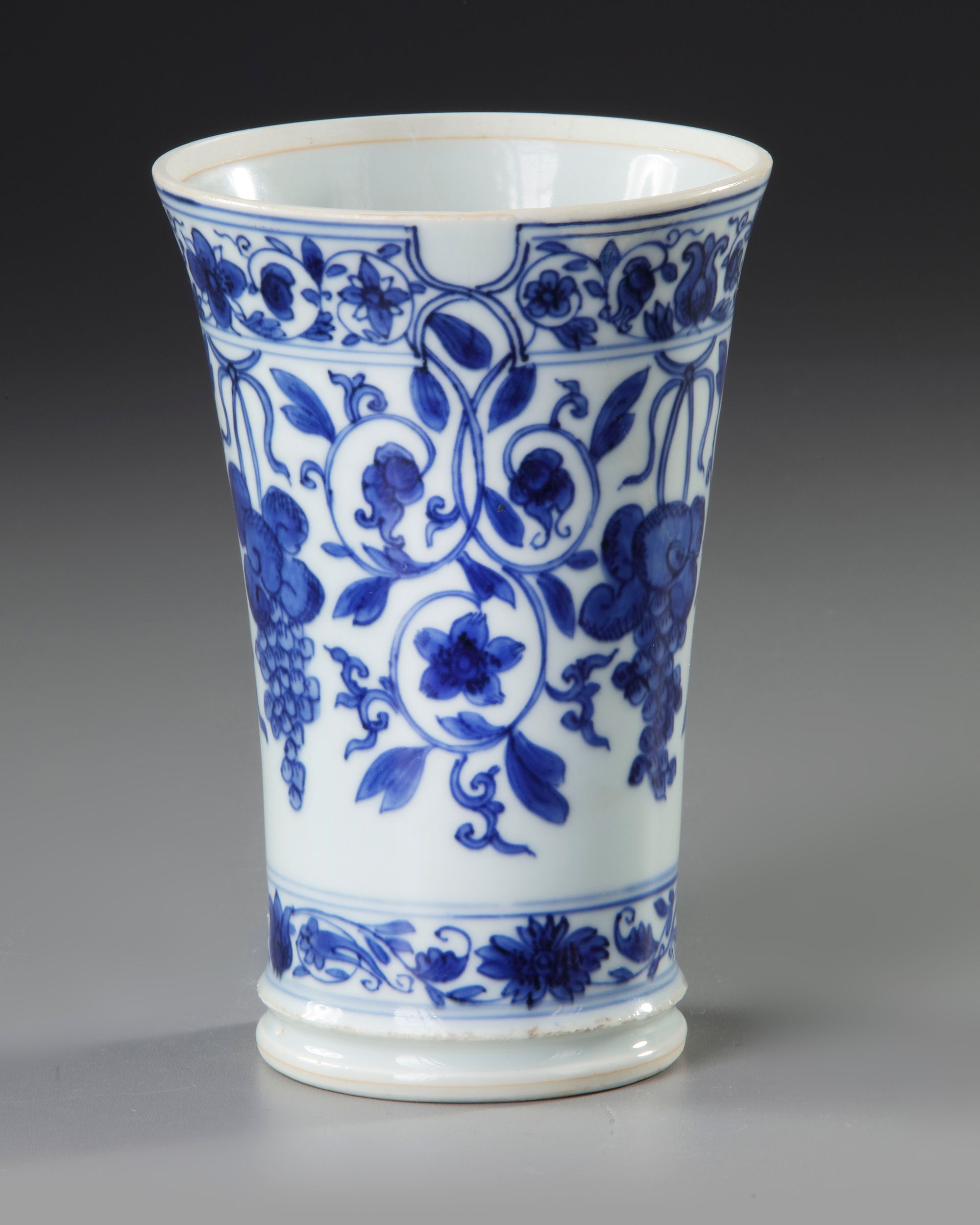 A Chinese porcelain vase with flaring sides, decorated grapes blossoming branches. Height: 14.8 cm. Restored.