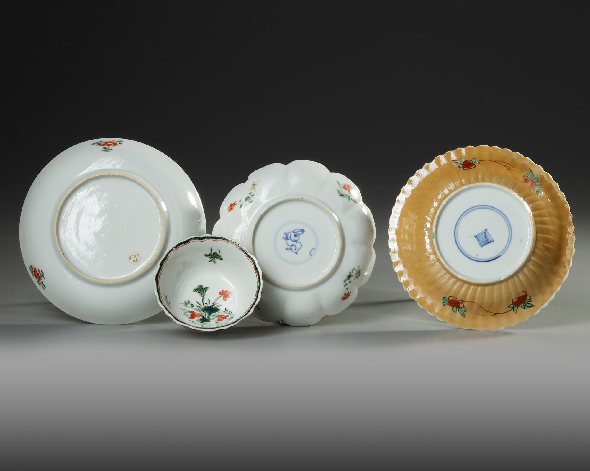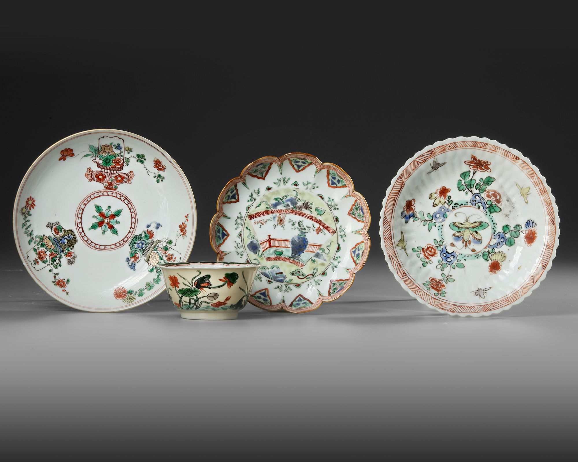 A CHINESE FAMILLE VERTE CUP AND THREE SAUCERS, KANGXI PERIOD