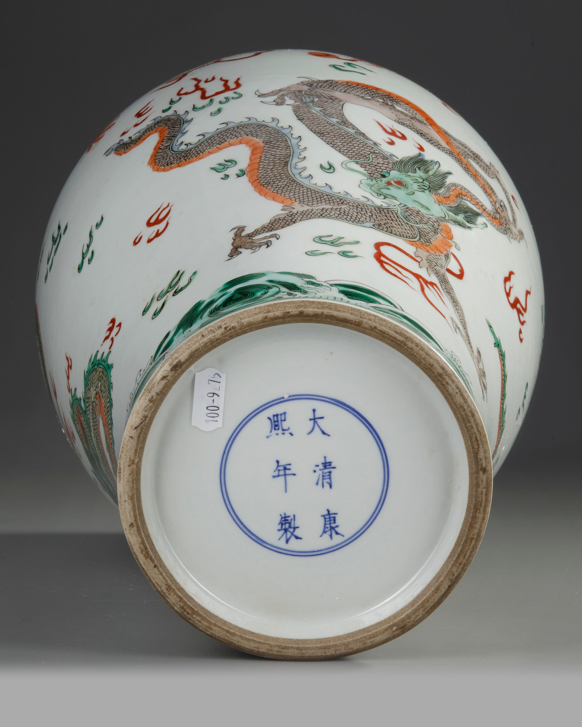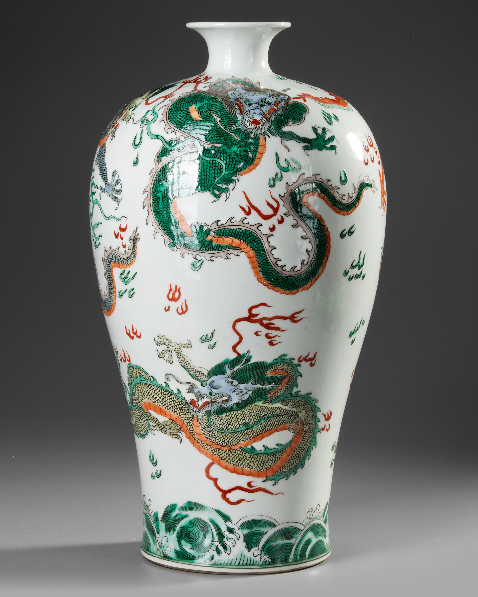 A Chinese porcelain meiping vase, decorated with five leaping five-clawed dragons amidst clouds and above a band of crushing waves. The bottom with a Chinese Kangxi six character mark.