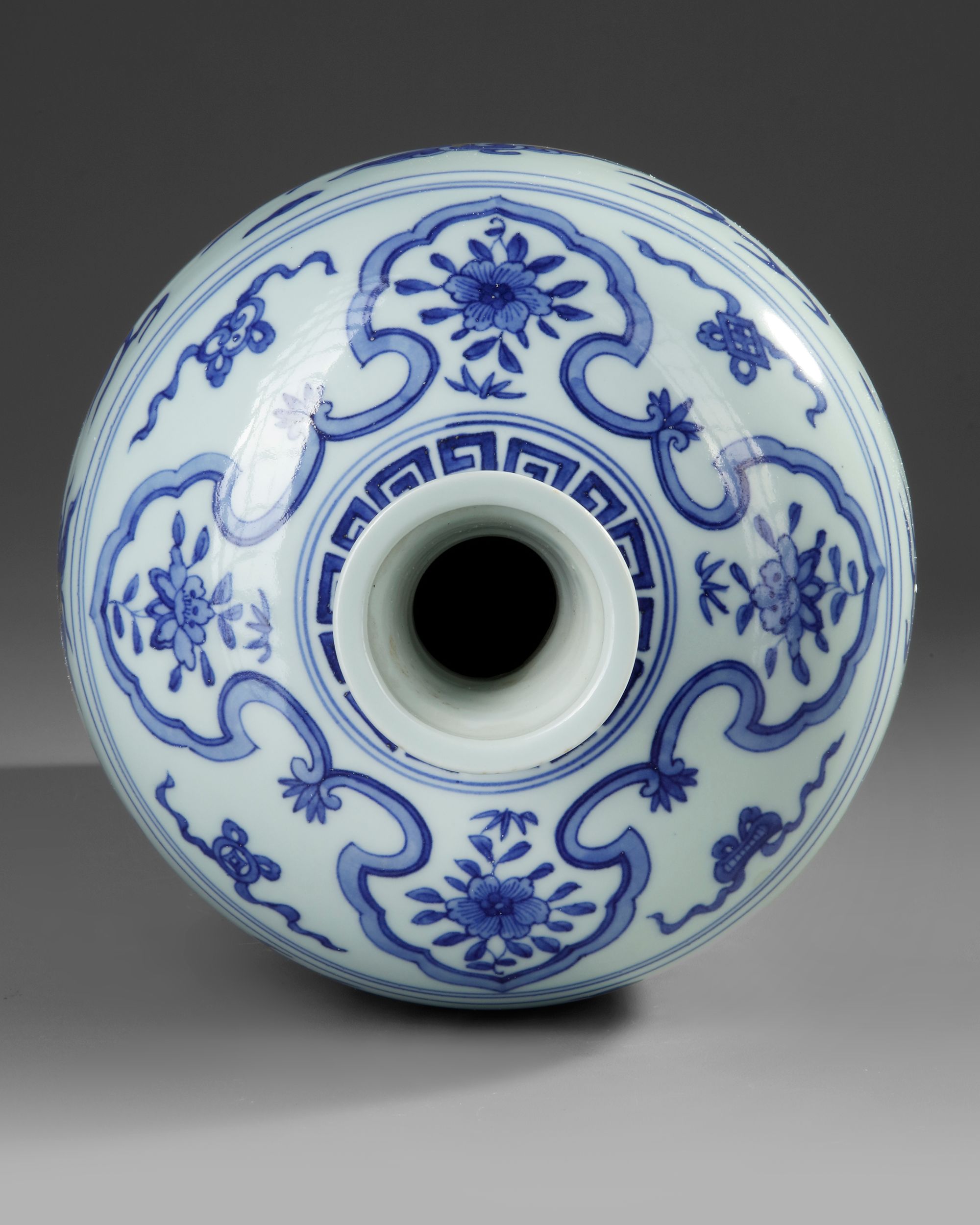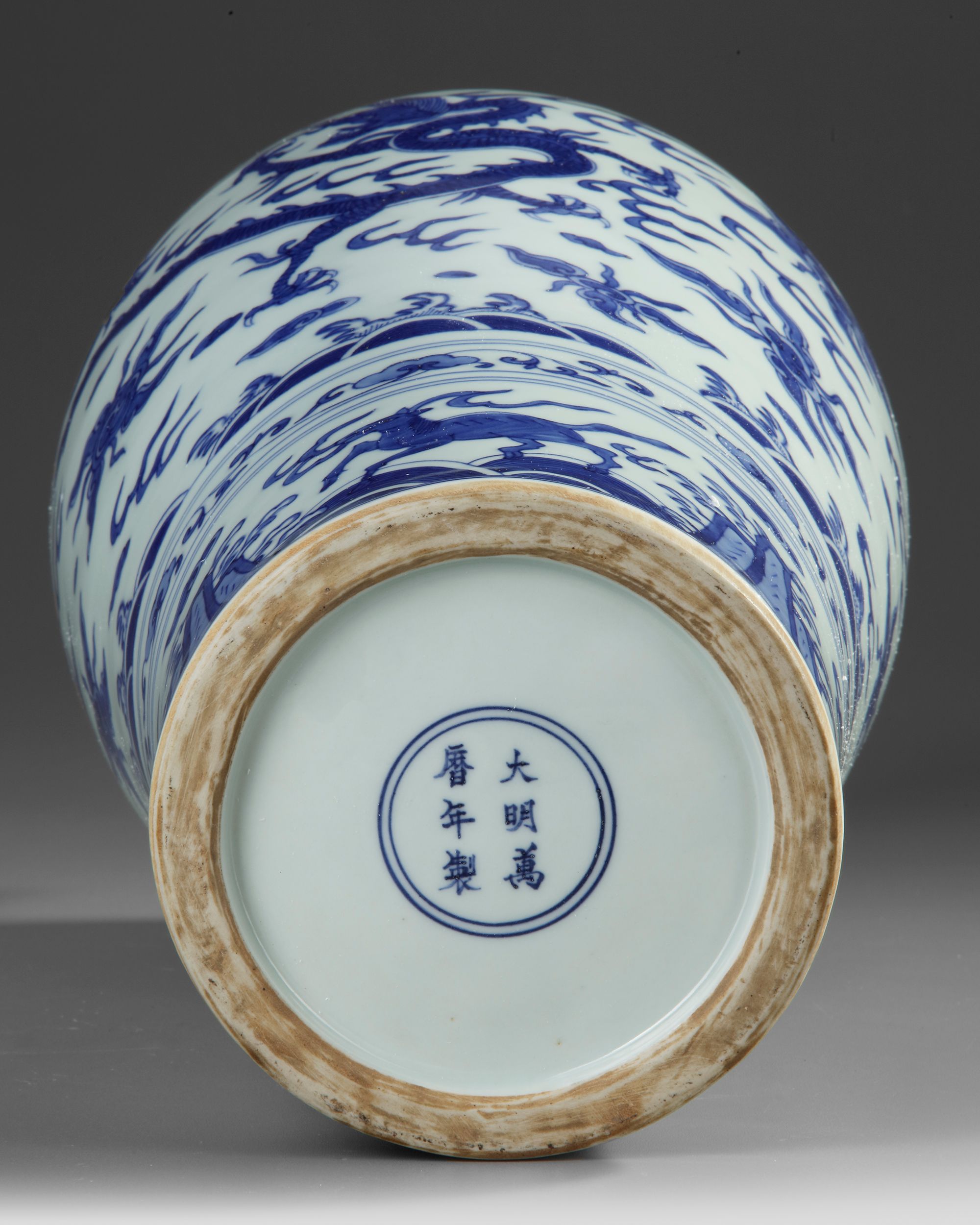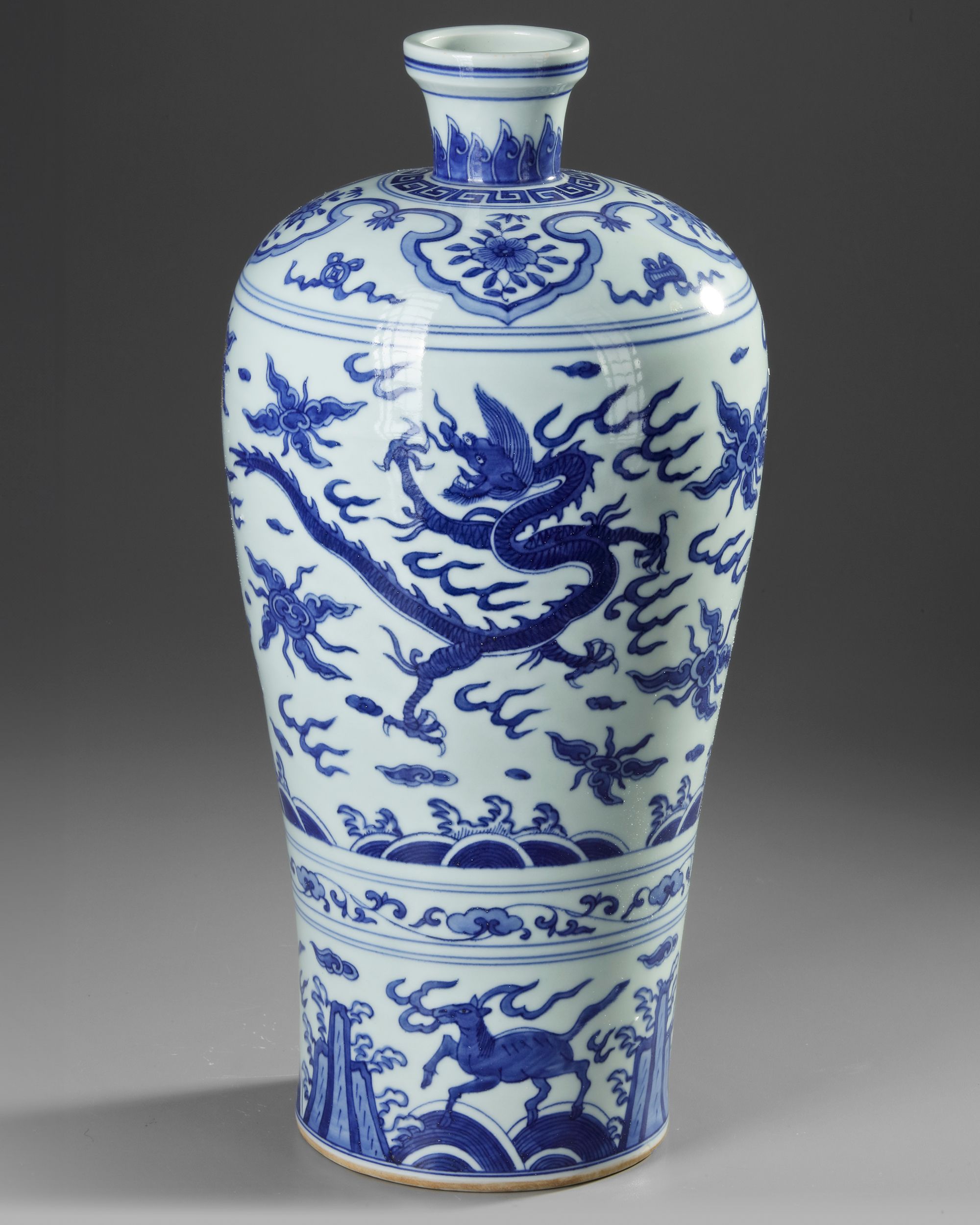 A Chinese porcelain meiping vase, the upper body of the vase is painted with a sinuous dragon and phoenix bird pursuing a flaming pearl amidst clouds above crushing waves. The lower body is decorated with mythical horses leaping from rock to rock over breaking waves. The shoulder with ruyi heads enclosing flowers and Daoist emblems. The bottom with a Chinese Wanli six character mark.