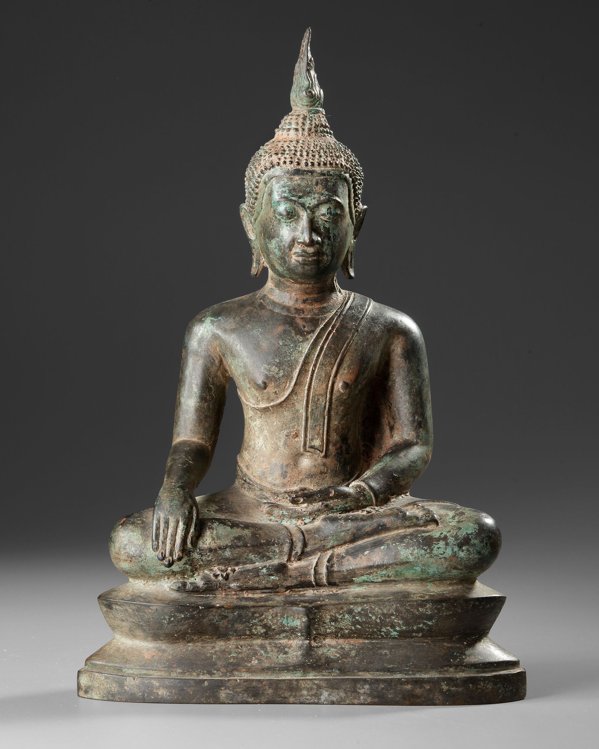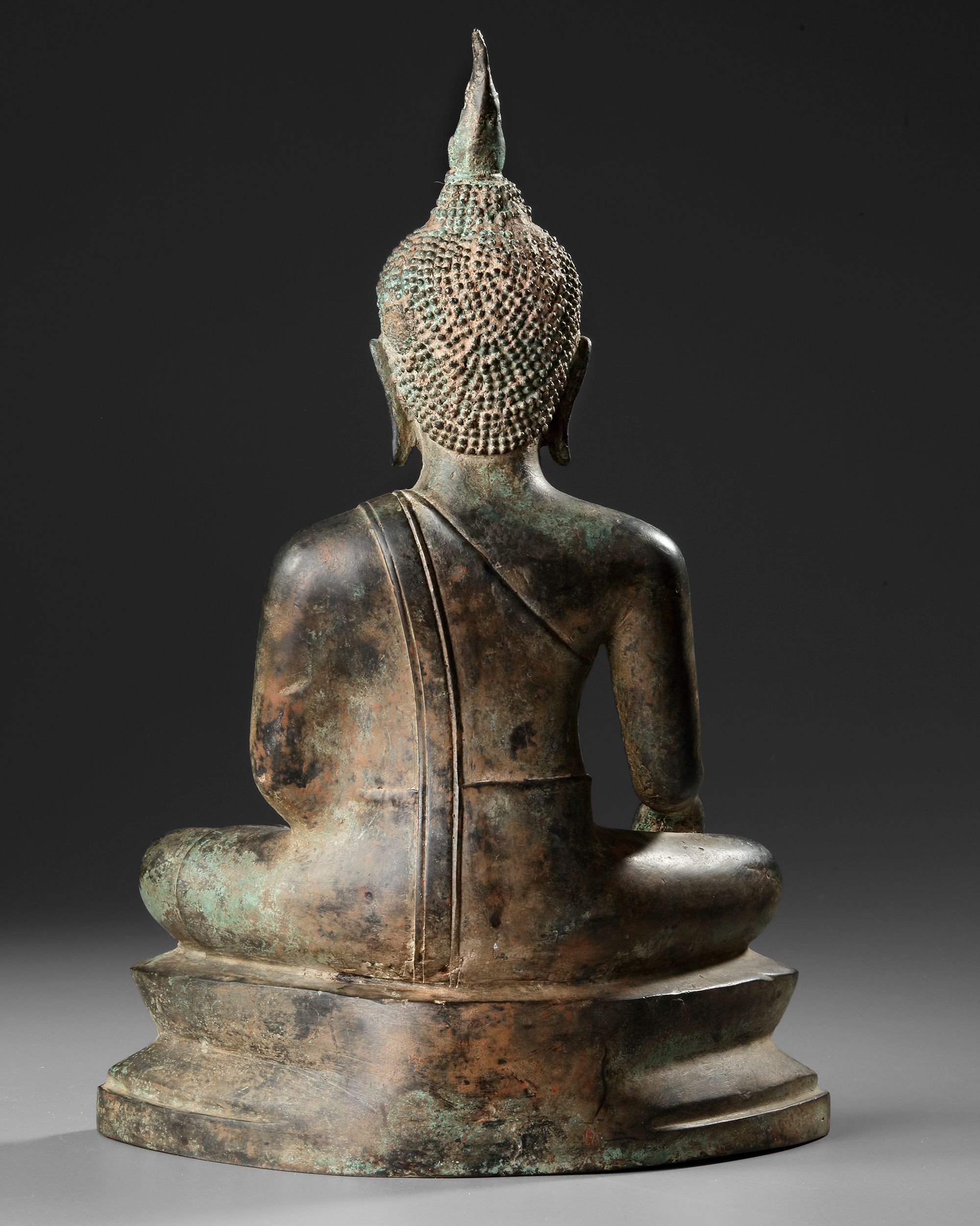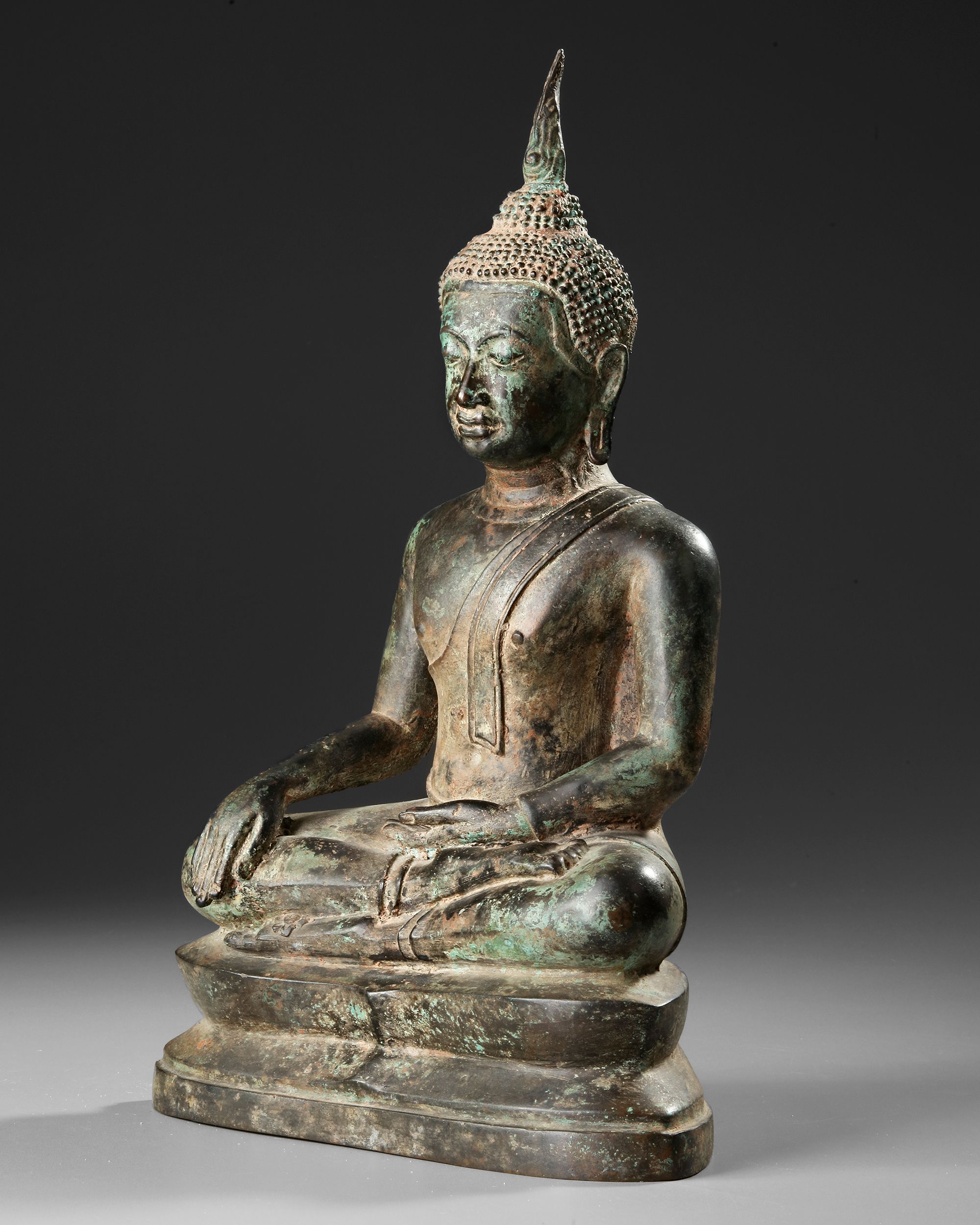 Seated on an undecorated pedestal in the cross-legged yogic posture of satvaparyankasana, the right leg placed over the left. His right hand is lowered, long fingers pointing downward in the earth-touching gesture, or bhumisparshamudra.