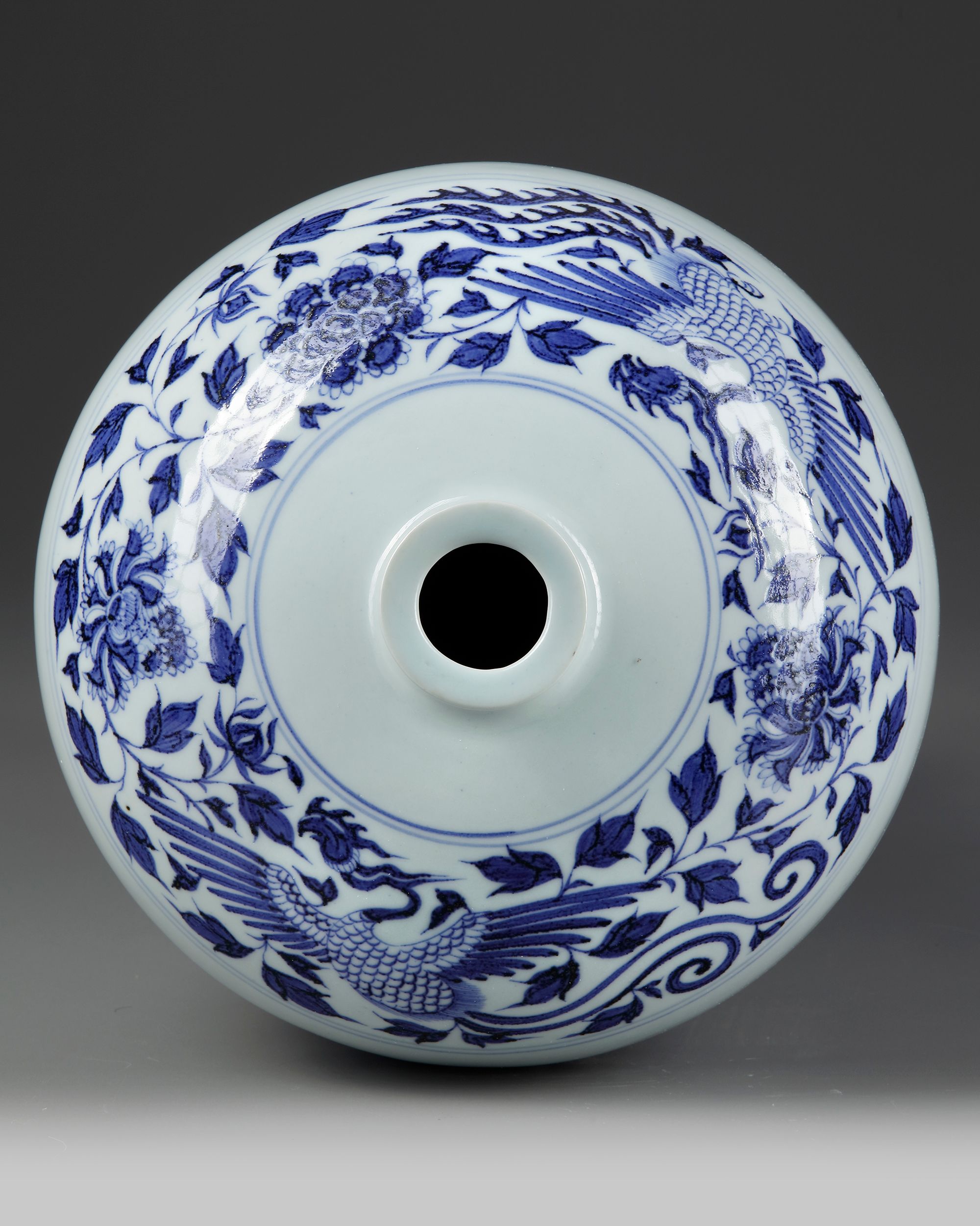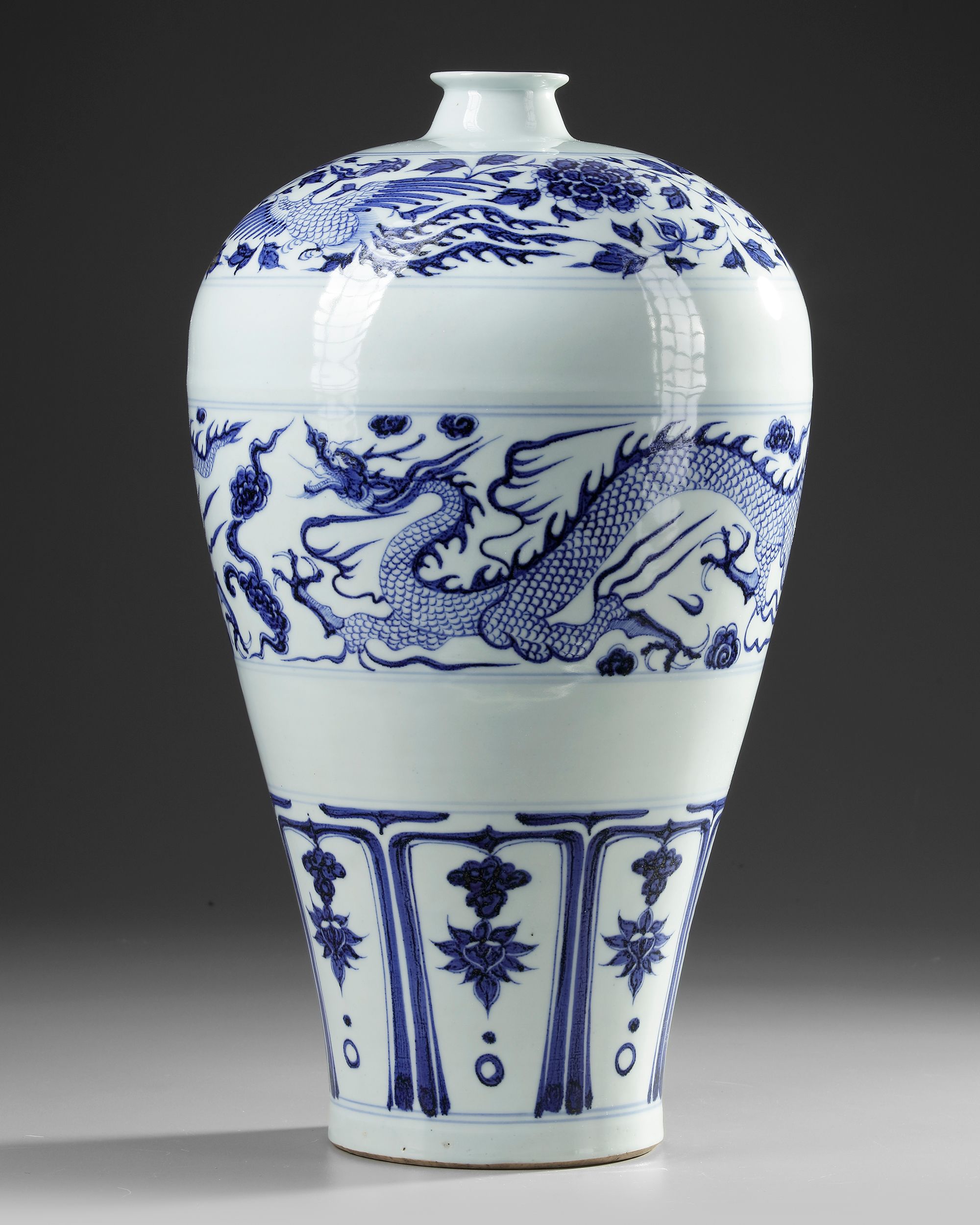 Robustly potted with high broad round shoulders sloping down towards the tapering ovoid body, painted in rich cobalt blue tones, the main register with a wide band enclosing a pair of scrolling dragons chasing flaming pearls to the centre, set between a further decorative band over the shoulder and the foot encircled by upright and pendant lappets.