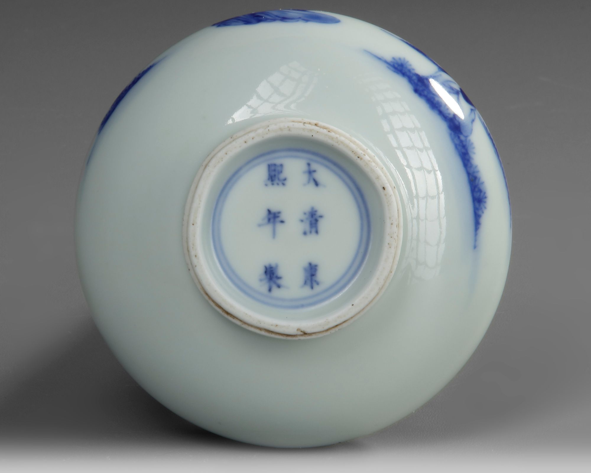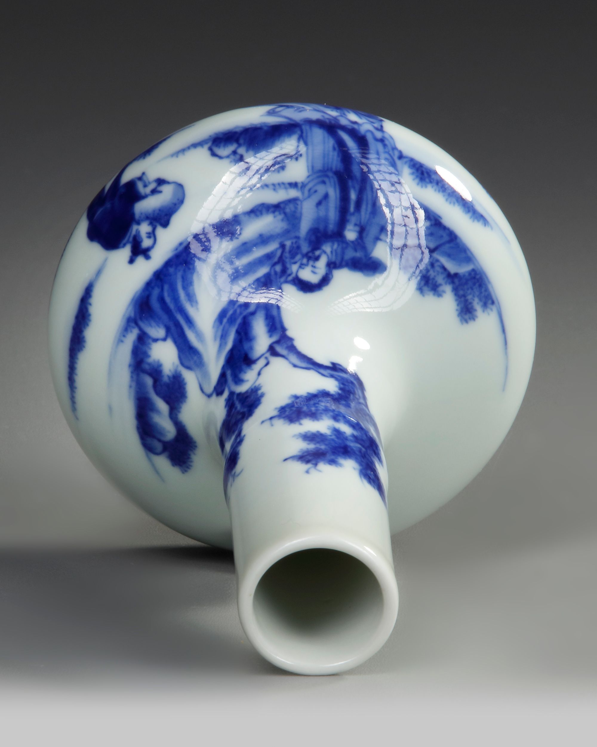 A Chinese porcelain bottle vase, decorated in cobalt blue with a scholar and his servant in pine tree landscape, the bottom with a Chinese Kangxi six character mark.