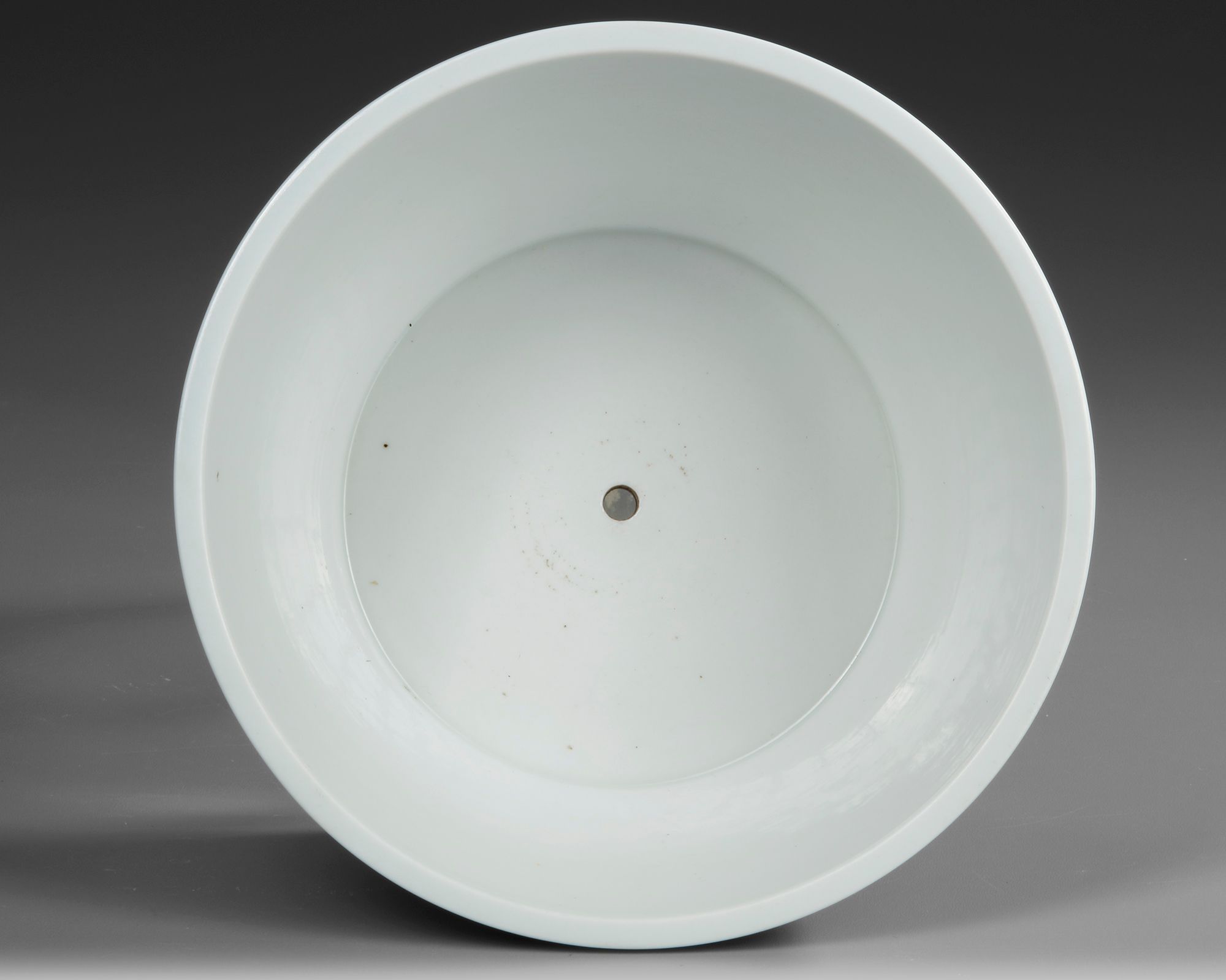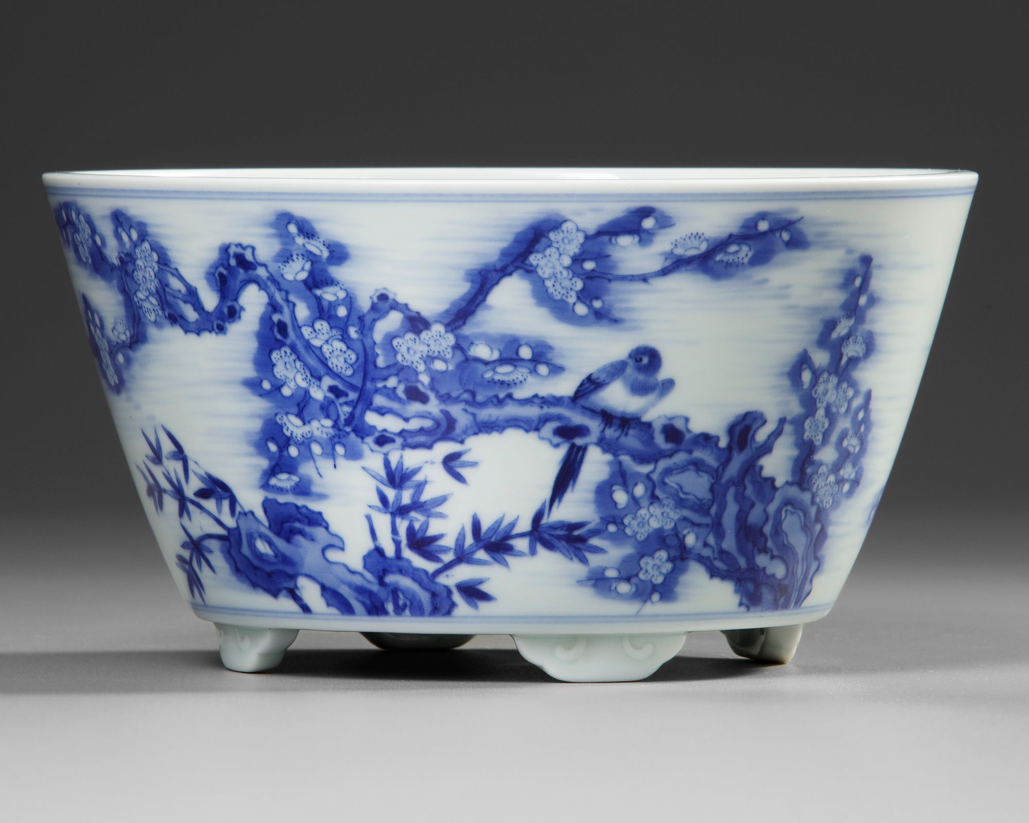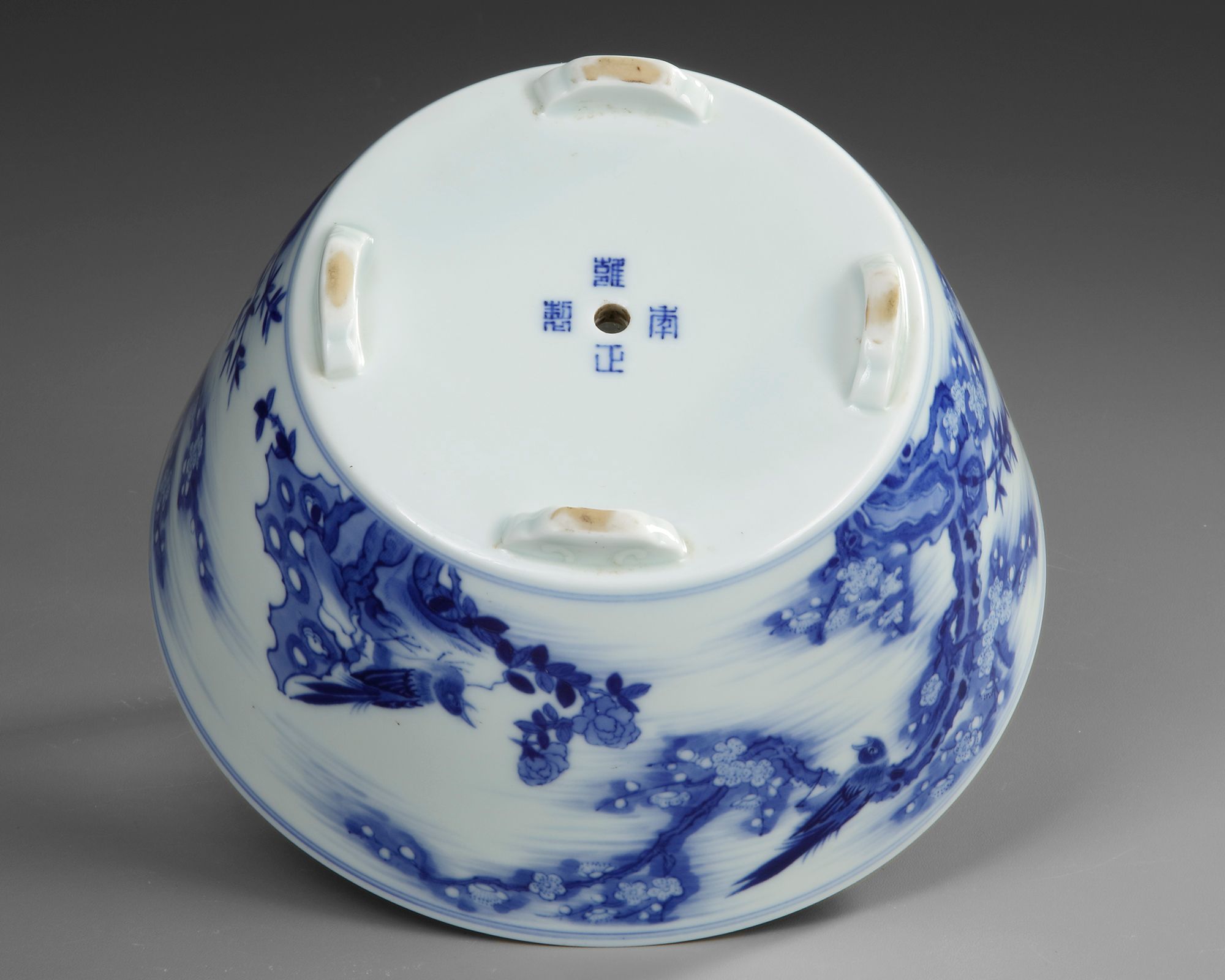 A Chinese porcelain pot supported on four tapering feet, decorated in cobalt blue with two birds perched on a blossoming tree growing from ornamental rocks, the bottom with a four Chinese Yongzheng seal mark.