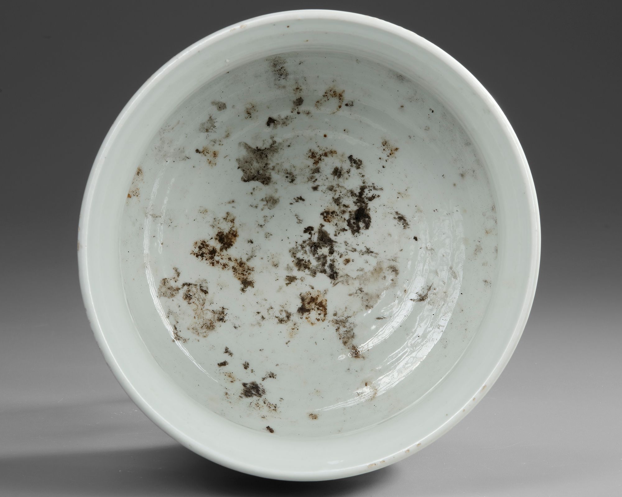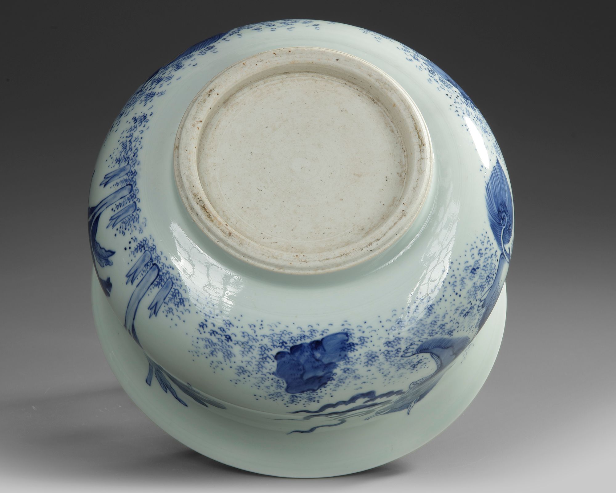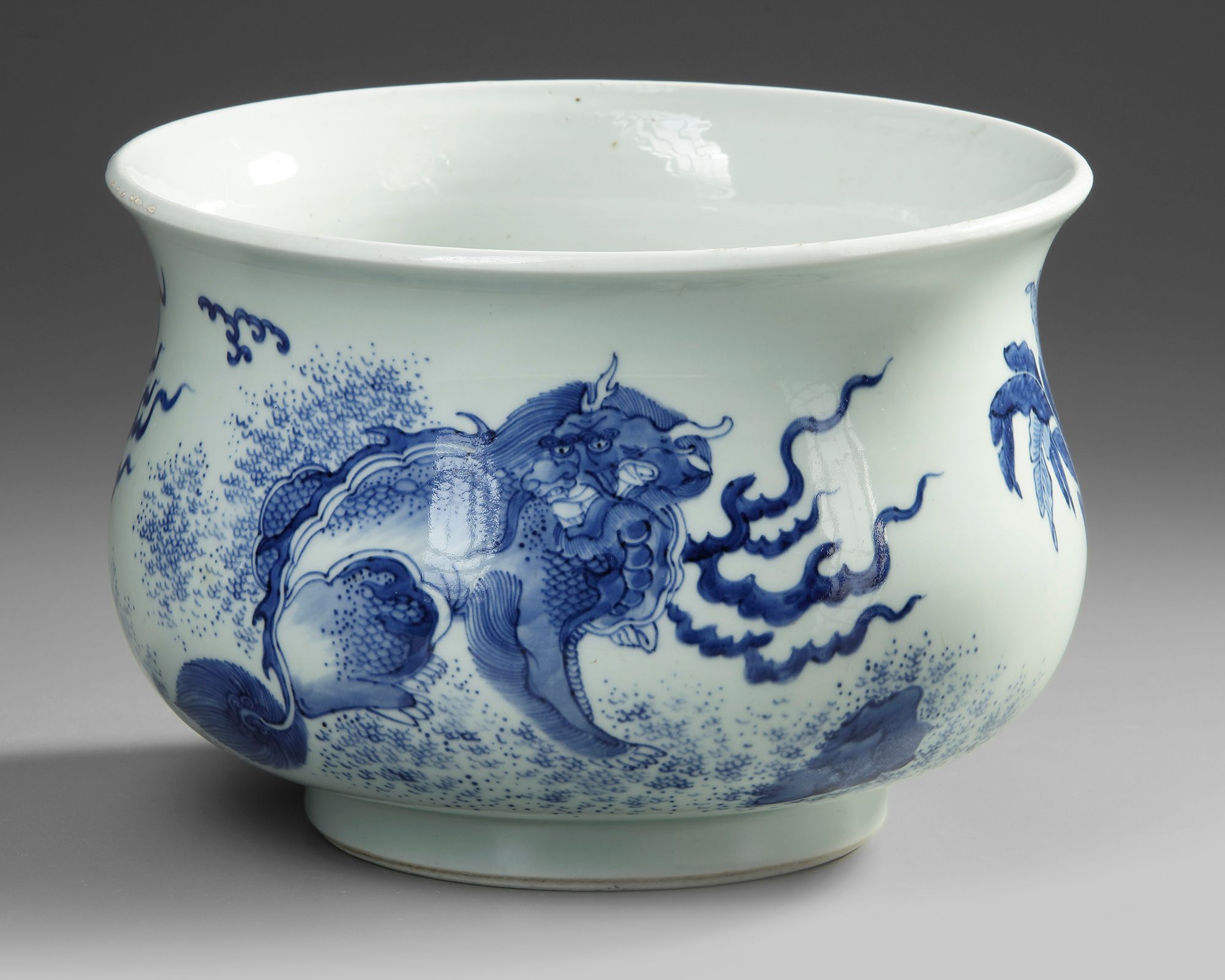 A Chinese porcelain pot with slightly everted rim, decorated in cobalt blue with two Buddhist lions. The base is unglazed.
